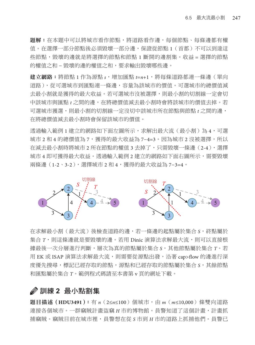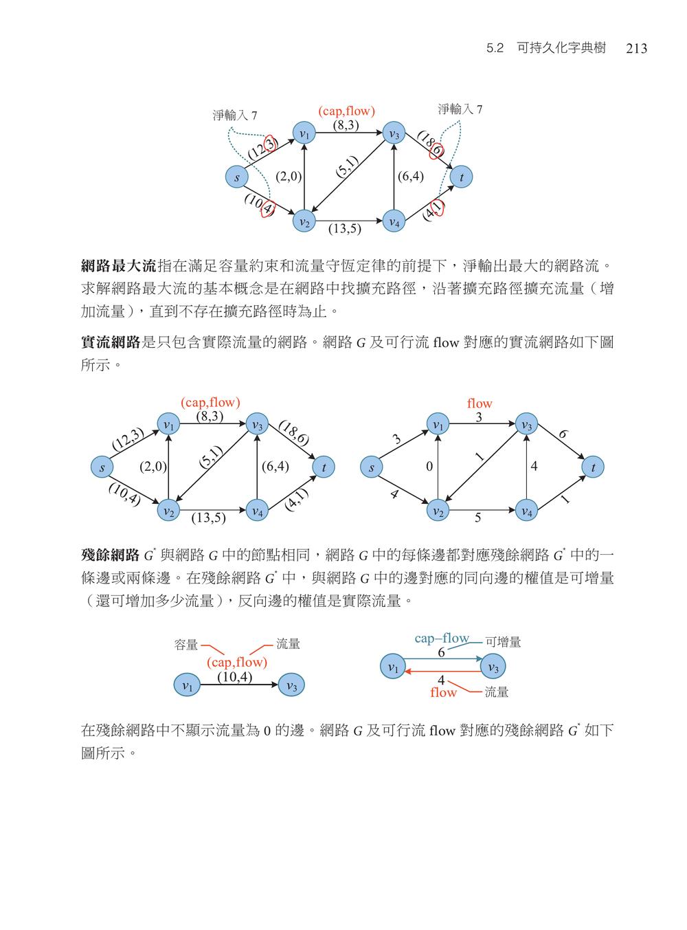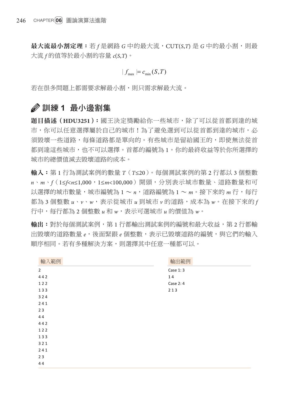 Chapter 01 資料結構進階1.1 分塊演算法1.2 跨越串列Chapter 02 字串演算法進階2.1 AC自動機2.2 後綴陣列Chapter 03 樹的操作3.1 重輕分解3.2 重心分解3.3 邊分解Chapter 04 複雜樹4.1 KD樹4.2 左偏樹4.3 動態樹4.4 樹套樹Chapter 05 可持久化資料結構5.1 可持久化區段樹5.2 可持久化字典樹Chapter 06 圖論演算法進階6.1 EK演算法6.2 Dinic演算法6.3 ISAP演算法6.4 二分圖匹配6.5 最大流最小割6.6 最小成本最大流Chapter 07 動態規劃進階7.1 背包問題進階7.2 樹狀DP進階Chapter 08 複雜動態規劃及其最佳化8.1 DDP8.2 PDP8.3 斜率最佳化8.4 四邊不等式最佳化