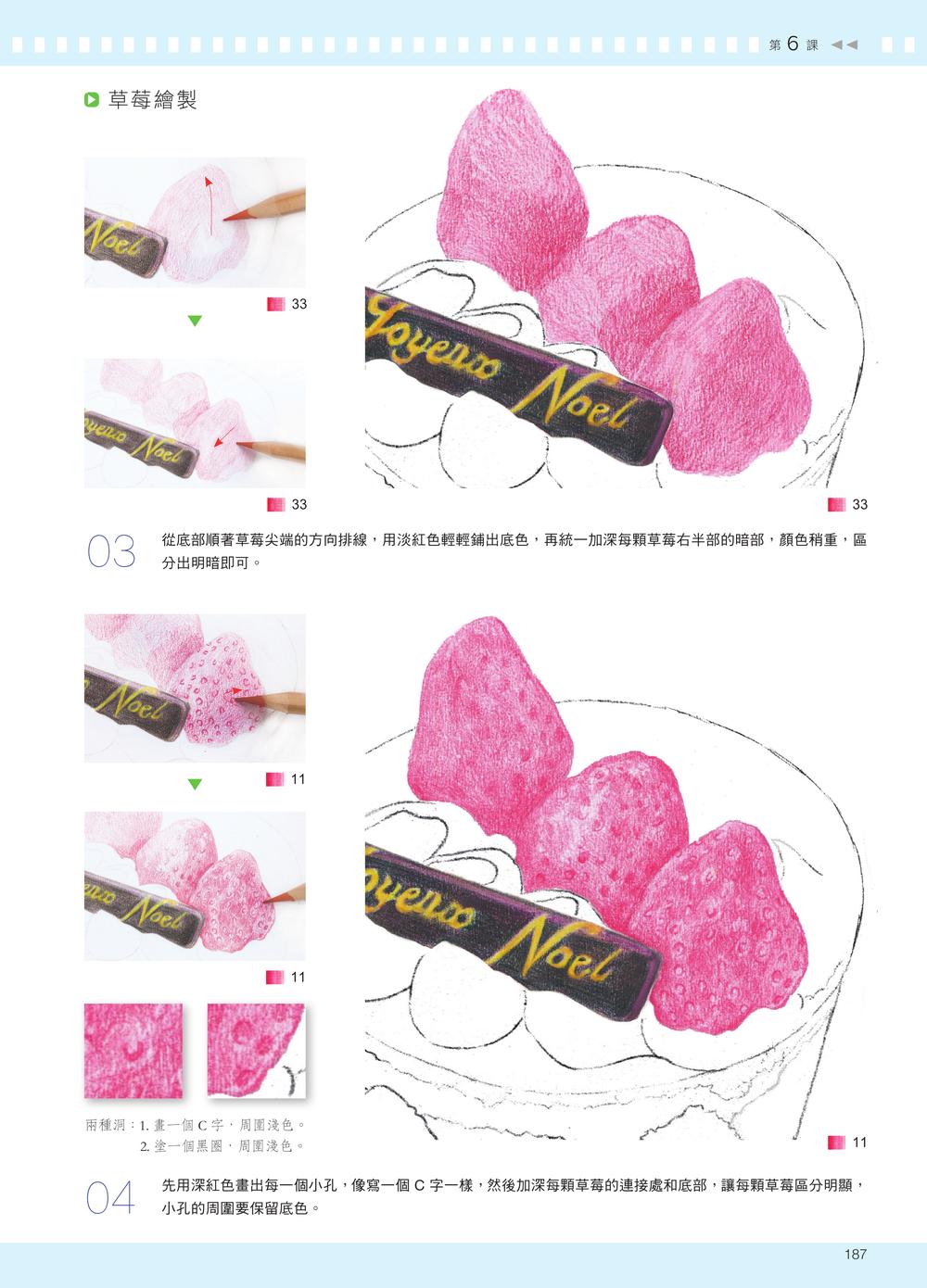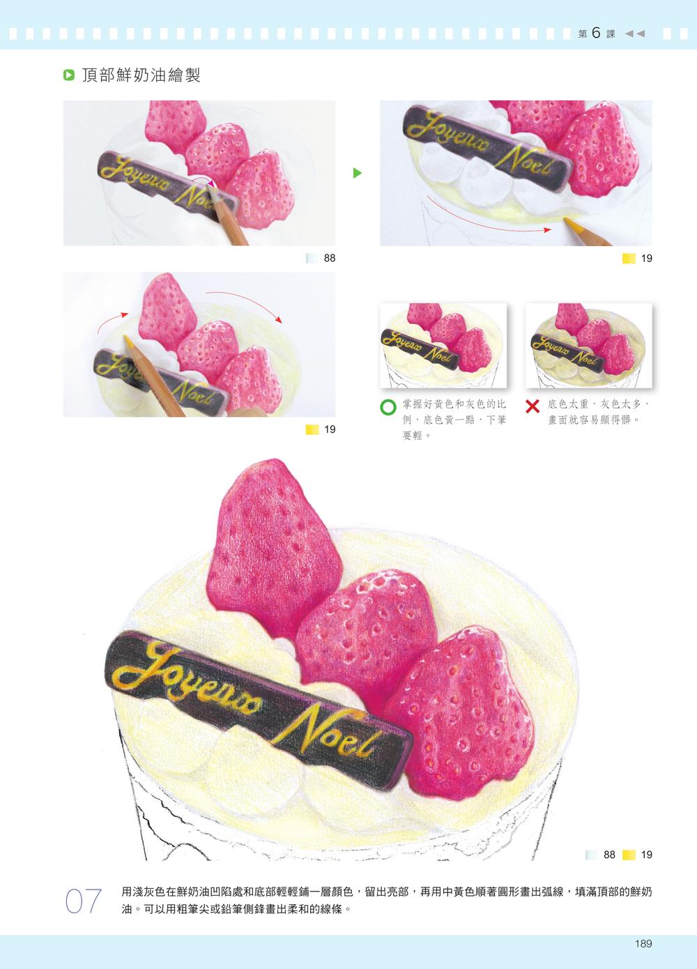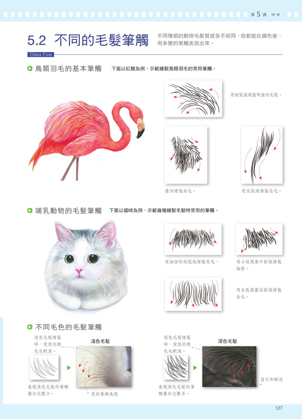 · 前言· 工具介紹· 線稿拓印法1 掌握明暗關係,3 招畫出逼真瓷器陶瓷質感的物體在色鉛筆畫中經常出現。在繪製時需要注意其材質的特點,清楚掌握陶瓷物體高光強烈、明暗交界線明顯且邊緣柔和、暗部深、反光強、表面能倒映其他物體投影的特性。1.1 一張圖看明暗關係1.2 四種線條表現陶瓷質感【紫色小碗】【海豚筷架】【青瓷茶杯】2 把光影知識融入實踐,打造真實金屬質感金屬材質的物體在色鉛筆學習中是一大難點。金屬的強烈反光、強烈的明暗對比、堅硬的質感、清晰的邊界,以及表面上其他物體清晰的投影,都是其最顯著的特點。2.1 金屬光影的最大特點2.2 金屬質感的線條組合【金屬鉚釘】【復古金屬夾】【珍珠胸針】3 捕捉陽光和影子,畫出透明質感透明質感的物體在受光照射時,會出現晶瑩剔透的光影效果。這種透亮的光影是繪製透明物體時的重點與難點。繪製透明物體時,要清楚地認識到它有清晰的高光、柔和的反光、模糊的明暗交界線,以及面積不大但清晰的暗部。3.1 如何呈現透明質感3.2 三招表現透明質感【碧璽耳環】【兒時的玻璃彈珠】【晶瑩玻璃杯】4 依照物體本身,畫出有質感的紋理在繪製紋理質感時,要注意紋理與物體本身的關係。分析紋理的走勢應從物體本身的透視開始,不可脫離物體單獨觀察紋理。紋理的透視要與物體本身的透視一致,而與物體色調相近的紋理,可以用同一色系的顏色來呈現。4.1 表面花紋的光影4.2 紋理的繪畫方法【小木勺】【鳶尾花】5 先鋪底色再畫細節,輕鬆畫出毛茸質感動物的毛髮多變,長短、軟硬、直捲各自不同,但整體來說,它們的明暗對比都沒有其他物體強烈。動物毛髮的漸層均勻柔和,根根分明,而新手常將滑順細膩的毛髮畫得雜亂粗糙,這是因為不知道如何處理毛髮質感。5.1 毛髮的光影特點5.2 不同的毛髮筆觸【可愛的小黃鴨】【紅鶴】【畫隻貓吧】6 新手也能畫得超逼真,練習更多其他質感我們在用色鉛筆繪畫時,還會遇到一些其他質感的物體,比如表面柔和的塑膠質感,或是凹凸不平的坑洞紋理質感等等。在繪製這類物體時,要先分析它們的質感特點。遇到不同的質感不用緊張,從它的特點去分析,畫起來就簡單多了。【紙鶴】白色物體的畫法【海螺蠟燭】凹凸質感的畫法【Sonny Angle】塑膠質感的畫法【鋁箔紙糖果】鋁箔紙的畫法【蛋糕點心】鮮奶油的畫法