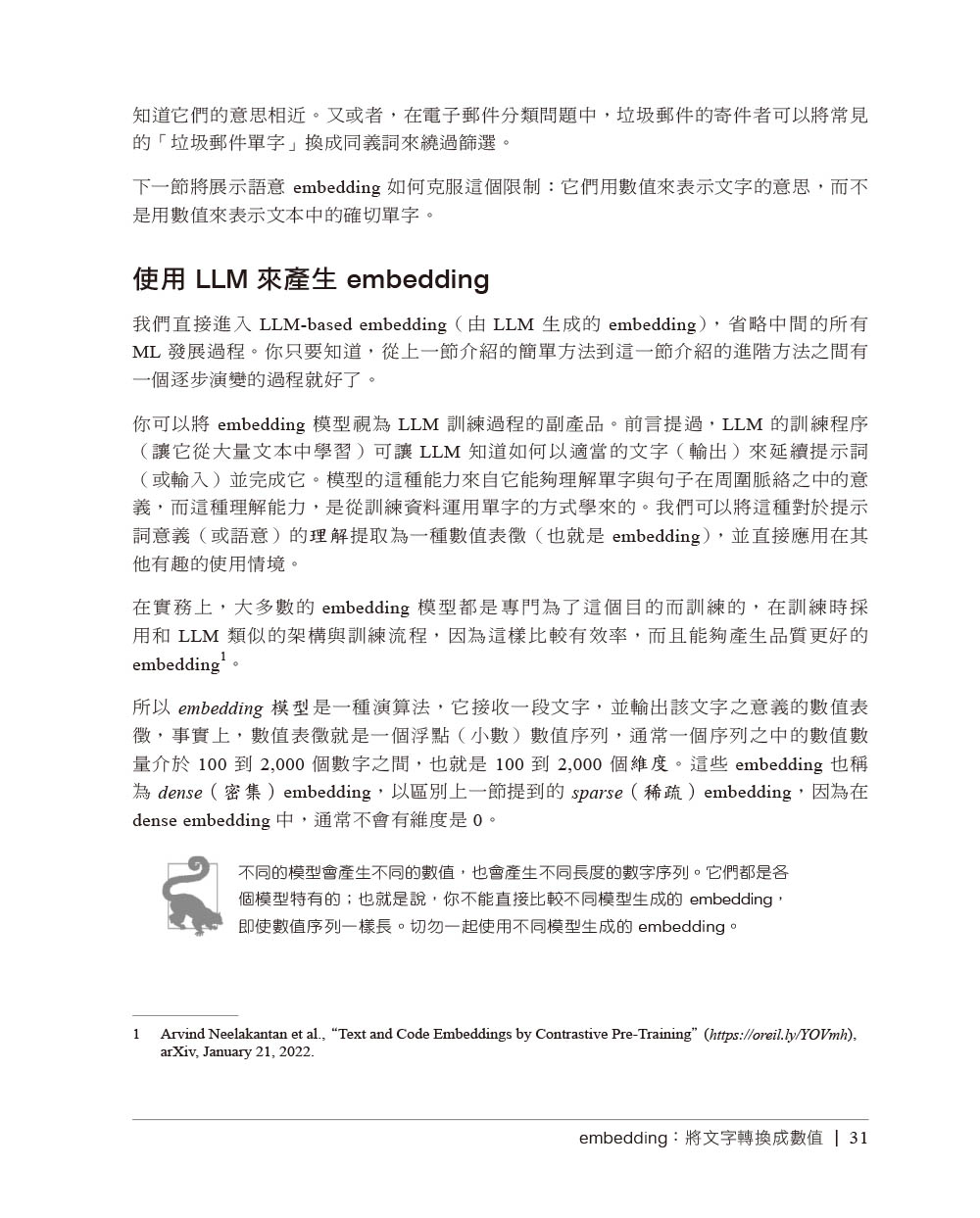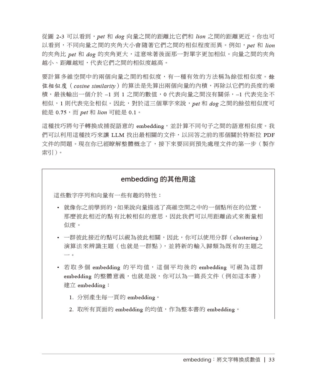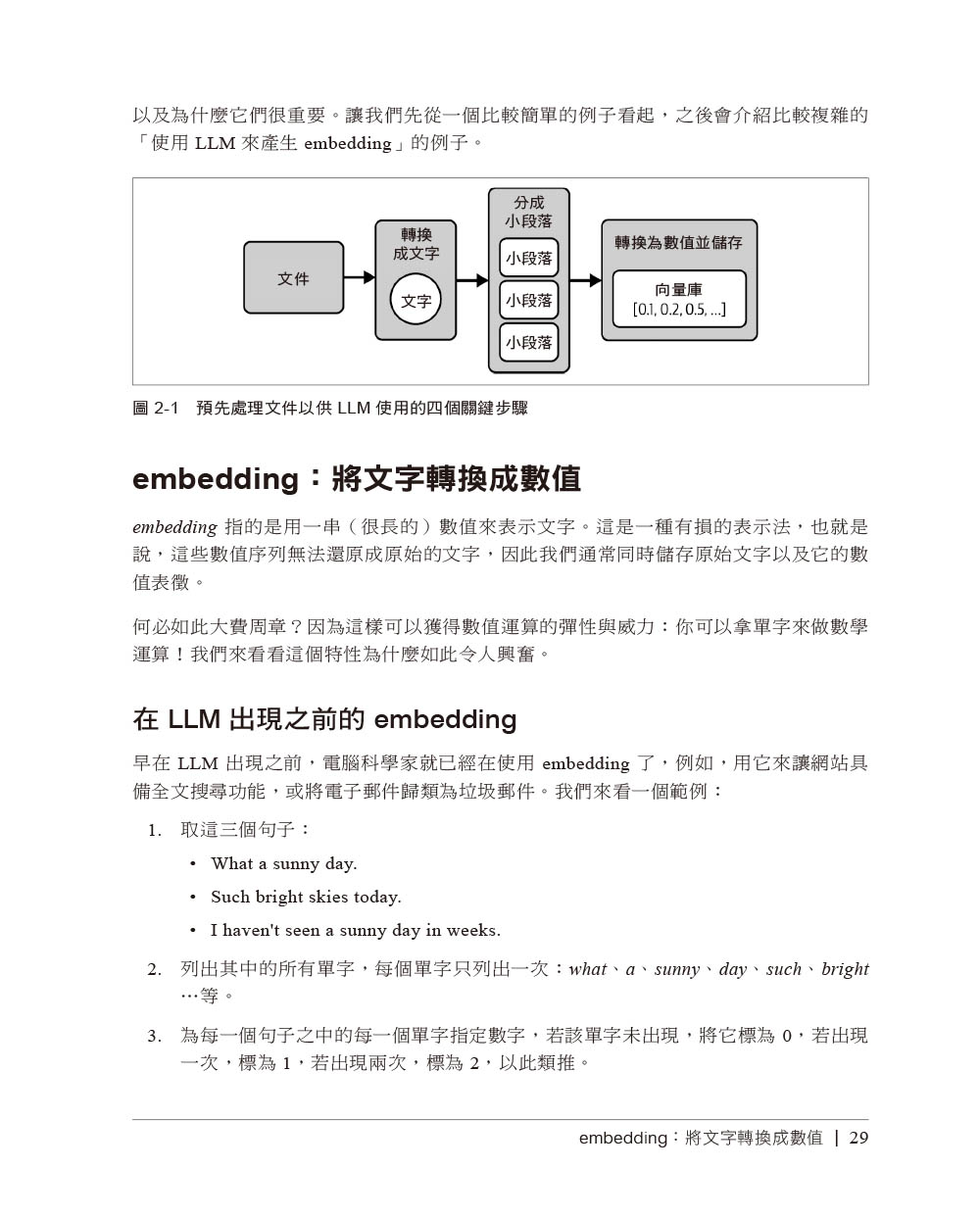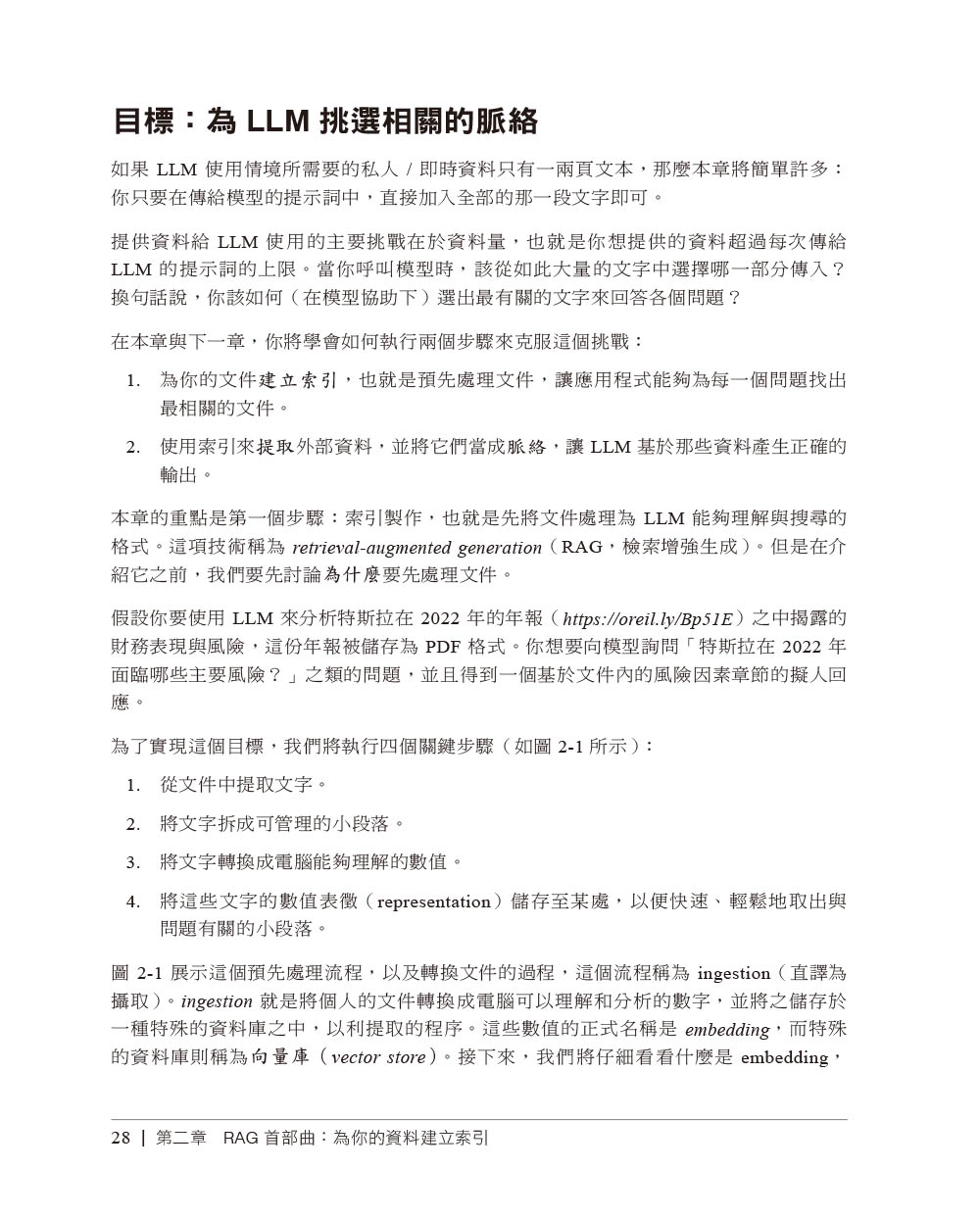 第一章 使用 LangChain 必備的 LLM 基礎知識 設置 LangChain 環境 在 LangChain 中使用 LLM 讓 LLM 的指示詞可以重複使用 從 LLM 取得特定格式的輸出 組合 LLM 應用程式的各個部分第二章 RAG 首部曲:為你的資料建立索引 目標:為 LLM 挑選相關的脈絡 embedding:將文字轉換成數值 將文件轉換成文字 將文字拆成小段落 產生文字embedding 將 embedding 存入向量庫 追蹤文件的變更 索引最佳化第三章 RAG 二部曲:與你的資料對話 Retrieval-Augmented Generation 簡介 查詢句轉換 查詢句路由 建構查詢句第四章 使用 LangGraph 來為聊天機器人加入記憶功能 建立聊天機器人記憶系統 介紹 LangGraph 建立 StateGraph 為 StateGraph 加入記憶功能 修改聊天歷史第五章 LangGraph 與認知架構 架構 #1:LLM 呼叫 架構 #2:鏈式架構 架構 #3:路由器第六章 agent 架構 Plan-Do 迴圈 建立一個 LangGraph agent 始終先呼叫某一個工具 使用大量工具第七章 Agents 第二集 反省 LangGraph 的 subgraph 多 agent 架構第八章 善用 LLM 的設計模式 結構化輸出第九章 部署:將 AI 應用程式部署到正式環境 先決條件 瞭解 LangGraph Platform API 在 LangGraph Platform 上部署 AI 應用程式 安全第十章 測試:評估、監控與持續改進 在 LLM app 開發週期中的測試技巧 設計階段:能自我修正的 RAG 預備上線階段 正式上線階段第十一章 使用 LLM 來建構應用程式 互動式聊天機器人 與 LLM 合作編輯 環境式運算(ambient computing)