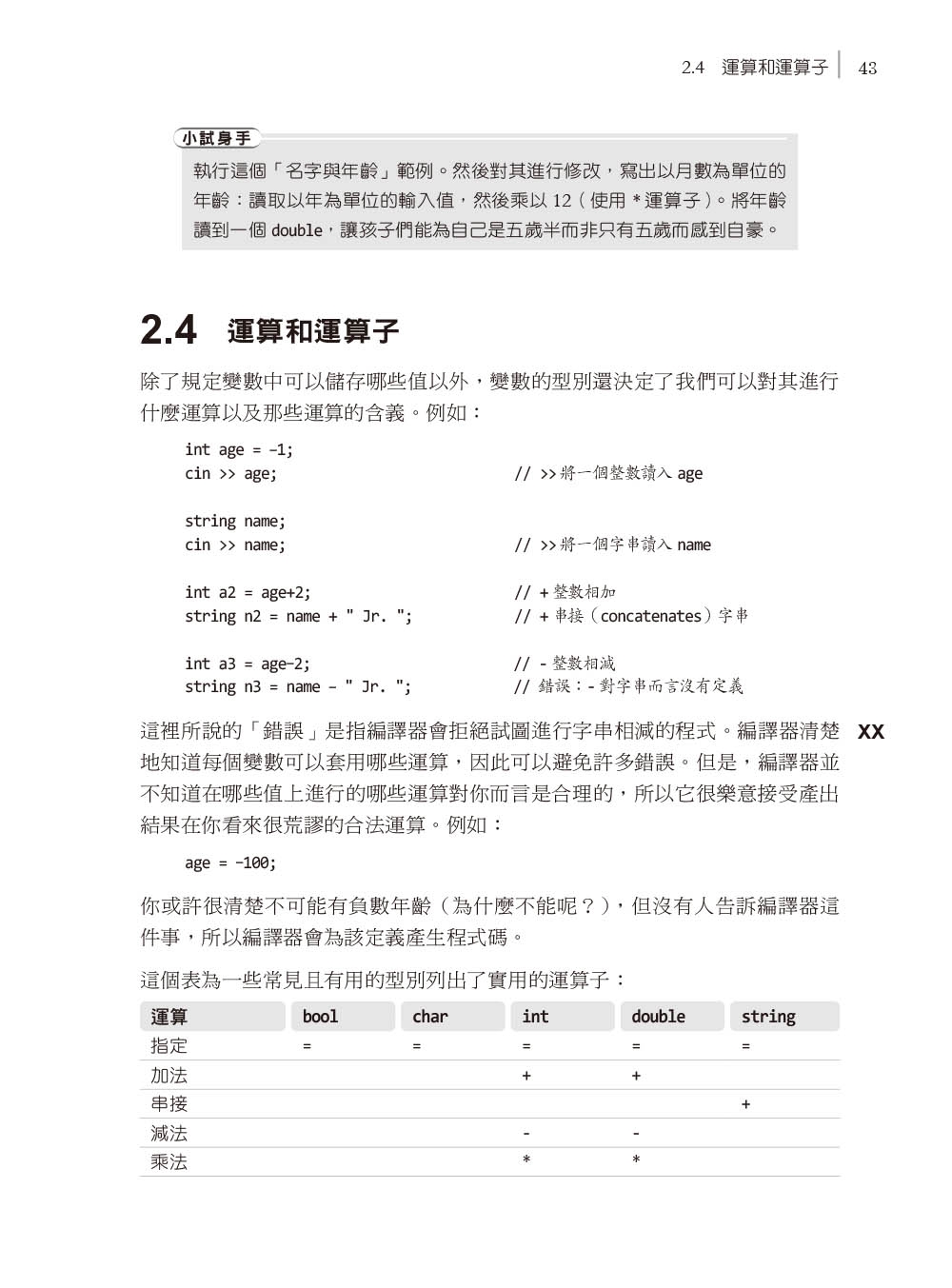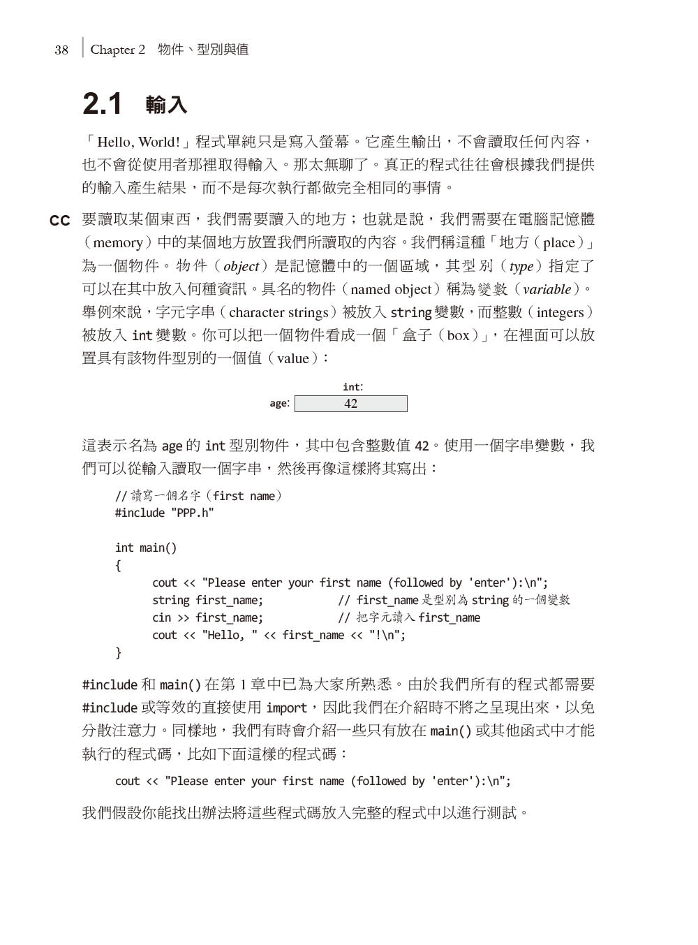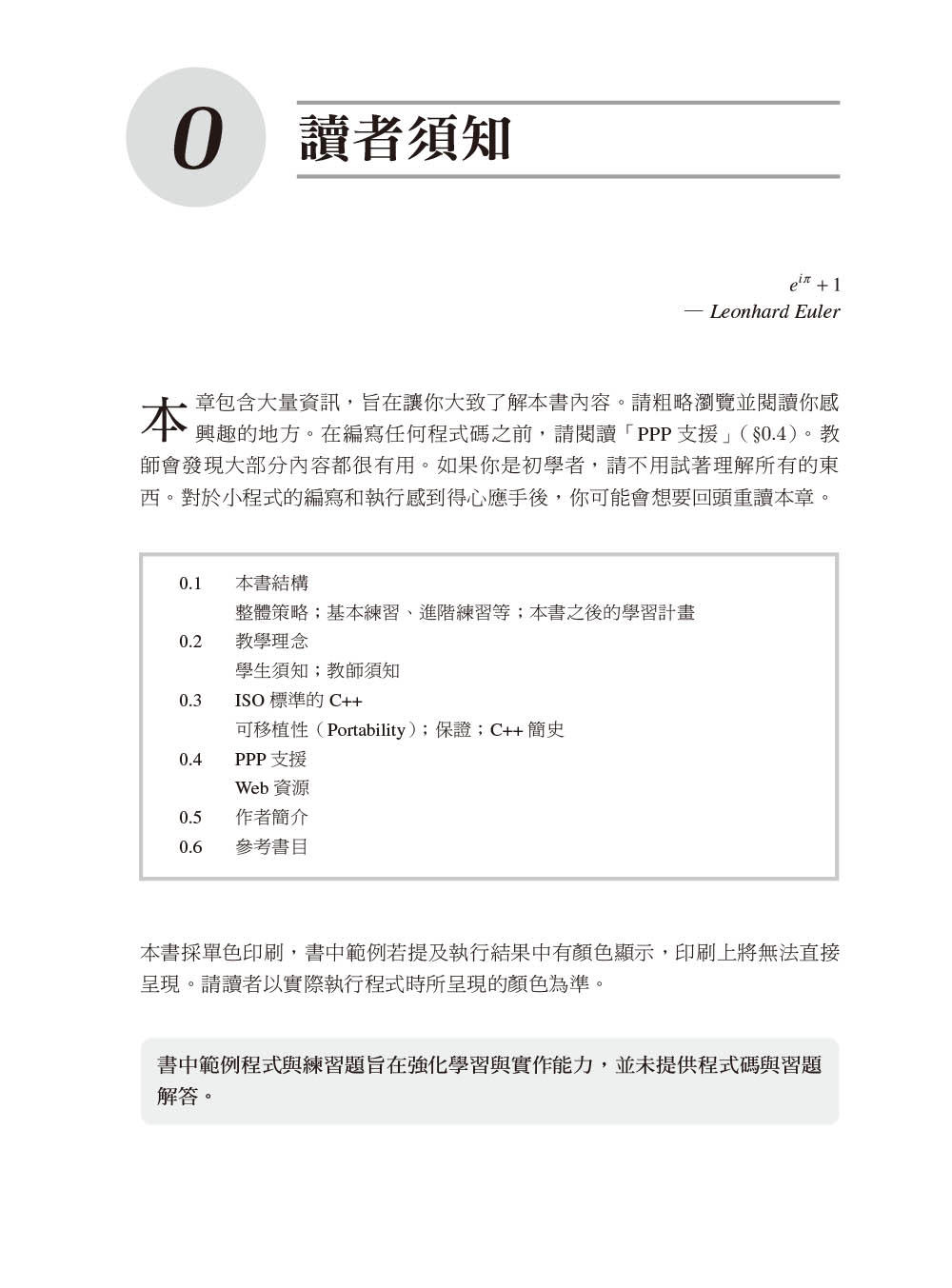 chapter 0 讀者須知 0.1 本書結構 0.2 教學理念 0.3 ISO 標準的 C++ 0.4 PPP 支援 0.5 作者簡介 0.6 參考書目【Part Ⅰ 基礎知識】chapter 1 Hello, World! 1.1 程式 1.2 經典的第一個程式 1.3 編譯 1.4 連結 1.5 程式設計環境chapter 2 物件、型別與值 2.1 輸入 2.2 變數 2.3 輸入與型別 2.4 運算和運算子 2.5 指定和初始化 2.6 名稱 2.7 型別與物件 2.8 型別安全性 2.9 轉換 2.10 型別推論:autochapter 3 計算 3.1 計算 3.2 目標與工具 3.3 運算式 3.4 述句 3.5 函式 3.6 vector 3.7 語言功能chapter 4 錯誤! 4.1 簡介 4.2 錯誤的來源 4.3 編譯時期錯誤 4.4 連結時期錯誤 4.5 執行時期錯誤 4.6 例外 4.7 避免錯誤和找出錯誤chapter 5 撰寫程式 5.1 提出問題 5.2 思考問題 5.3 回到計算器本身! 5.4 重新構思 5.5 將文法轉化為程式碼 5.6 嘗試第一個版本 5.7 嘗試第二個版本 5.8 語彙單元串流 5.9 程式結構chapter 6 完成一個程式 6.1 簡介 6.2 輸入和輸出 6.3 錯誤處理 6.4 負數 6.5 餘數:% 6.6 清理程式碼 6.7 從錯誤中復原 6.8 變數chapter 7 技術細節:函式 7.1 技術細節 7.2 宣告和定義 7.3 範疇 7.4 函式呼叫和回傳 7.5 估算順序 7.6 命名空間 7.7 模組和標頭chapter 8 技術細節:類別 8.1 使用者定義的型別 8.2 類別與成員 8.3 介面和實作 8.4 演進一個類別:Date 8.5 列舉 8.6 運算子重載 8.7 類別介面【Part II 輸入和輸出】chapter 9 輸入和輸出串流 9.1 輸入和輸出 9.2 I/O 串流模型 9.3 檔案 9.4 I/O 錯誤處理 9.5 讀取單一個值 9.6 使用者定義的輸出運算子 9.7 使用者定義的輸入運算子 9.8 標準的輸入迴圈 9.9 讀取結構化的檔案 9.10 格式化 9.11 字串串流chapter 10 顯示器模型 10.1 為什麼要做圖形處理? 10.2 一種顯示器模型 10.3 第一個範例 10.4 使用 GUI 程式庫 10.5 座標 10.6 Shape 10.7 使用 Shape 基元 10.8 讓第一個範例執行起來chapter 11 圖形類別 11.1 圖形類別概述 11.2 Point 和 Line 11.3 Lines 11.4 Color 11.5 Line_style 11.6 折線 11.7 封閉形狀 11.8 Text 11.9 Mark 11.10 Imagechapter 12 類別設計 12.1 設計原則 12.2 Shape 12.3 基礎和衍生類別 12.4 其他的 Shape 函式 12.5 物件導向程式設計的好處chapter 13 函式和資料的圖形化 13.1 簡介 13.2 簡單函式的圖形化 13.3 Function 13.4 Axis 13.5 近似 13.6 資料的圖形化chapter 14 圖形使用者介面 14.1 使用者介面的替代選擇 14.2 「Next」按鈕 14.3 簡單的視窗 14.4 Button 和其他的 Widget 14.5 範例:繪製線條 14.6 簡單的動畫 14.7 GUI 程式碼的除錯【Part III 資料和演算法】chapter 15 向量和自由儲存區 15.1 簡介 15.2 vector 的基礎知識 15.3 記憶體、位址和指標 15.4 自由儲存區和指標 15.5 解構器 15.6 存取元素 15.7 範例:串列 15.8 this 指標chapter 16 陣列、指標和參考 16.1 陣列 16.2 指標和參考 16.3 C 式字串 16.4 指標的替代方案 16.5 範例:迴文chapter 17 基本運算 17.1 簡介 17.2 存取元素 17.3 串列初始化 17.4 拷貝與移動 17.5 基本運算 17.6 其他實用的運算 17.7 剩餘的 Vector 問題 17.8 改變大小 17.9 我們目前的 Vectorchapter 18 樣板和例外 18.1 樣板 18.2 一般化 Vector 18.3 範圍檢查和例外 18.4 資源和例外 18.5 資源管理指標chapter 19 容器和迭代器 19.1 儲存和處理資料 19.2 序列和迭代器 19.3 連結串列 19.4 再次一般化 Vector 19.5 範例:簡單的文字編輯器 19.6 vector、list 和 stringchapter 20 映射與集合 20.1 關聯式容器 20.2 map 20.3 unordered_map 20.4 計時 20.5 set 20.6 容器概述 20.7 範圍與迭代器chapter 21 演算法 21.1 標準程式庫演算法 21.2 函式物件 21.3 數值演算法 21.4 拷貝 21.5 排序與搜尋索引