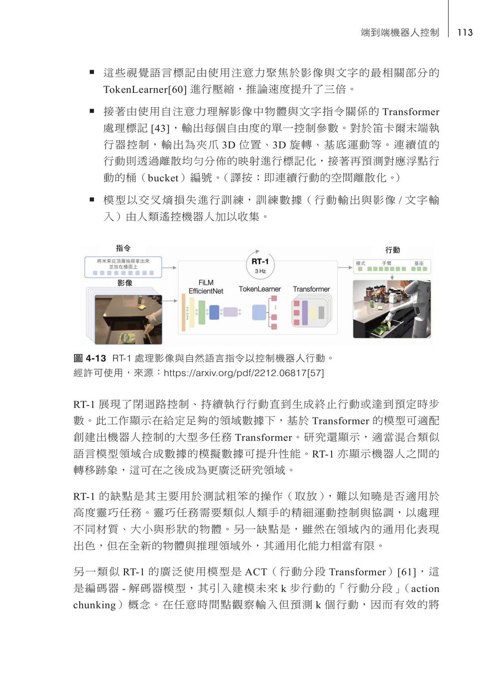 第一章:通用機器人導論機器人系統常見機器人類型 機器人設計常見概念機器人深度學習深度學習框架機器人學習框架與目標邁向體現通用智慧總結參考文獻第二章:機器人感知:感測器與影像處理感測器感知問題卷積神經網路概論感知CNNResNetEfficientNet單階段偵測器模型比較感知的 Transformer總結參考文獻第三章:機器人感知:3D 數據與感測器融合3D 數據處理多模態感知與感測器融合總結參考文獻第四章:機器人基礎模型大型基礎模型語言作為機器人的連結組織端到端機器人控制從影片示範學習機器人 AI 安全總結參考文獻第五章:模擬機器人模擬機器人模擬器組成Sim2Real 概念縮小 RL 到 Sim2Real 的差距從模擬中學習總結參考文獻第六章:勘測、定位與導航為何使用深度學習?傳統移動機器人設置 勘測定位導航總結參考文獻第七章:強化學習與控制強化學習基礎無模型與基於模型的 RL離線強化學習應用與挑戰機器人的 RL 挑戰機器人的 RL 湧現趨勢結論總結參考文獻第八章:自駕車經濟機遇系統設計感知預測規劃安全總結參考文獻第九章:工業機器人常見任務常見機器人市場機遇取放機器人系統設計安全考量總結參考文獻第十章:人形機器人人形機器人案例替代方法人形機器人市場人形機器人建構結論總結參考文獻第十一章:數據驅動機器人實務機器人營運數據基礎設施訓練與部署基礎設施機器人數據飛輪大規模機器人數據收集未來解方參考文獻