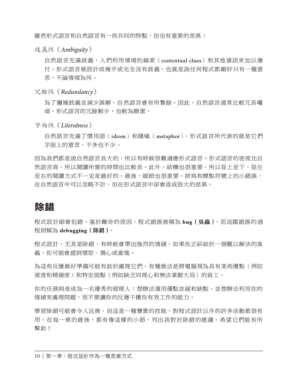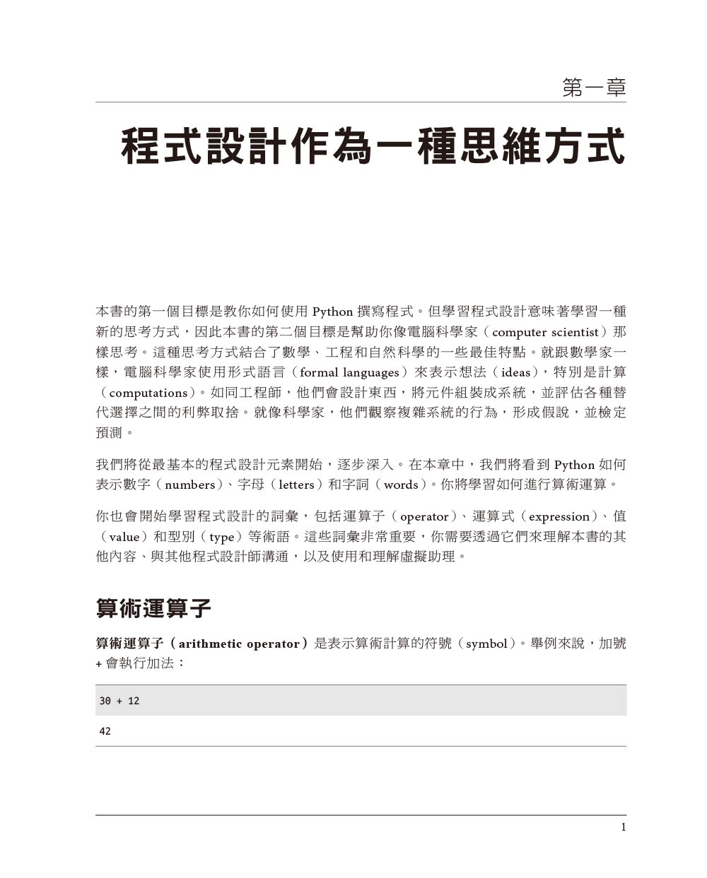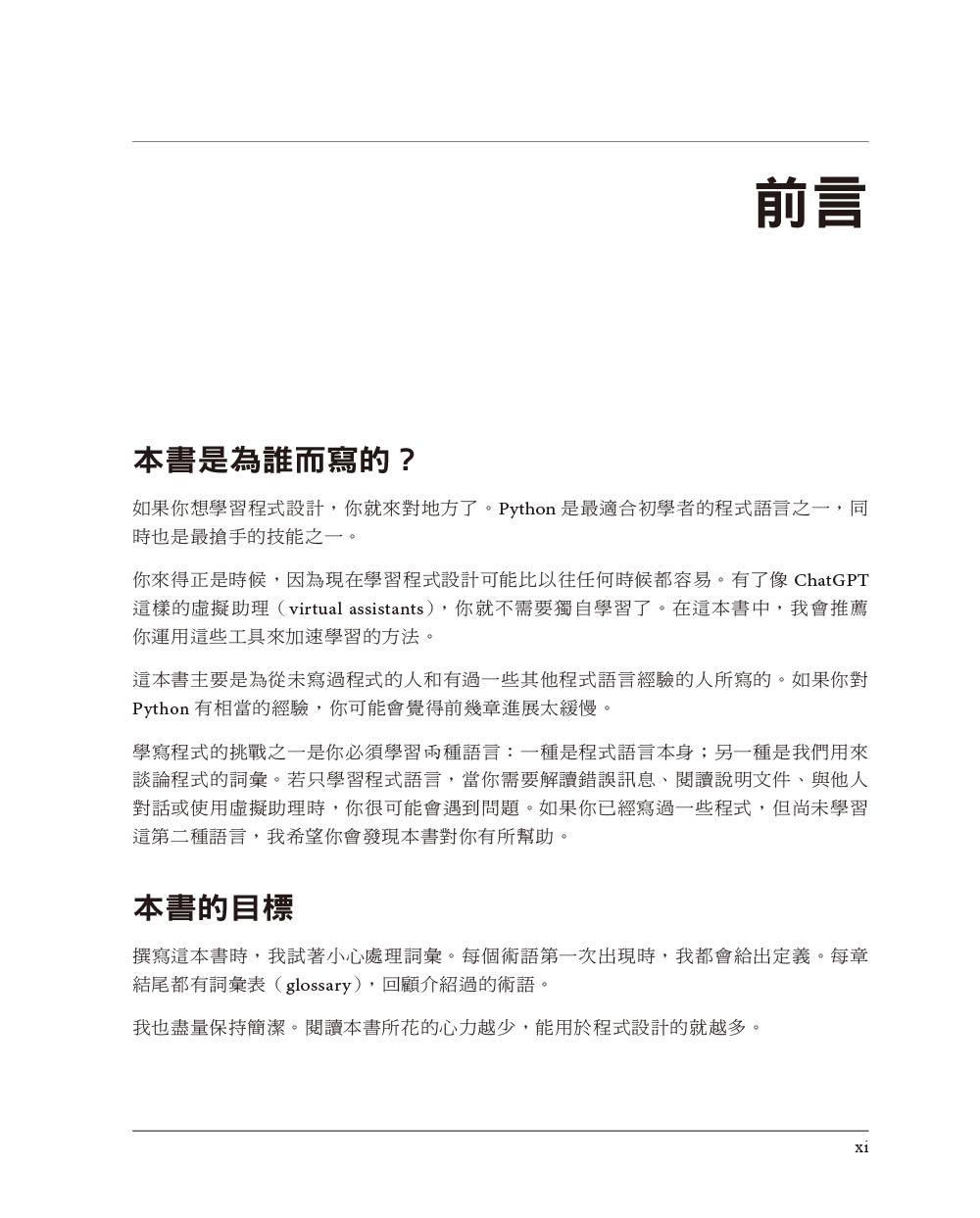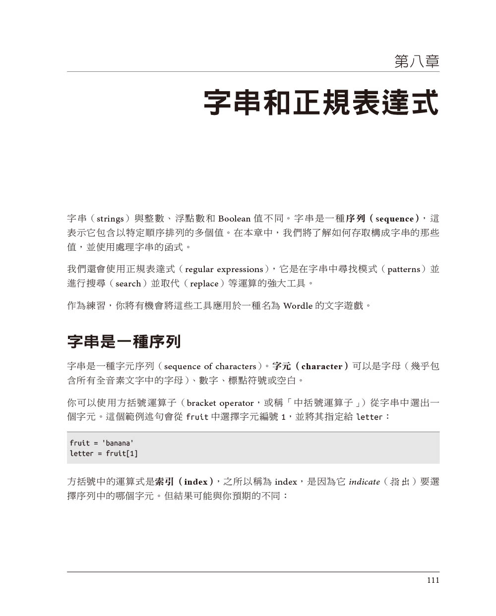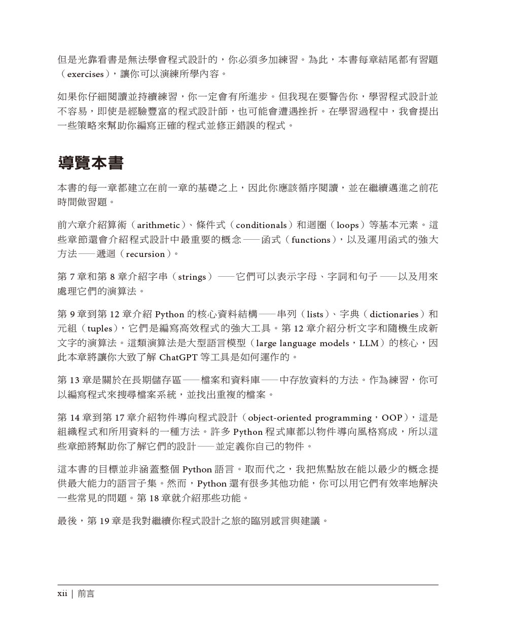 前言 chapter 01 程式設計作為一種思維方式chapter 02 變數和述句chapter 03 函式chapter 04 函式與介面chapter 05 條件式與遞迴chapter 06 回傳值chapter 07 迭代和搜尋chapter 08 字串和正規表達式chapter 09 串列chapter 10 字典chapter 11 元組chapter 12 文字的分析與生成chapter 13 檔案和資料庫chapter 14 類別與函式chapter 15 類別與方法chapter 16 類別與物件chapter 17 繼承chapter 18 Python Extraschapter 19 結語索引