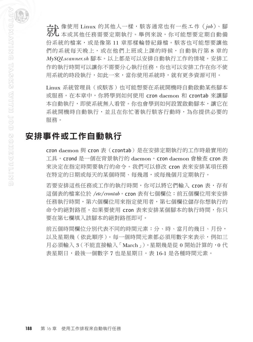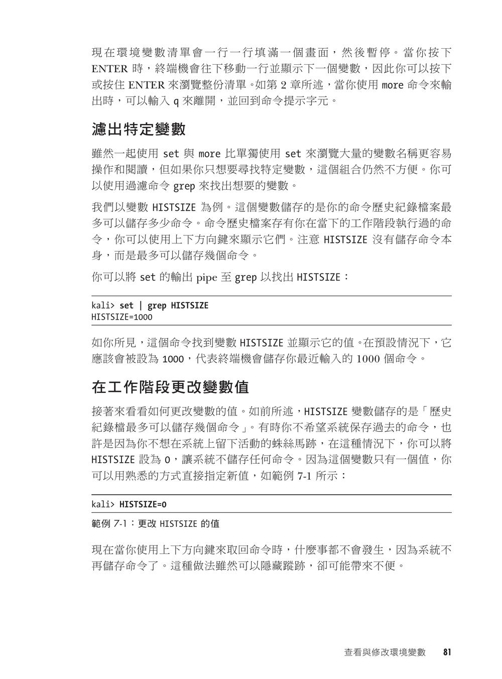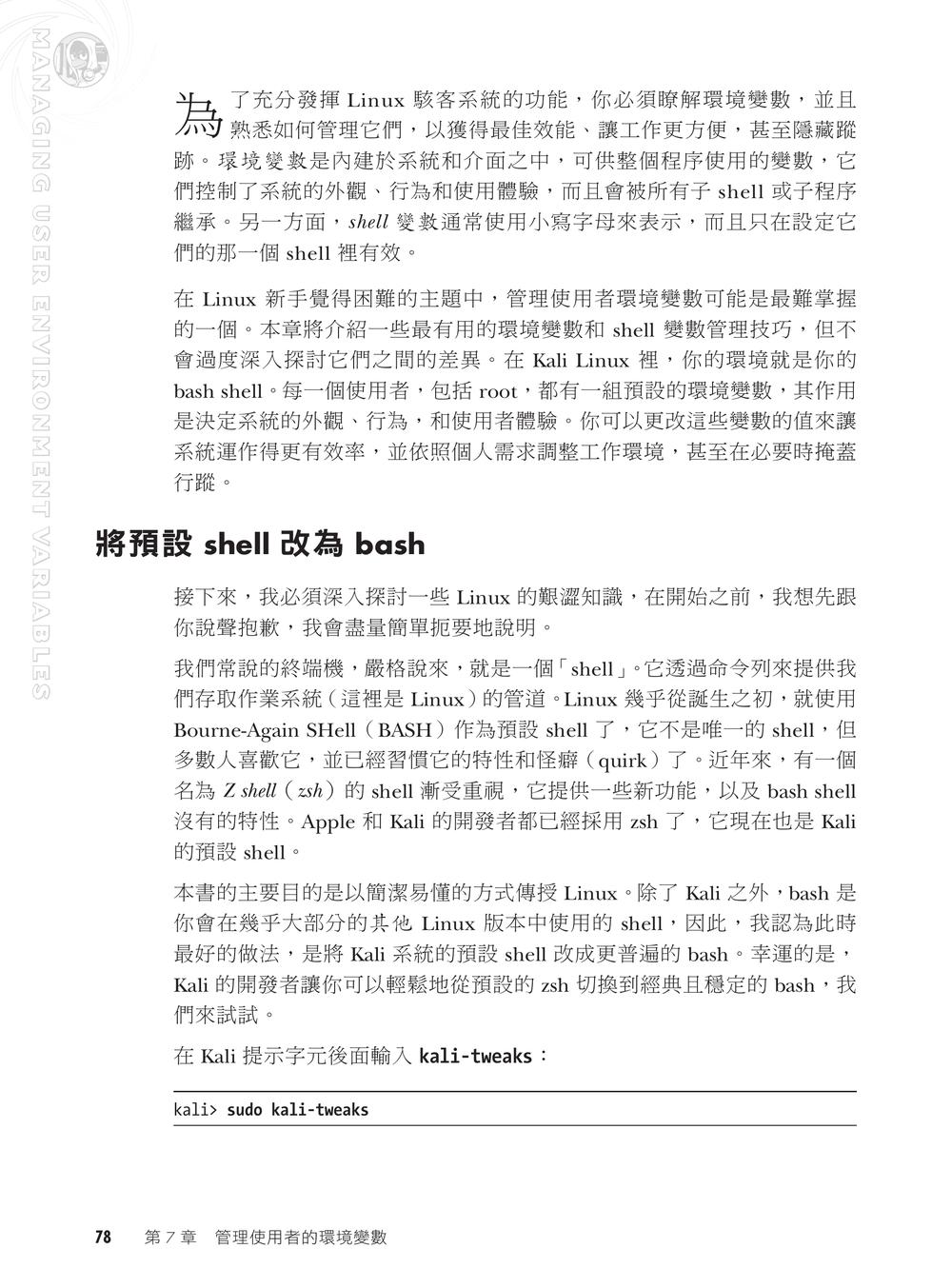 前言致謝序章 本書內容介紹 什麼是道德駭客攻擊? 為什麼駭客使用 Linux? 下載 Kali Linux 虛擬機器 設定你的虛擬機器 設定 Kali 透過 Windows Subsystem for Linux 安裝 Kali第1章 千里之行,始於足下 入門術語與概念 Kali 導覽 Linux 的基本命令 找東西 修改檔案和目錄 開始把玩! Exercises第2章 文字操作 查看檔案 使用 grep 來過濾文字 使用 sed 來尋找文字與取代文字 使用 more 和 less 來查看檔案 總結 Exercises第3章 分析與管理網路 使用 ifconfig 來分析網路 使用 netstat 和 ss 來查看網路統計數據 使用 iwconfig 來檢查無線網路設備 更改你的網路資訊 操作網域名稱系統 總結 Exercises第4章 新增與移除軟體 使用 apt 來管理軟體 將套件庫加入你的 sources.list 檔案 使用 GUI 安裝工具 使用 git 來安裝軟體 總結 Exercises第5章 控制檔案和目錄的權限 不同類型的使用者 授予權限 檢查權限 變更權限 使用遮罩來設定更安全的預設權限 特殊權限 總結 Exercises第6章 程序管理 查看程序 管理程序 安排程序的執行時間 總結 Exercises第7章 管理使用者的環境變數 將預設 shell 改為 bash 查看與修改環境變數 變更你的 shell 提示字元 變更你的 PATH 建立自訂變數 總結 Exercises第8章 撰寫 bash 腳本 bash 快速入門 你的第一個腳本:「Hello, Hackers-Arise!」 你的第一個駭客腳本:掃描開放的連接埠 常用的內建 Bash 命令 總結 Exercises第9章 壓縮與封存 什麼是壓縮? 將檔案打包成 tar 壓縮檔案 為儲存設備建立逐位元複本或實體複本 總結 Exercises第10章 管理檔案系統與儲存設備 設備目錄 /dev 掛載與卸除 監視檔案系統 總結 Exercises第11章 記錄(logging)系統 journalctl 工具 紀錄的優先權與設施 journalctl 查詢 利用 journalctl 來掩蓋你的蹤跡 關閉記錄功能 總結 Exercises第12章 使用和惡意利用服務 啟動、停止和重新啟動服務 使用 Apache 網頁伺服器來建立 HTTP 伺服器 OpenSSH 與 Raspberry Spy Pi 從 MySQL/MariaDB 中擷取資訊 總結 Exercises第13章 安全與匿名 網際網路如何洩漏我們的資訊 The Onion Router 系統 proxy(代理伺服器) 虛擬私人網路(VPN) 加密電子郵件 總結 Exercises第14章 瞭解與檢查無線網路 Wi-Fi 網路 使用 aircrack-ng 進行 Wi-Fi 偵察 偵測與連接藍牙 總結 Exercises第15章 管理 Linux 的 kernel 與可載入的 kernel 模組 什麼是 kernel 模組? 檢查 kernel 版本 使用 sysctl 來微調 kernel 管理 kernel 模組 總結 Exercises第16章 使用工作排程來自動執行任務 安排事件或工作自動執行 使用 rc 腳本,在開機時執行工作 使用 GUI 來讓服務在開機時自動執行 總結 Exercises第17章 寫給駭客的Python 腳本設計入門 新增 Python 模組 開始撰寫 Python 腳本 串列 模組 物件導向程式設計(OOP) 在 Python 中的網路通訊 字典、控制陳述式,與迴圈 改進我們的駭客腳本 例外處理與密碼破解器 總結 Exercises第18章 寫給駭客的人工智慧知識 協作是關鍵所在 AI 領域的主要玩家 在資安中使用 AI 利用 AI 執行社交工程攻擊 使用 AI 來撰寫 Bash 腳本 總結 Exercises