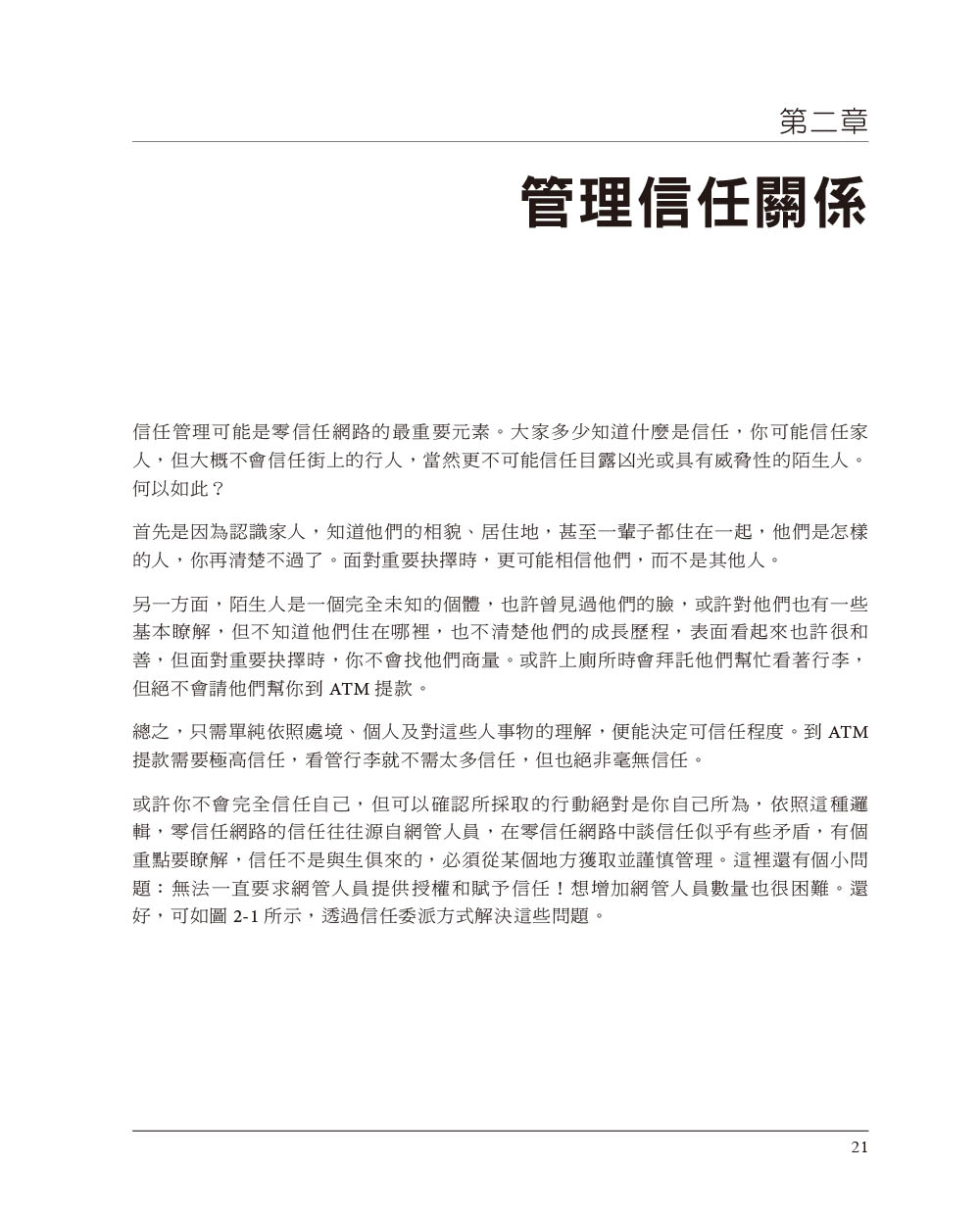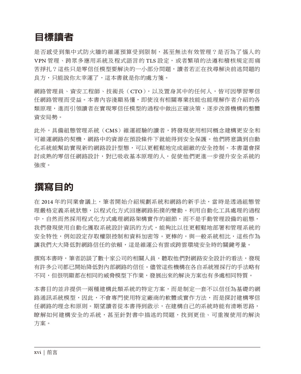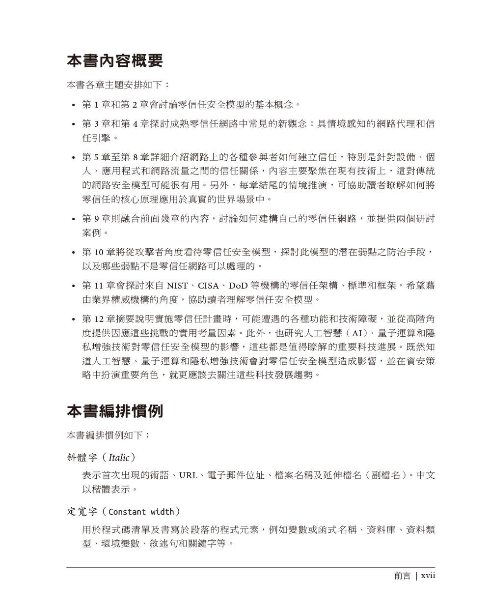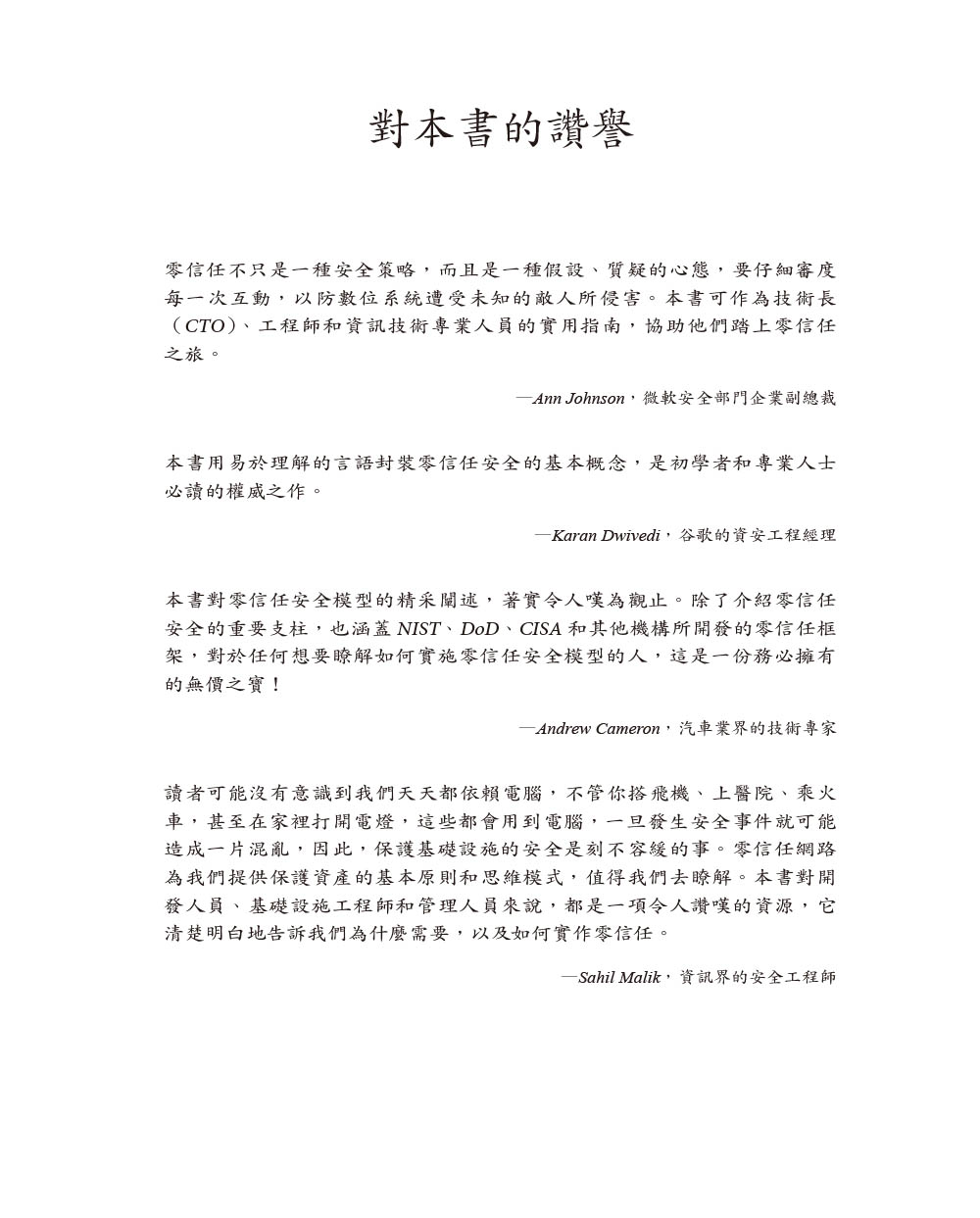前言翻譯風格說明第一章 零信任的基礎概念關於零信任網路邊界安全模型的演進威脅形態的演變邊界安全模型的缺點信任在哪裡利用自動化推動零信任網路邊界安全模型和零信任模型的比較應用於雲端環境零信任在國家資安所扮演的角色 重點回顧第二章 管理信任關係威脅模型高強度的身分驗證機制身分驗證式的信任最小權限重點回顧第三章 情境感知代理員關於代理員如何公開代理資訊重點回顧第四章 執行授權決策授權系統的架構政策執行組件政策引擎信任引擎資料儲存系統情境推演重點回顧第五章 對設備的信任初導入設備的信任利用控制平面來驗證設備資產管理評量及更新設備的信任度軟體組態管理利用設備資料進行使用者授權信任信號情境推演重點回顧第六章 對使用者的信任權威的身分管理機構私有系統的使用者身分初始化保存身分證明身分驗證時機驗證身分的方法帶外的身分驗證群組式的認證和授權積極參與、主動回報信任信號情境推演重點回顧第七章 對應用程式的信任應用程式的發展管線信任原始碼信任建構系統信任軟體分發人工在發行流程的角色信任軟體執行個體執行期的安全性安全軟體發展生命週期(SSDLC)保護應用程式和資料隱私情境推演重點回顧第八章 對網路流量的信任加密與身分驗證不加密難保真實性起始封包的信任問題零信任在網路模型的位置 通訊協定信任雲端流量的挑戰與考量CASB和同盟身分識別模式封包過濾情境推演重點回顧第九章 實現零信任網路朝向零信任網路的第一步:瞭解當前網路實作階段:應用程式的身分驗證和授權案例研討案例一:Google BeyondCorp案例二:PagerDuty的雲端無關網路重點回顧第十章 駭客眼中的零信任網路潛在的陷阱與危機攻擊向量身分識別及存取權網路和基礎設施網路保險的功用重點回顧第十一章 零信任的架構標準、框架和指南政府機關私營和公共機構商業廠商重點回顧 第十二章 未來之路及挑戰常見的挑戰技術進步的影響重點回顧 附錄A 網路模型概述索引