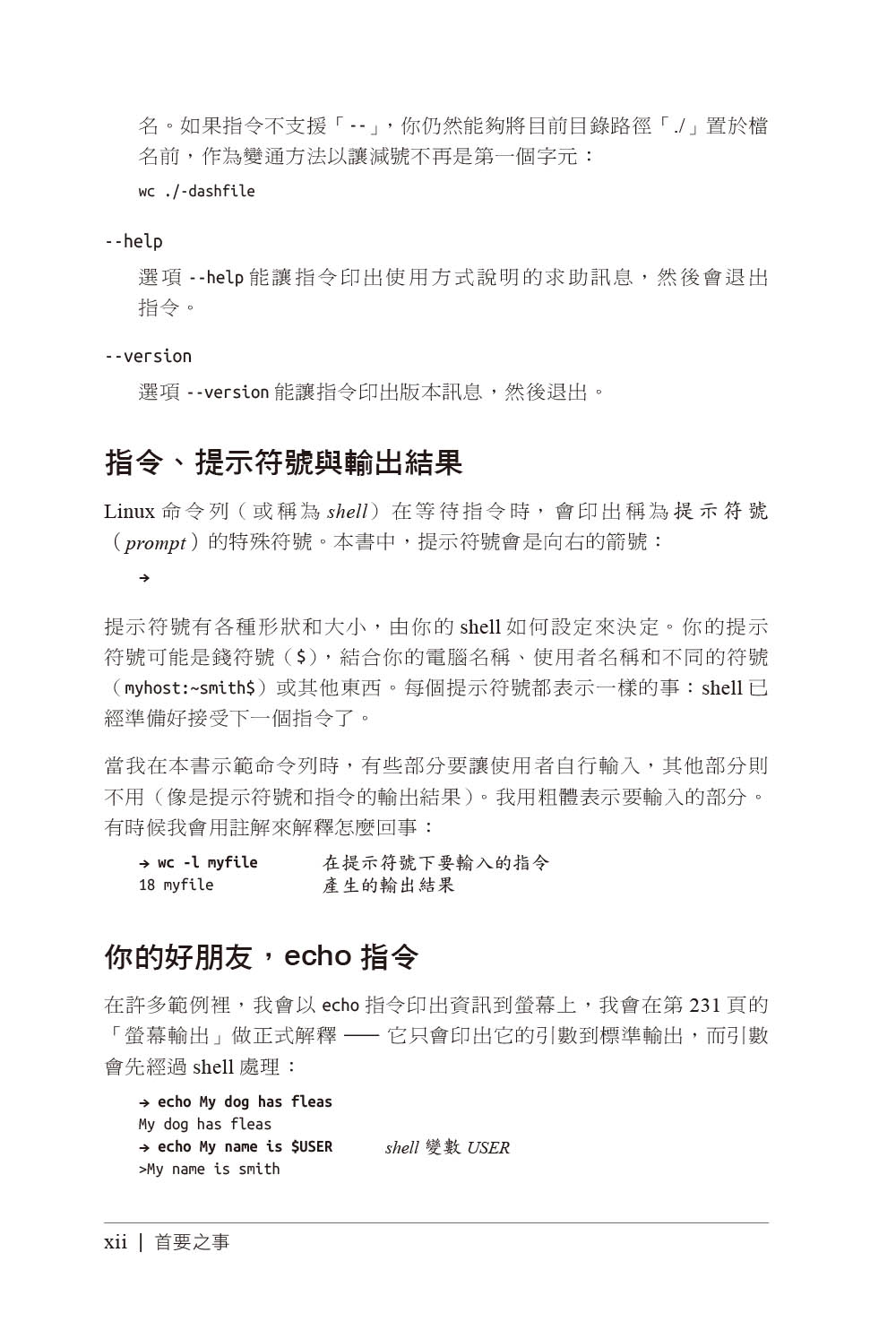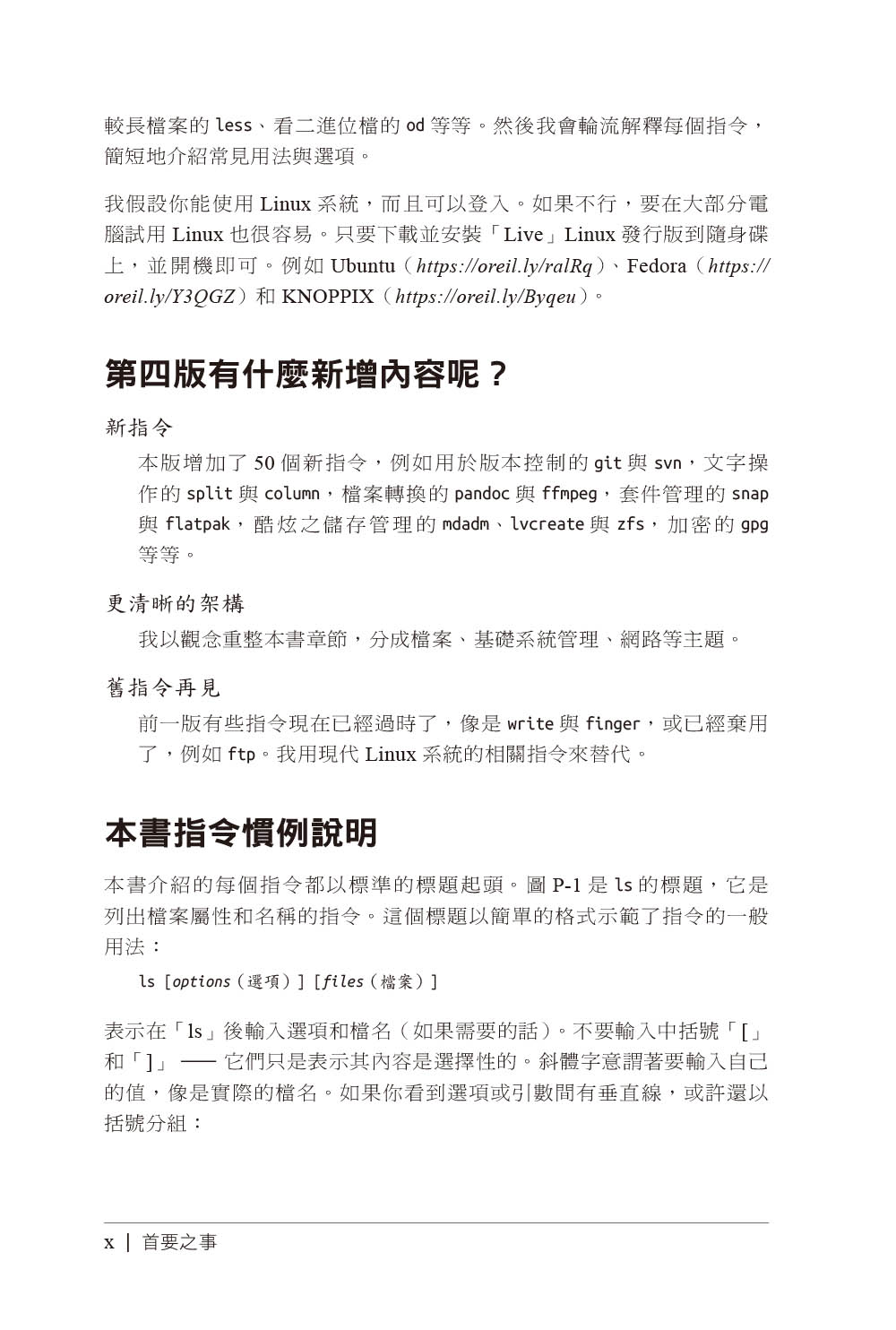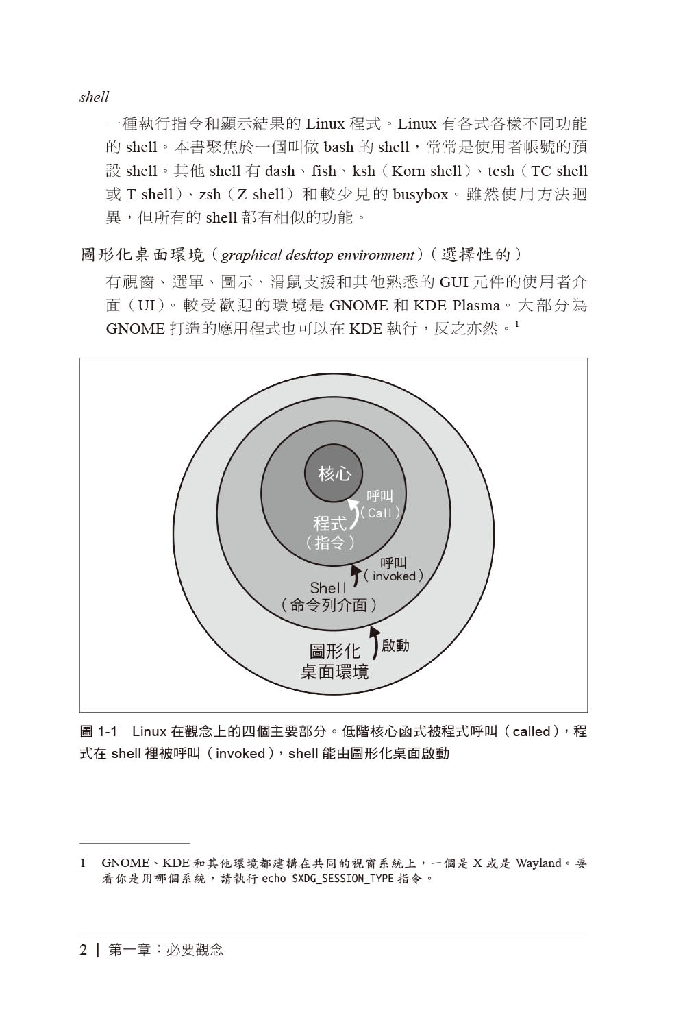 第一章 必要觀念 什麼是Linux?指令的結構 使用者與超級使用者 檔案系統Bash的精選功能尋求協助第二章 檔案指令 基本檔案操作 目錄操作 檢視檔案 建立和編輯檔案 檔案屬性 定位檔案 操作檔案文字壓縮、打包和加密比較檔案轉換檔案至其他格式 處理PDF與 PostScript檔 列印 拼字檢查第三章 系統管理基礎 成為超級使用者 查看行程控制行程排程工作登入、登出和關機 使用者及其環境 使用者帳號管理群組管理安裝軟體套件從原始碼安裝軟體第四章 檔案系統維護 使用磁碟與檔案系統 建立與修改檔案系統 容錯用的RAID陣列 靈活儲存的邏輯磁區 ZFS:現代、全能的檔案系統 備份與遠端儲存]第五章 網路指令 主機資訊 主機位置 網路連線日常Email使用郵件伺服器網頁瀏覽第六章 把事情搞定螢幕輸出 複製貼上 數學與計算 日期與時間版本控制 Containers(容器) 顯示及處理影像 聲音與影片以Shell Scripts寫程式 結語