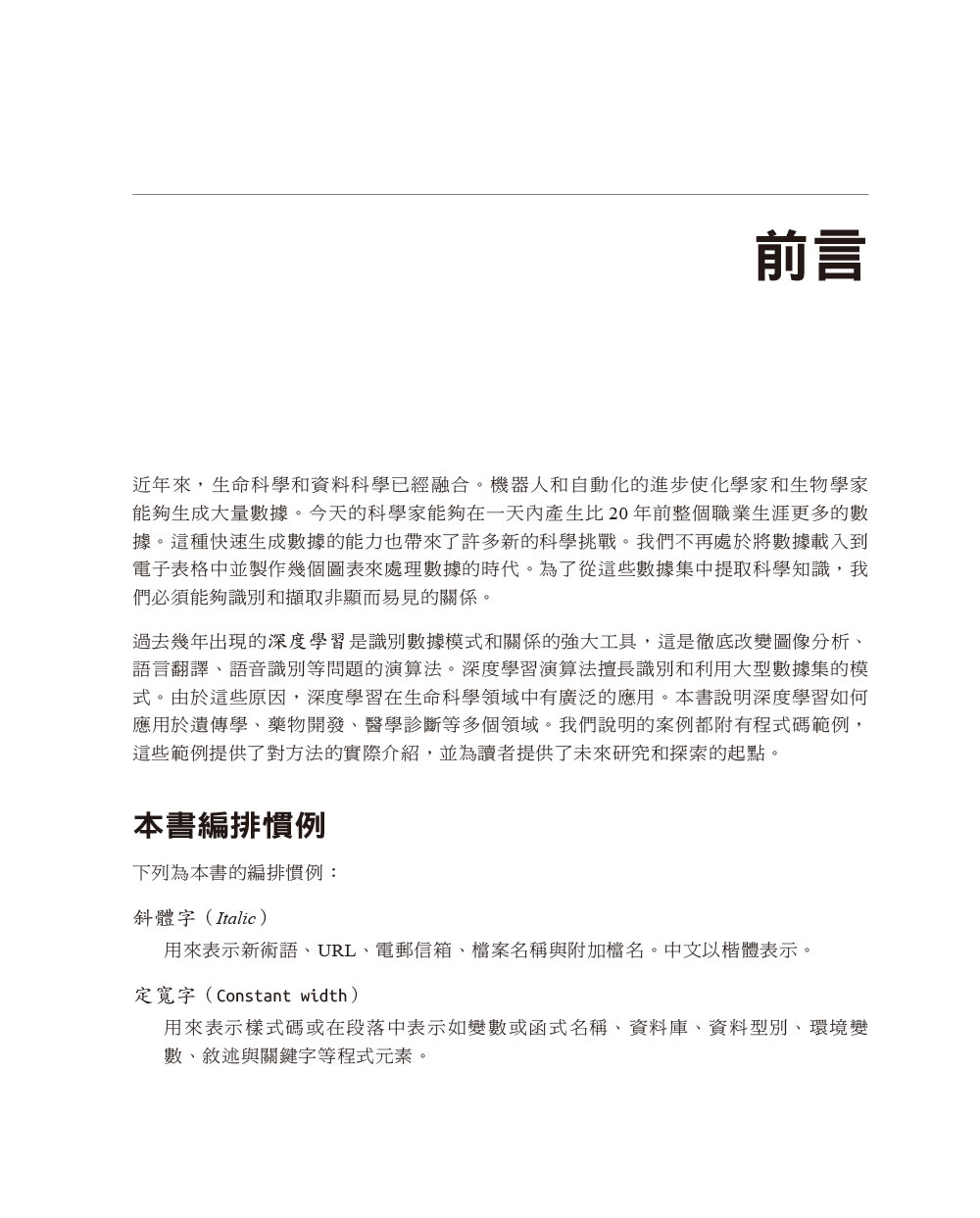 第1章 為何是生命科學?第2章 深度學習介紹第3章 DeepChem 機器學習第4章 分子的機器學習第5章 生物物理的機器學習第6章 基因組學的深度學習第7章 顯微鏡學的機器學習第8章 藥物開發的深度學習第9章 生成模型第10章 深度模型的解釋第11章 虛擬篩選流程範例第12章 前景與展望索引