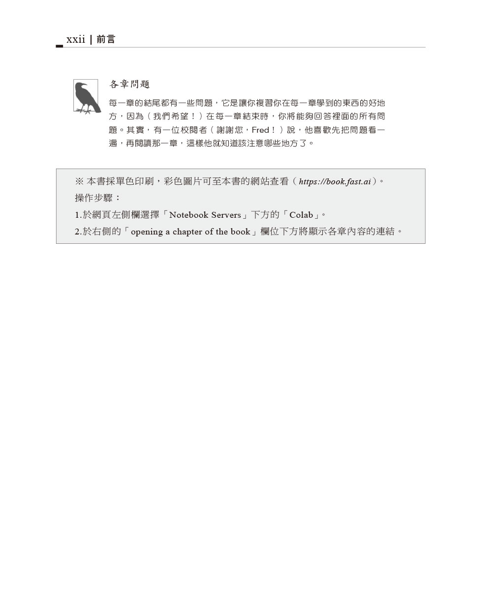 第一部分 深度學習實務第一章 你的深度學習旅程第二章 從模型到生產第三章 資料倫理第二部分 了解 fastai 的應用第四章 在引擎蓋下:訓練數字分類模型第五章 圖像分類第六章 其他的電腦視覺問題第七章 訓練先進模型第八章 協同過濾第九章 表格模型第十章 NLP:RNN第十一章 使用 fastai 的中層API 來處理資料第三部分 深度學習基礎第十二章 從零開始製作語言模型第十三章 摺積神經網路第十四章 ResNets第十五章 應用架構第十六章 訓練程序第四部分 從零開始深度學習第十七章 神經網路基礎第十八章 用 CAM 來做 CNN 解釋第十九章 從零開始打造 fastai Learner第二十章 思想總結附錄A 建立部落格附錄B 資料專案檢查表
