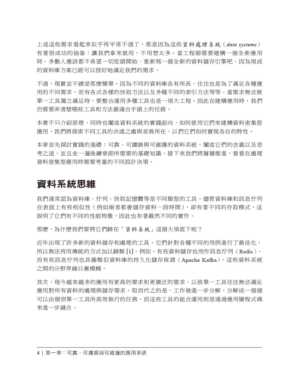 本書的目標是帶您一覽當今發展快速且多樣的資料處理與儲存技術。本書並非針對某一特定工具的入門書籍,也不是一本充滿枯燥理論的教科書。相反地,我們將著眼於一些成功的資料系統,以其作為範例:這些技術是許多流行應用程式的基礎,並且必須滿足生產環境所需要的可擴展性、性能和可靠性等等要求。