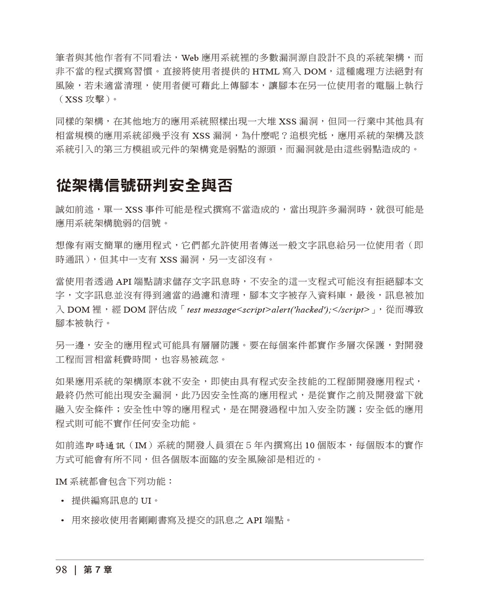 第1章|軟體安全的演化第一回合 偵查第2章|關於Web應用系統偵查第3章|Web應用系統的結構第4章|查找子網域第5章|API分析技巧第6章|識別第三方元件第7章|尋找應用系統架構的弱點第8章|第一回合重點回顧第二回合 攻擊第9章|入侵Web應用系統第10章|跨站腳本(XSS)第11章|跨站請求偽造(CSRF)第12章|XML外部單元體(XXE)第13章|注入漏洞第14章|阻斷服務(DoS)第15章|攻擊第三方元件第16章|第二回合重點回顧第三回合 防禦第17章|保護Web應用系統第18章|安全的應用系統架構第19章|審查源碼的安全性第20章|探索漏洞第21章|漏洞管理第22章|防禦XSS攻擊第23章|防禦CSRF攻擊第24章|防禦XXE攻擊第25章|防禦注入攻擊第26章|防禦DoS攻擊第27章|保護第三方元件第28章|第三回合重點回顧第29章|結語