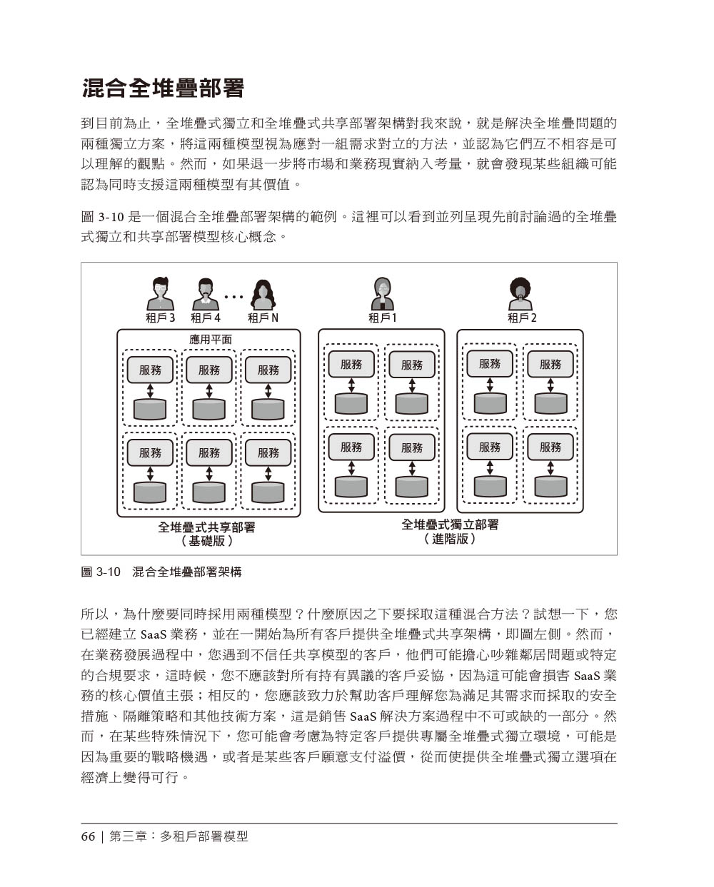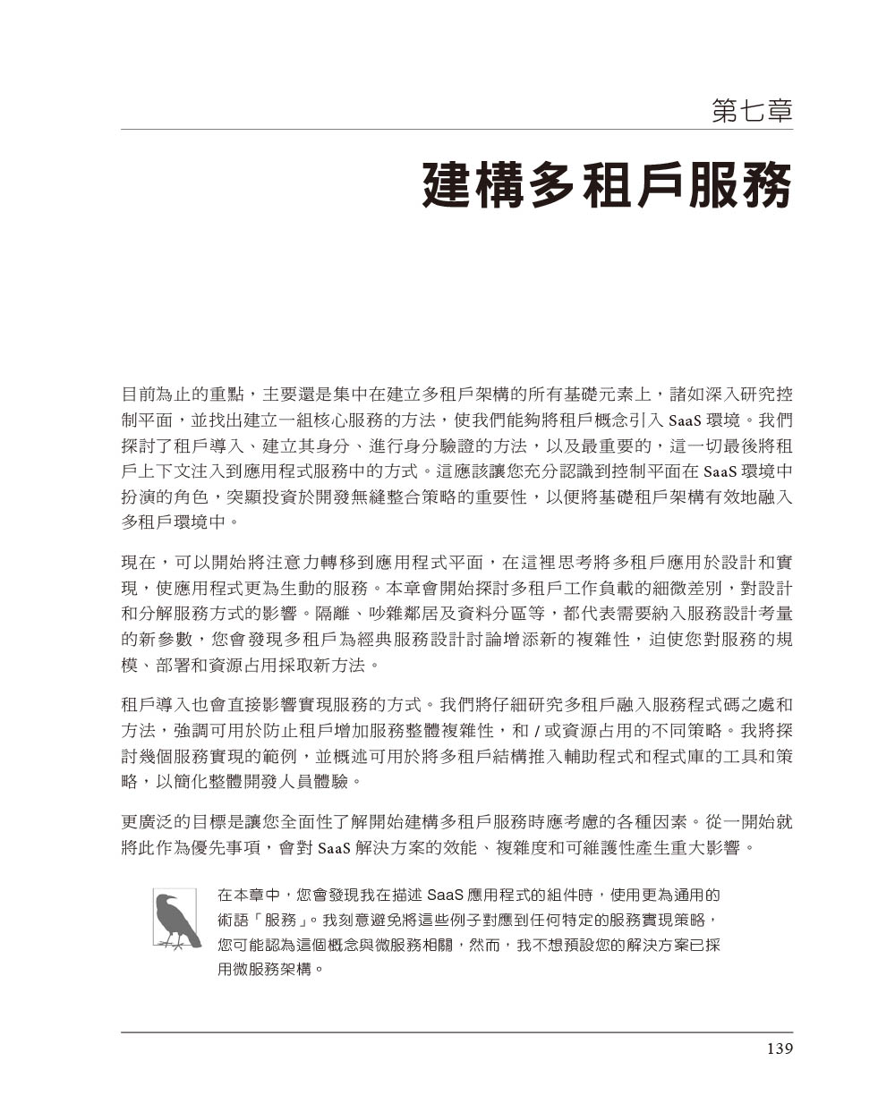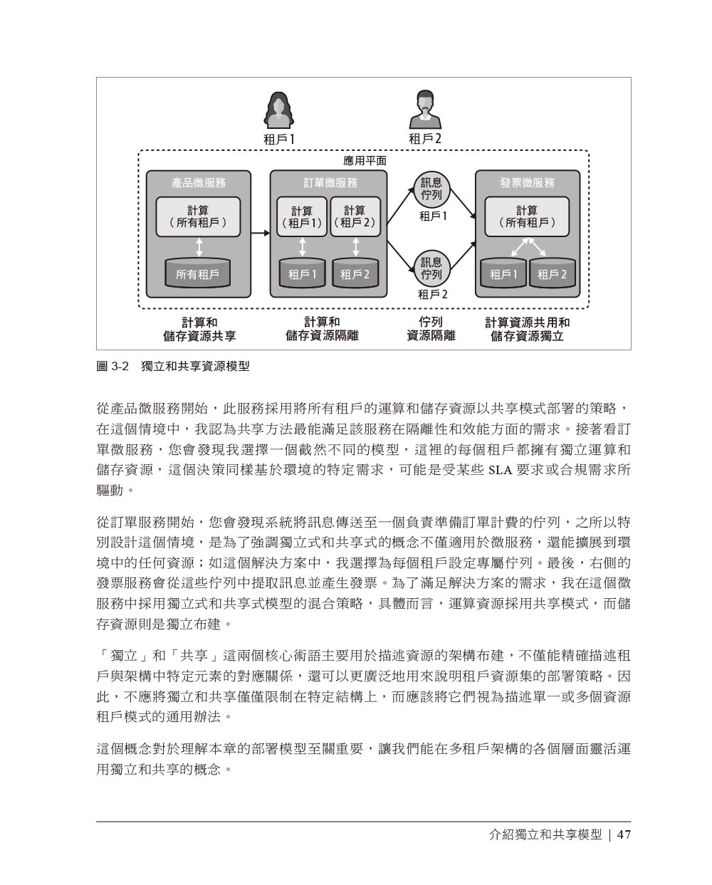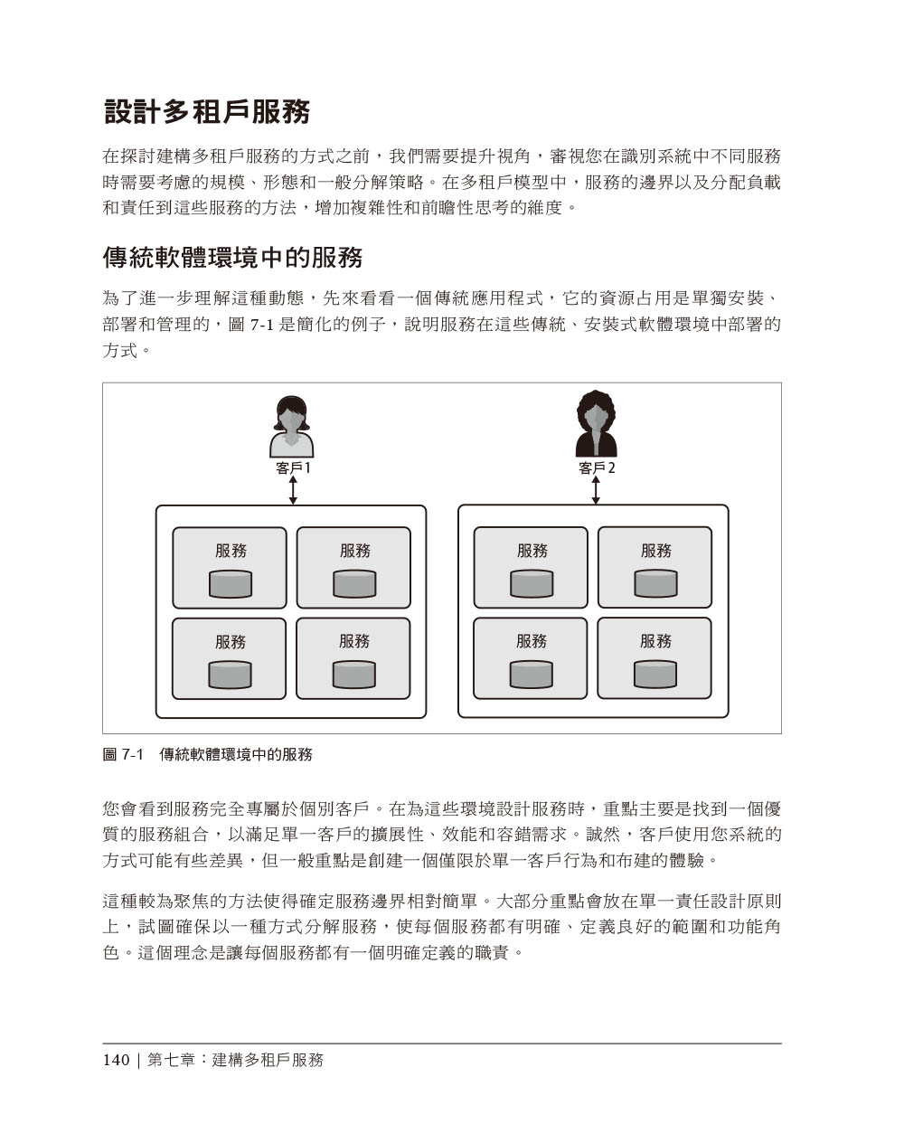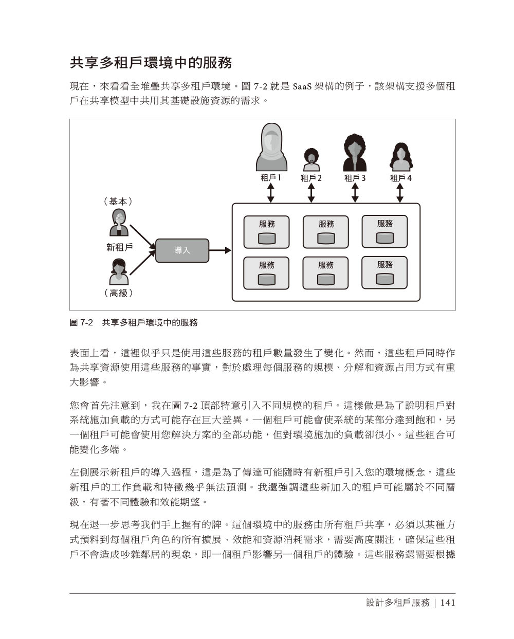 推薦序前言chapter 01 SaaS理念開始之處轉向統一模型重新定義多租戶SaaS核心是一種商業模式打造服務,而非產品定義SaaS結論chapter 02 多租戶架構基礎在架構中引入租戶概念SaaS架構的兩大核心控制平面的內部運作應用平面的內部運作灰色地帶整合控制與應用平面控制平面與應用平面的技術選型避免絕對化結論chapter 03 多租戶部署模型什麼是部署模型?選擇部署模型介紹獨立和共享模型全堆疊獨立部署全堆疊共享模型混合全堆疊部署混合模式部署模型Pod部署模型結論chapter 04 租戶導入與身分管理創建基礎環境租戶導入體驗建立SaaS身分識別結論chapter 05 租戶管理租戶管理基礎管理租戶布建管理租戶生命週期結論chapter 06 租戶身分驗證與路由進入系統入口多租戶身分驗證流程多租戶的路由驗證機制不同技術的路由方式結論chapter 07 建構多租戶服務設計多租戶服務多租戶服務內部機制隱藏和集中多租戶細節攔截工具和策略結論chapter 08 資料分區資料分區基礎最佳化規模挑戰關聯式資料庫分區NoSQL資料分區物件資料分區OpenSearch資料分區租戶資料分片資料生命週期注意事項多租戶資料安全性結論chapter 09 租戶隔離核心概念獨立模型的分層架構部署期與執行期隔離實際範例管理隔離政策結論chapter 10 EKS(Kubernetes)SaaS:架構模式與策略EKS在SaaS架構中的契合性部署模式路由考量租戶導入與部署自動化租戶隔離機制節點類型選擇EKS與無服務器計算的混合使用結論chapter 11 無伺服器SaaS:架構模式與策略SaaS與無伺服器的完美結合部署模型路由策略導入和部署自動化租戶隔離機制併發與吵雜鄰居突破無伺服器運算的局限結論chapter 12 租戶感知營運SaaS營運思維多租戶營運指標建構租戶感知營運控制台多租戶部署自動化結論chapter 13 SaaS遷移策略遷移的平衡藝術遷移策略起點的關鍵性結論chapter 14 分級策略分級模式實現分級營運與分級結論chapter 15 SaaS無所不在基本概念架構模式營運影響和考量因素結論chapter 16 生成式AI與多租戶架構核心概念導入租戶優化應用一般多租戶原則生成式AI定價與分級考量結論chapter 17 指導原則願景、策略與組織結構核心技術考量營運思維結論索引