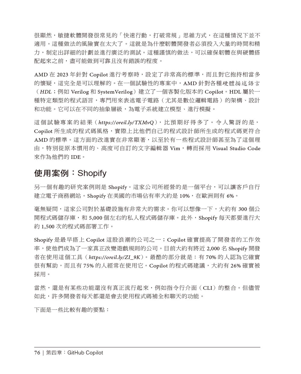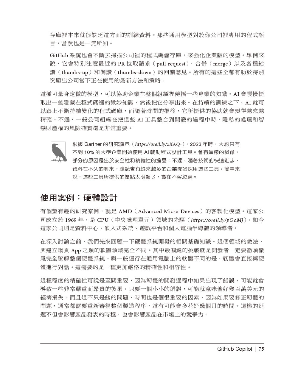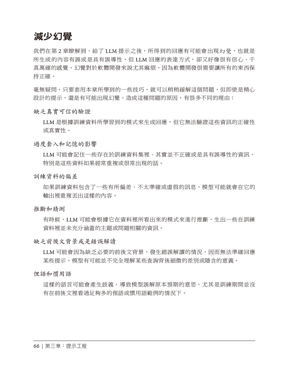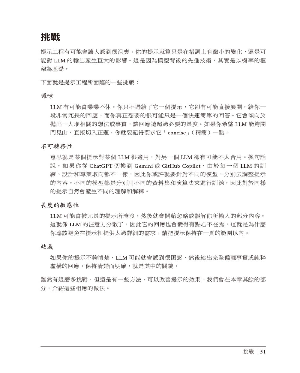 推薦序前言chapter 01 開發者的新世界演進與革命 生成式AI優點缺點開發者所面對的一條全新道路結論chapter 02 用AI寫程式的技術原理主要功能 程式碼建議&前後文感知補全vs.智慧程式碼補全編譯器vs. AI輔助程式設計工具能力分級生成式AI和大語言模型(LLM)chapter 03 提示工程藝術與科學挑戰提示的組成元素前後文(Context)指示(Instruction)內容的輸入(Input of Content) 格式(Format)最佳實務做法減少幻覺安全性和個人隱私自主式AI代理結論chapter 04 GitHub CopilotGitHub Copilot入門Copilot作夥伴計劃結論chapter 05 其他AI輔助程式設計工具Amazon的CodeWhispererGoogle的Duet AI for DevelopersTabnineReplitCodeGPTCodyCodeWPWarpBito AICursorCode Llama其他開源模型結論chapter 06 ChatGPT和其他通用LLMChatGPTGPT-4ChatGPT導覽用Bing來瀏覽比較繁瑣的一些工作跨瀏覽器相容性bash指令GitHub Actions 外掛GPTGeminiClaude結論chapter 07 構想、規劃、開需求腦力激盪市場調查競爭分析開需求專案規劃的各種做法結論chapter 08 寫程式現實性檢查(Reality Check) 臨場判斷(Judgment Calls) 輔助學習註解模組化程式設計開始啟動一個專案自動填寫(Autofill)重構(Refactoring)函式物件導向程式設計框架與函式庫資料前端開發API結論chapter 09 除錯、測試與部署除錯文件程式碼審查部署結論chapter 10 重點摘要學習曲線很陡峭有很多主要的優點但也有不少的缺點提示工程是一門藝術,也是一門科學超越程式設計AI不會搶走你的工作結論索引
