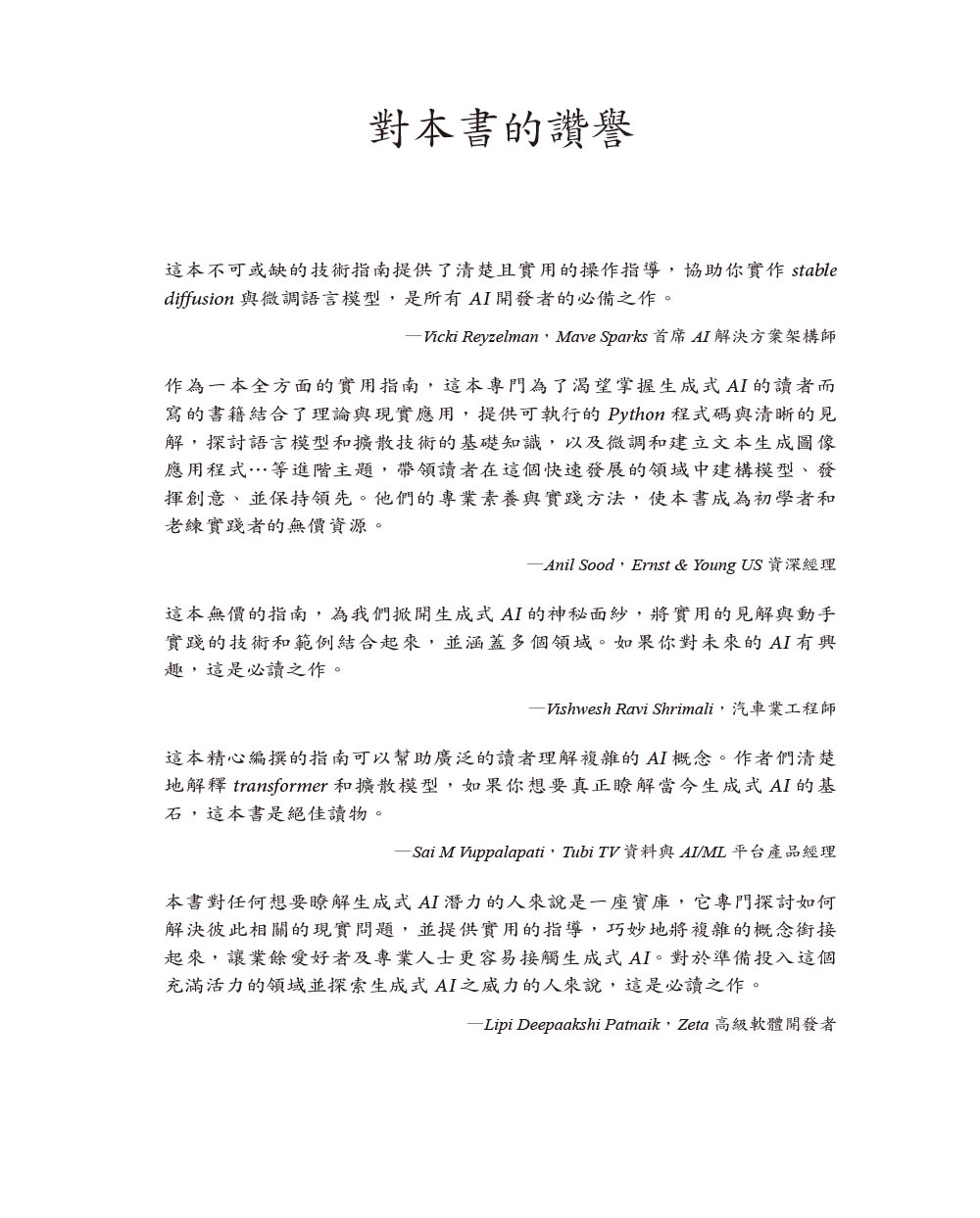 前言 【第一部分 利用開放模型】第一章 生成媒體導論生成圖像生成文本產生一段聲音倫理與社會影響力我們的過去與現狀生成式AI模型是怎麼創造出來的?總結第二章 transformer語言模型的實際運作transformer區塊 transformer模型的發展譜系預訓的威力 transformer回顧專案時間:使用語言模型來生成文本總結練習題挑戰題參考文獻第三章 壓縮資訊與表示資訊AutoEncodersVariational AutoEncodersCLIPCLIP的替代方案專案時間:語義圖像搜尋總結練習題挑戰題參考文獻第四章 擴散模型關鍵洞察:逐步修正訓練擴散模型深入探討:雜訊排程深入探討:UNet與替代方案深入探討:擴散目標專案時間:訓練你的擴散模型總結練習題挑戰題參考文獻第五章 穩定擴散和條件生成加入控制手段:條件擴散模型提升效率:Latent DiffusionStable Diffusion:深入瞭解組件綜合所有內容:註解採樣迴圈開放資料,開放模型專案時間:使用Gradio 建立互動式ML Demo總結練習題挑戰題參考文獻【第二部分 運用遷移學習來建構生成模型】第六章 微調語言模型文本分類生成文本指令適配器簡介量化簡介綜合所有內容深入探討模型評估專案時間:檢索增強生成總結練習題挑戰題參考文獻第七章 微調Stable Diffusion完整的Stable Diffusion微調DreamBooth訓練LoRA賦予Stable Diffusion新能力專案時間:自己訓練一個SDXL DreamBooth LoRA總結練習題挑戰題參考文獻【第三部分 進一步探索】第八章 文字轉圖像模型的創意應用圖像轉圖像圖像修補提示詞加權與圖像編輯透過反轉來編輯真實圖像ControlNet圖像提示與圖像變體專案時間:你的創意畫布總結練習題參考文獻第九章 音訊生成音訊資料使用transformer-based 構來將語音轉為文字從文字轉語音到音訊生成評估音訊生成系統下一步呢?專案時間:完整的對話系統總結練習題挑戰題參考文獻第十章 生成式AI的快速發展領域偏好優化極長的前後文Mixture of Experts優化與量化資料One Model to Rule Them All電腦視覺3D電腦視覺影片生成多模態社群附錄 A 開源工具附錄 B LLM記憶體需求附錄 C 全流程檢索增強生成索引