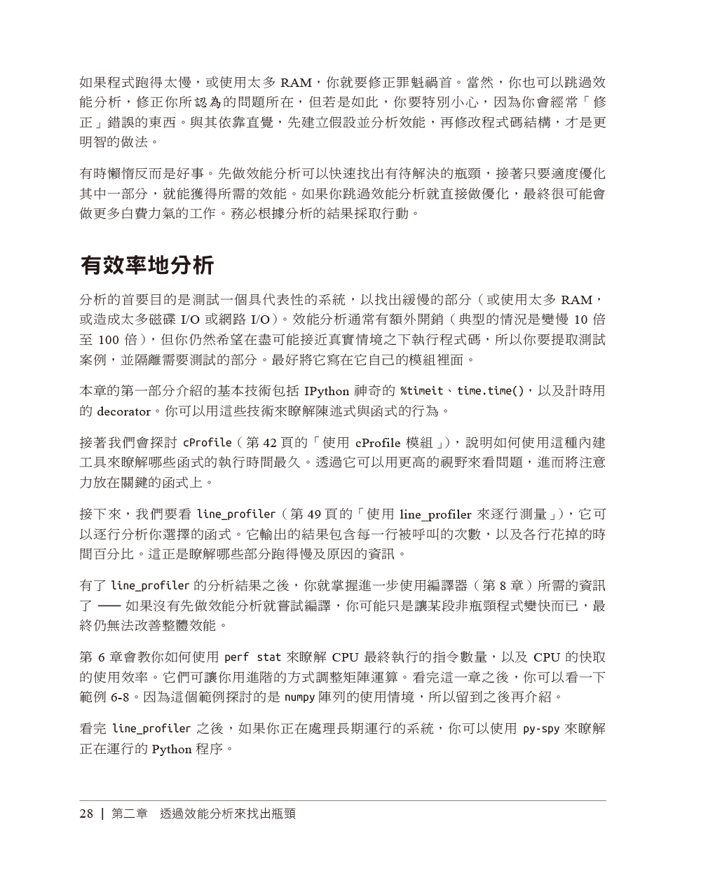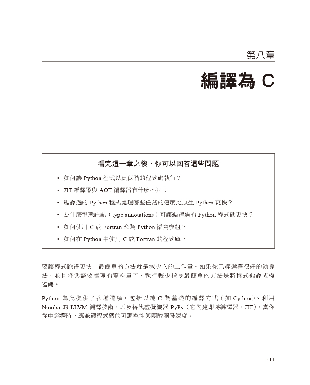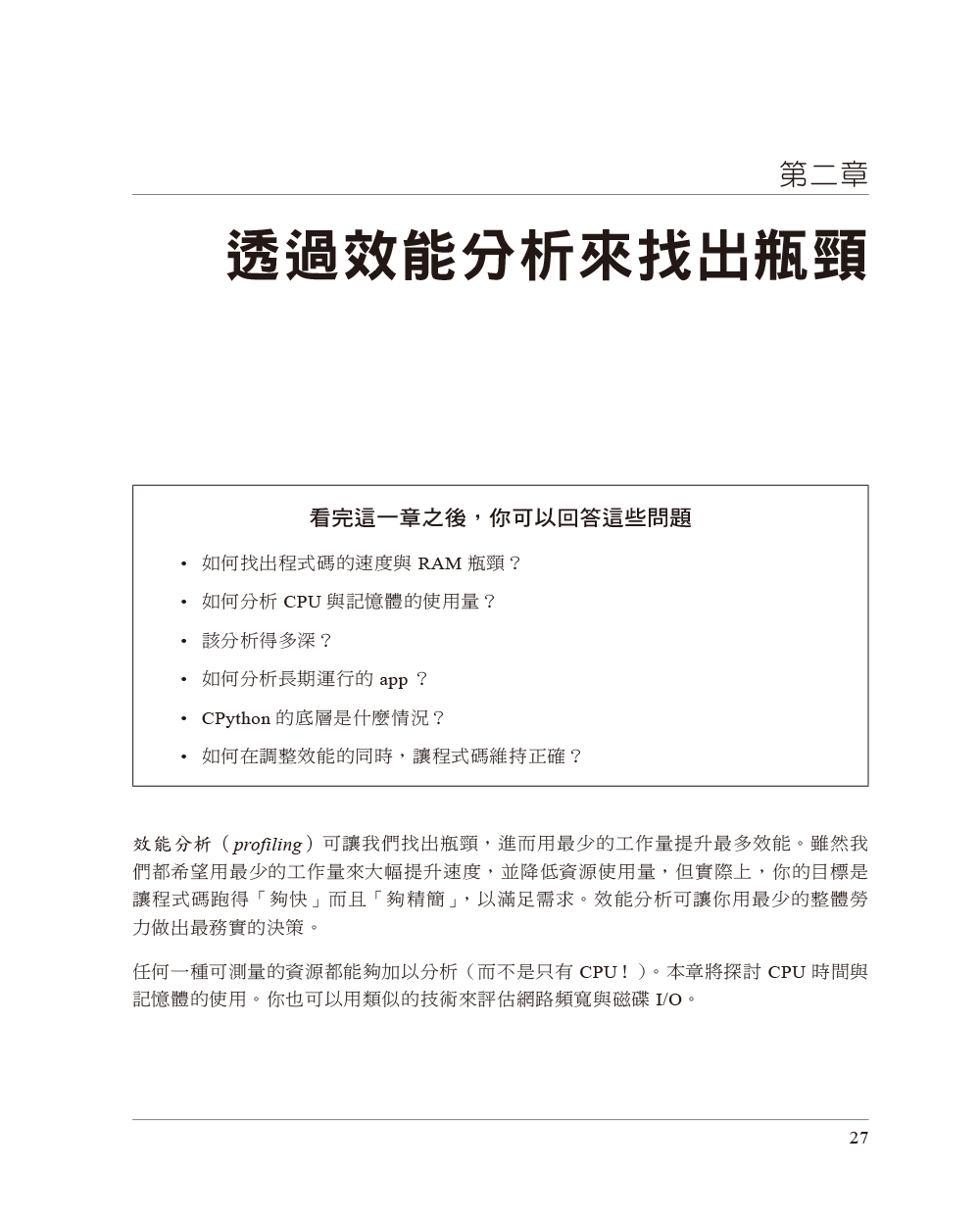 第一章 瞭解高性能Python基本電腦系統理想化的計算vs. Python虛擬機器那為什麼還要用Python?如何成為高效能的程式開發者Python的未來第二章 透過效能分析來找出瓶頸有效率地分析介紹Julia set計算完整的Julia set簡單的計時法—print與decorator使用Unix time命令來做簡單的計時使用cProfile模組使用SnakeViz來將cProfile的輸出視覺化使用line_profiler來逐行測量使用memory_profiler來診斷記憶體的使用情況一起分析CPU與記憶體:使用Scalene用PySpy來自檢既有的程序在時間軸上做互動式呼叫堆疊分析:使用VizTracerBytecode:檢視底層在優化過程中進行單元測試,以維持正確成功分析程式碼的策略第三章 串列與tuple更有效率的搜尋法串列vs. tuple第四章 字典與集合字典與集合如何運作?第五章 迭代器與產生器處理無限序列的迭代器延後產生器求值第六章 矩陣與向量計算問題介紹Python串列不夠好嗎?記憶體碎片化用numpy來處理擴散問題numexpr:讓就地操作更快速與更輕易圖形處理單元(GPU)警世故事:驗證「優化」(scipy)從矩陣優化得到的教訓第七章 Pandas、Dask與PolarsPandas使用Dask來處理分散的資料結構與DataFrame用Polars來獲得快速的DataFrames第八章 編譯為C可能提升多少速度?JIT vs. AOT編譯器為何型態資訊可幫助程式跑得更快?使用C編譯器再談Julia set範例CythonpyximportCython與numpyNumbaPyPy速度改善方法總結使用各項技術的時機外部函式介面第九章 非同步I/O非同步編程簡介async/await如何運作?共享CPU–I/O工作負載第十章 multiprocessing模組multiprocessing模組概要使用Monte Carlo法來估計pi使用程序與執行緒來估計pi尋找質數使用跨程序通訊來檢驗質數使用multiprocessin來共享numpy資料同步檔案與變數存取第十一章 叢集與任務佇列叢集的好處叢集的缺點常見的叢集設計如何開始採用叢集方案在使用叢集時避免痛苦的方法兩種叢集方案其他可以研究的叢集工具Docker第十二章 使用更少RAM基本型態物件很昂貴瞭解集合使用多少RAMBytes vs. Unicode在RAM中有效率地儲存許多文字為更多文字建模:使用scikit-learn的FeatureHasherDictVectorizer與FeatureHasher簡介SciPy的稀疏矩陣關於使用更少RAM的小提示機率式資料結構第十三章 來自現場的教訓開發高效能機器學習演算法新聞領域中的高效能運算來自網路再保險領域的經驗量化金融領域裡的Python保持彈性以實現高效能使用Feature-engine來改進特徵工程作業線(2020)高效能的資料科學團隊(2020)Numba(2020)優化vs.思考(2020)讓深度學習飛起來,與RadimRehurek.com(2014)在Smesh的大型社群媒體分析(2014)