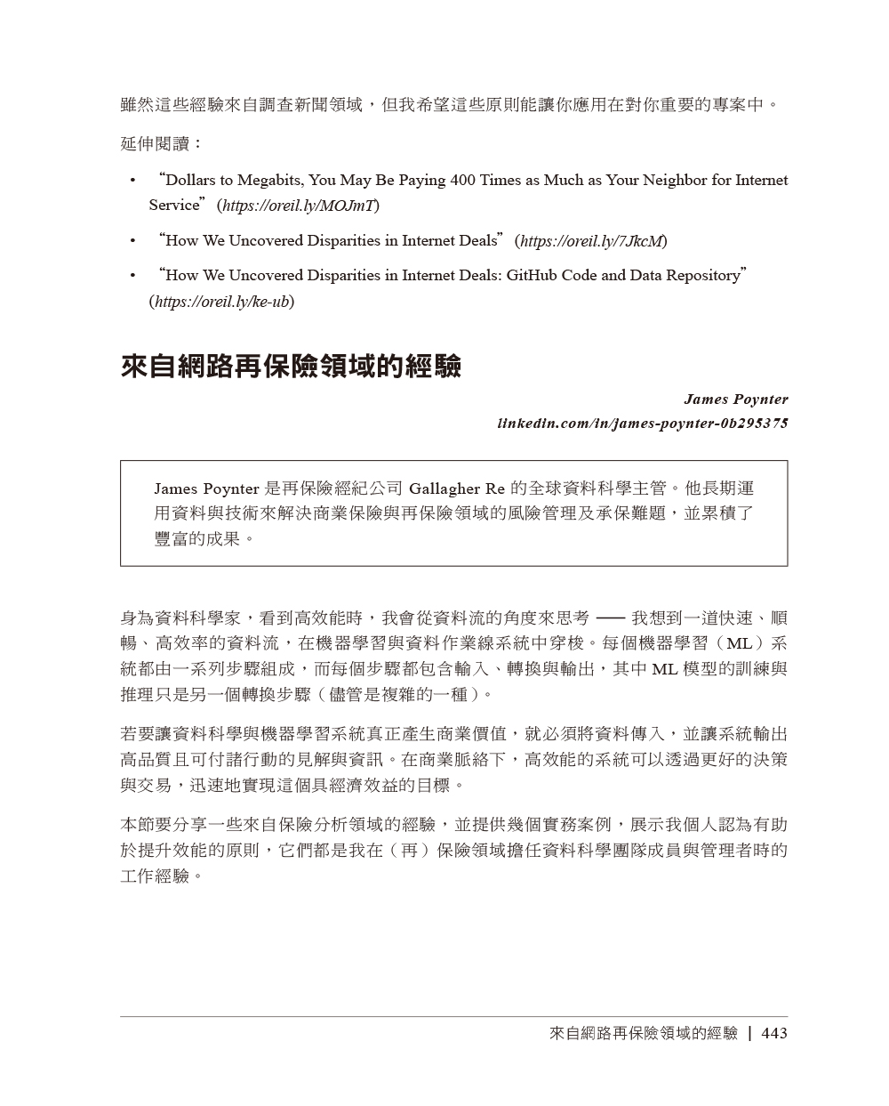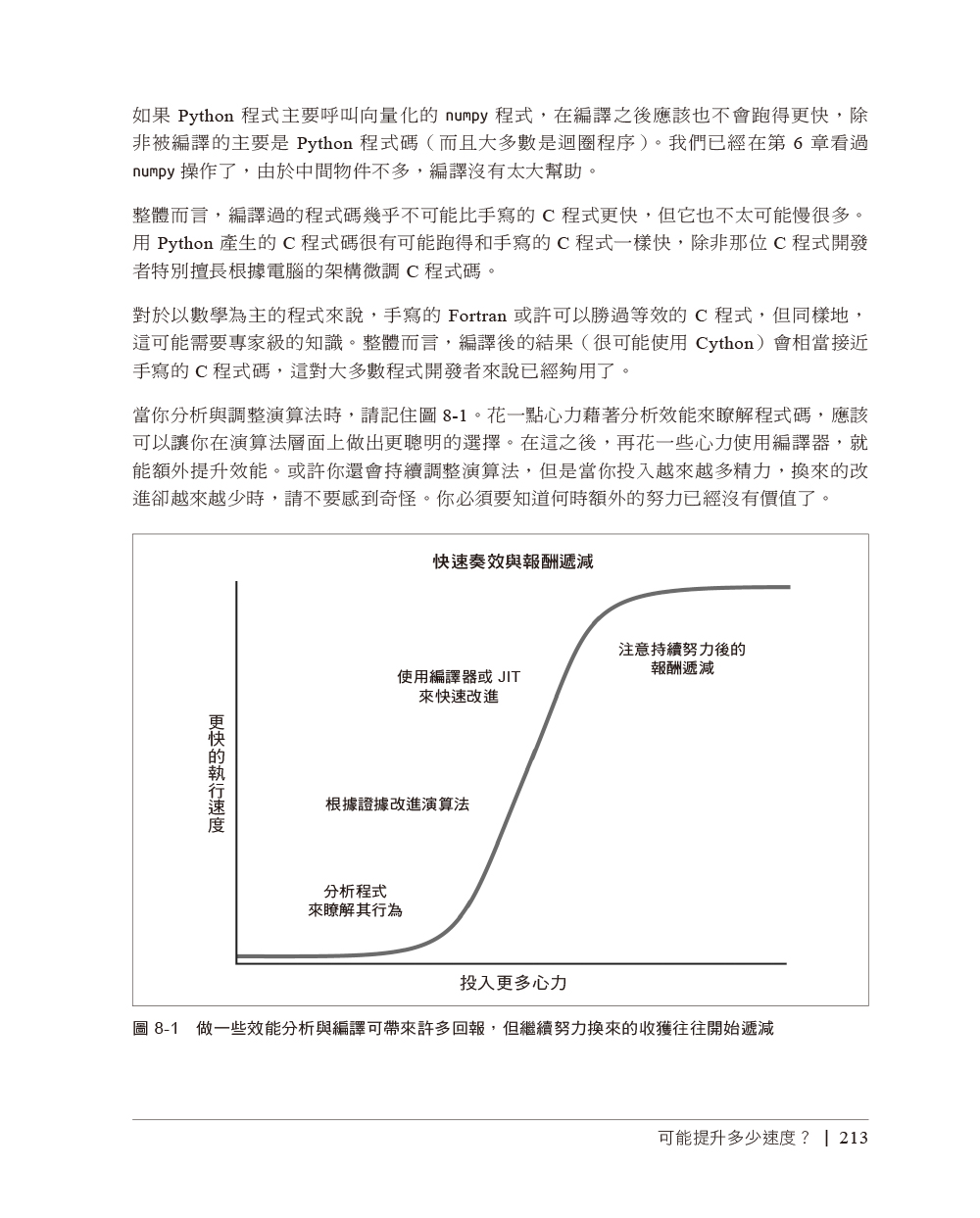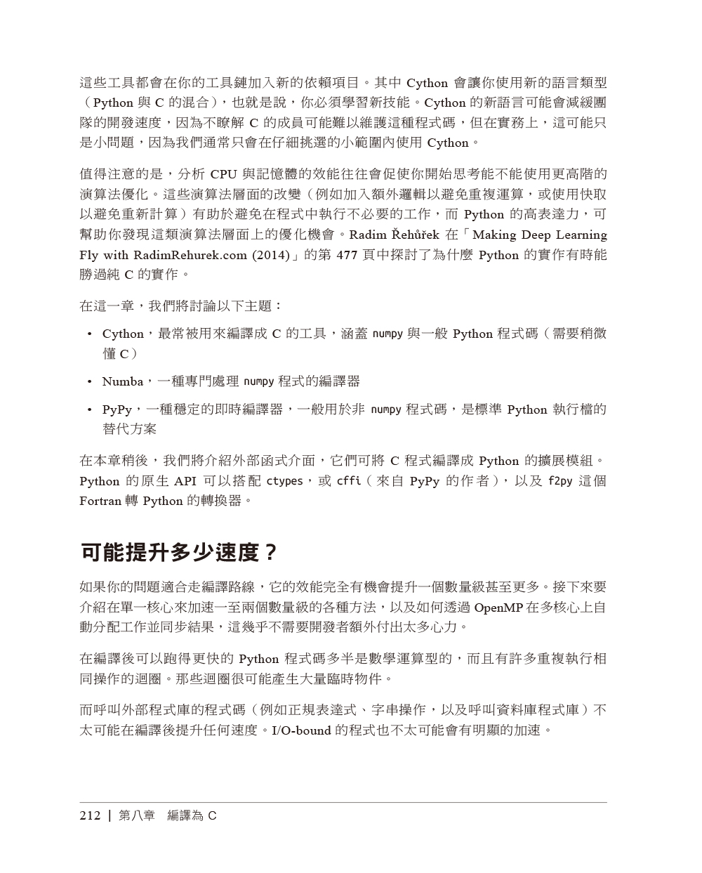 第一章 瞭解高性能Python基本電腦系統理想化的計算vs. Python虛擬機器那為什麼還要用Python?如何成為高效能的程式開發者Python的未來第二章 透過效能分析來找出瓶頸有效率地分析介紹Julia set計算完整的Julia set簡單的計時法—print與decorator使用Unix time命令來做簡單的計時使用cProfile模組使用SnakeViz來將cProfile的輸出視覺化使用line_profiler來逐行測量使用memory_profiler來診斷記憶體的使用情況一起分析CPU與記憶體:使用Scalene用PySpy來自檢既有的程序在時間軸上做互動式呼叫堆疊分析:使用VizTracerBytecode:檢視底層在優化過程中進行單元測試,以維持正確成功分析程式碼的策略第三章 串列與tuple更有效率的搜尋法串列vs. tuple第四章 字典與集合字典與集合如何運作?第五章 迭代器與產生器處理無限序列的迭代器延後產生器求值第六章 矩陣與向量計算問題介紹Python串列不夠好嗎?記憶體碎片化用numpy來處理擴散問題numexpr:讓就地操作更快速與更輕易圖形處理單元(GPU)警世故事:驗證「優化」(scipy)從矩陣優化得到的教訓第七章 Pandas、Dask與PolarsPandas使用Dask來處理分散的資料結構與DataFrame用Polars來獲得快速的DataFrames第八章 編譯為C可能提升多少速度?JIT vs. AOT編譯器為何型態資訊可幫助程式跑得更快?使用C編譯器再談Julia set範例CythonpyximportCython與numpyNumbaPyPy速度改善方法總結使用各項技術的時機外部函式介面第九章 非同步I/O非同步編程簡介async/await如何運作?共享CPU–I/O工作負載第十章 multiprocessing模組multiprocessing模組概要使用Monte Carlo法來估計pi使用程序與執行緒來估計pi尋找質數使用跨程序通訊來檢驗質數使用multiprocessin來共享numpy資料同步檔案與變數存取第十一章 叢集與任務佇列叢集的好處叢集的缺點常見的叢集設計如何開始採用叢集方案在使用叢集時避免痛苦的方法兩種叢集方案其他可以研究的叢集工具Docker第十二章 使用更少RAM基本型態物件很昂貴瞭解集合使用多少RAMBytes vs. Unicode在RAM中有效率地儲存許多文字為更多文字建模:使用scikit-learn的FeatureHasherDictVectorizer與FeatureHasher簡介SciPy的稀疏矩陣關於使用更少RAM的小提示機率式資料結構第十三章 來自現場的教訓開發高效能機器學習演算法新聞領域中的高效能運算來自網路再保險領域的經驗量化金融領域裡的Python保持彈性以實現高效能使用Feature-engine來改進特徵工程作業線(2020)高效能的資料科學團隊(2020)Numba(2020)優化vs.思考(2020)讓深度學習飛起來,與RadimRehurek.com(2014)在Smesh的大型社群媒體分析(2014)