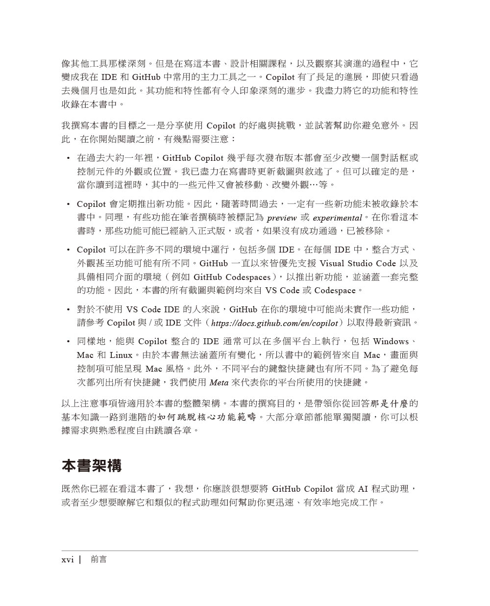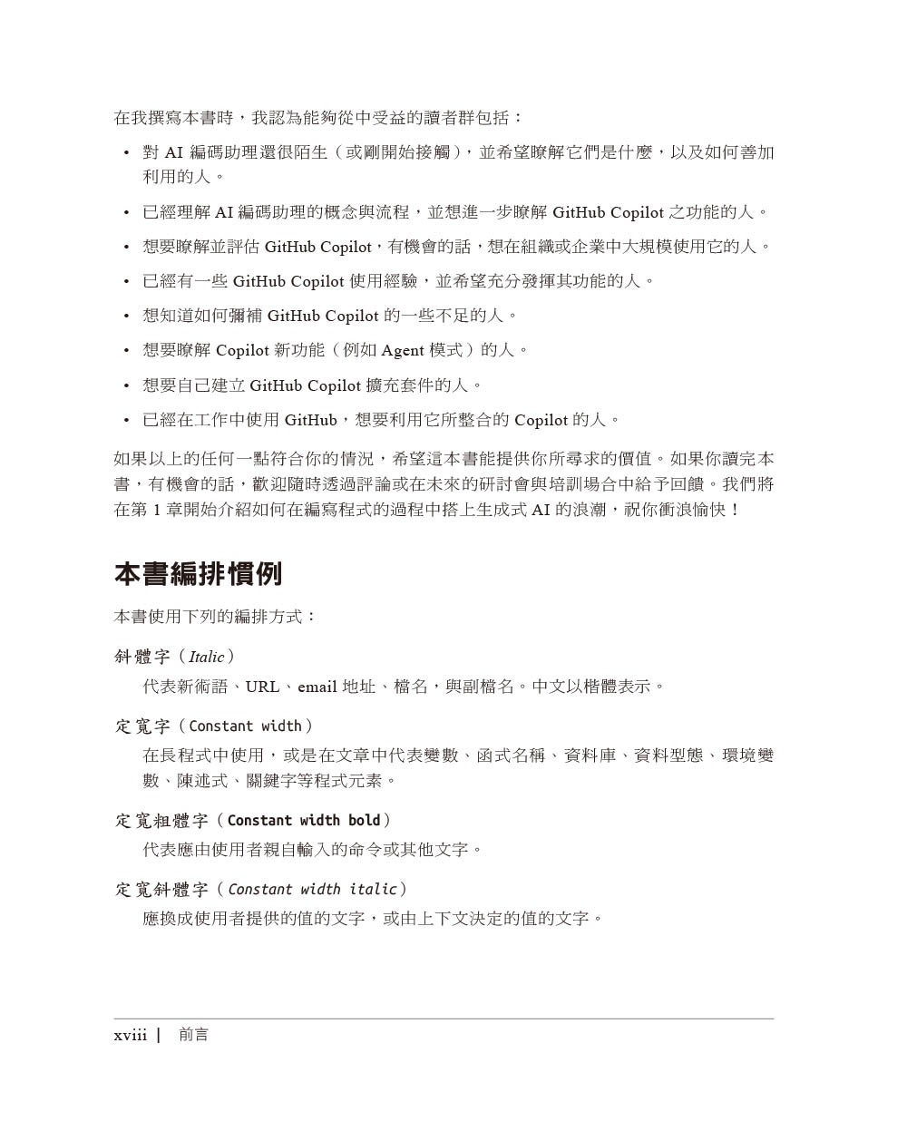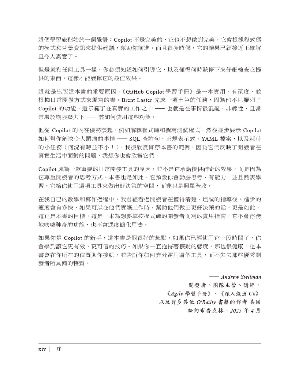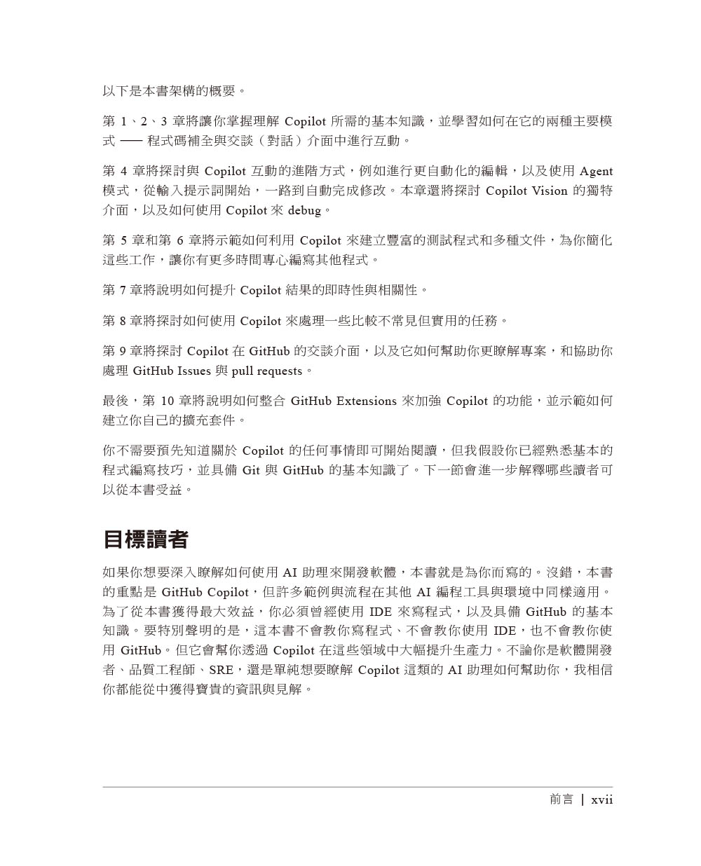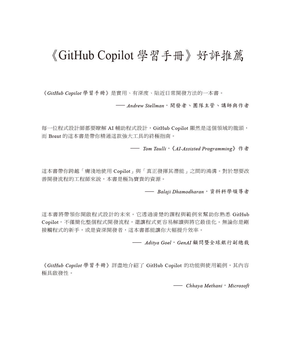 第一章 基本知識什麼是 GitHub Copilot?Copilot如何運作?使用時的注意事項比較Copilot與ChatGPTCopilot方案結語第二章 使用Copilot來寫程式inline建議取得額外建議善用註解Copilot與context選單使用Copilot來檢查你的程式碼在IDE中設定Copilot結語第三章 在IDE中與Copilot交談打開Chat的主介面瞭解交談輸出管理交談工作階段在Copilot裡的提示工程有效地使用提示對話框使用編輯器行內交談介面使用快速交談介面交談快捷命令交談參與者交談變數在終端機裡交談自訂程式碼生成指令處理幻覺與錯誤回應結語第四章 IDE裡的進階編輯與自動化流程使用Next Edit Suggestions來做預測編輯Copilot EditsAgent ModeCopilot Vision使用Copilot來偵錯結語第五章 使用Copilot來測試該如何測試?建立單元測試建立整合測試自訂測試指令在編寫程式之前撰寫測試與利用框架善用Agent模式來測試工作流程結語第六章 使用Copilot來撰寫文件並解釋程式碼記錄內容解釋內容結語第七章 讓Copilot維持即時與相關背景資訊的來源有哪些因素會影響即時性與相關性使用者應對策略加入背景資訊來讓程式碼更相關結語第八章 活用Copilot的其他方法使用Copilot來處理SQL使用YAML與Kubernetes產生正規表示式自動生成資料GitHub CLI與Copilot結語第九章 在GitHub中使用Copilot在GitHub版本庫中使用交談介面利用Copilot來改變流程使用Copilot來管理pull request利用Copilot來探索程式碼變更一起使用Copilot與GitHub Issue結語第十章 擴展Copilot的功能Copilot擴充套件與VS Code的Copilot擴充套件什麼是Copilot擴充套件?從Marketplace取得Copilot擴充套件瞭解Copilot擴充套件的實作類型擴充套件的基本組件以agent形式實作擴充套件用技能組來實作擴充套件建立VS Code的Copilot擴充套件結語