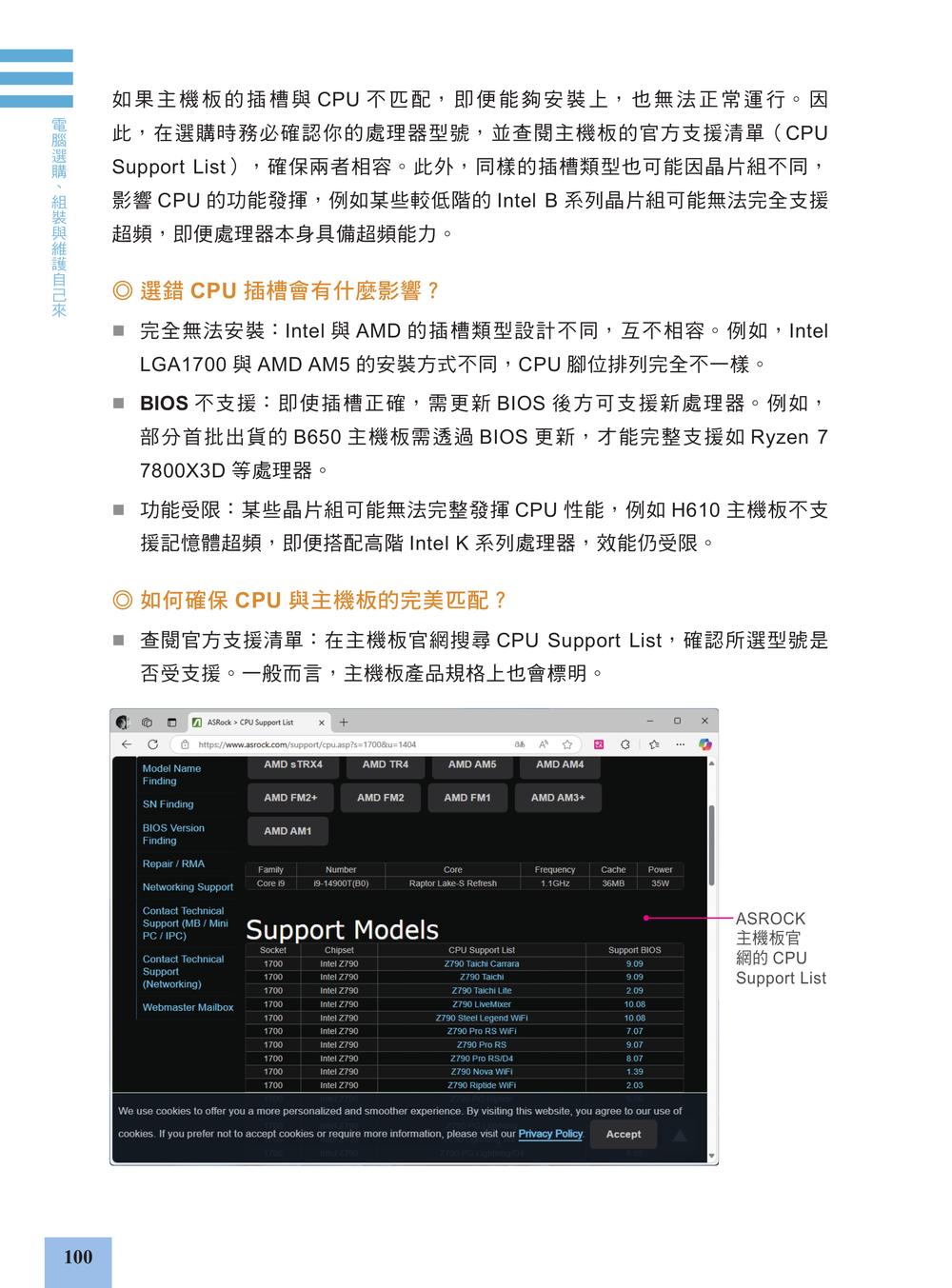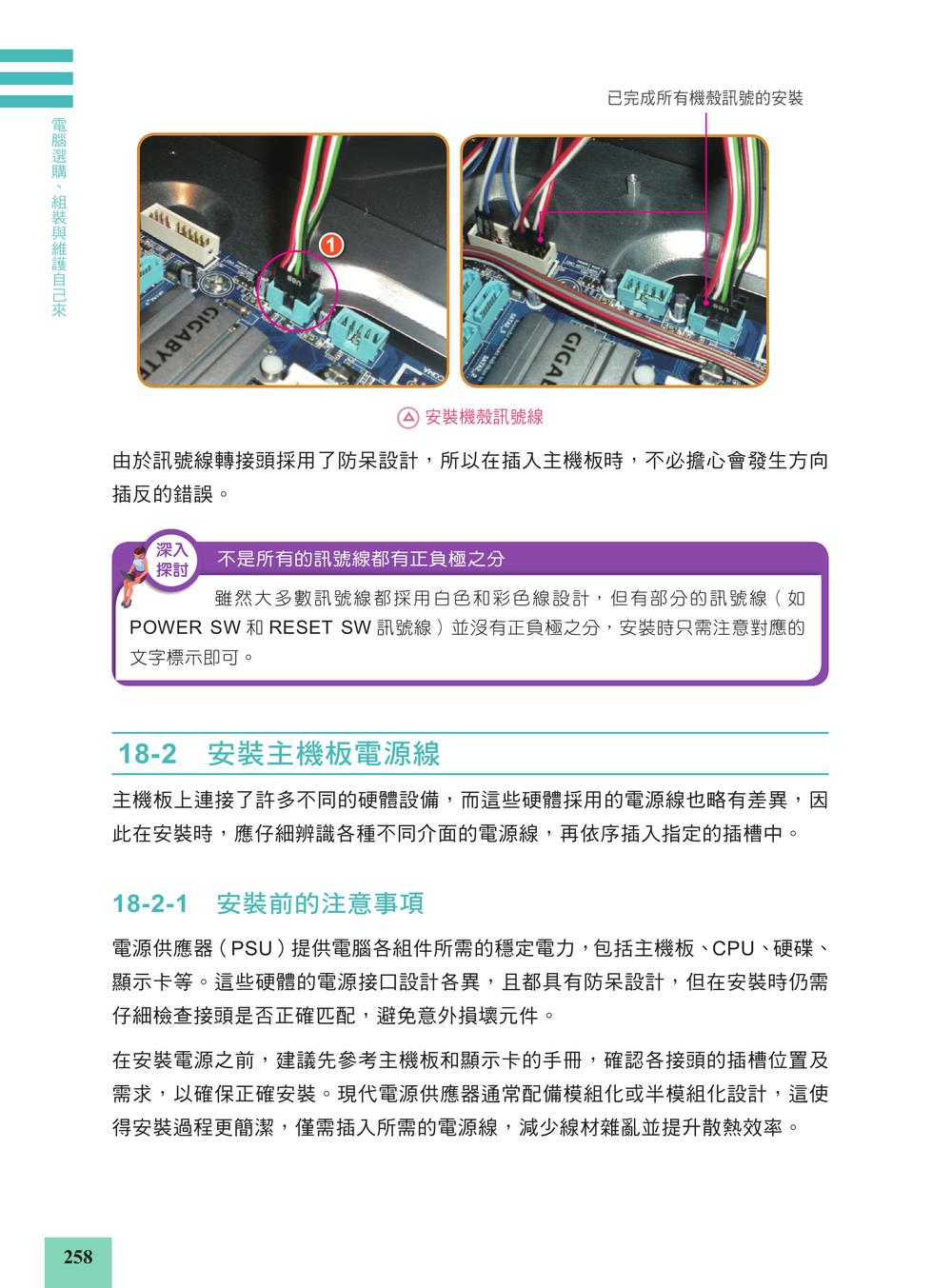 Chapter 00 我需要裝 AI 電腦嗎【PART 1 掌握與選購電腦外部配備】 Chapter 01 選購舒適的電腦螢幕 Chapter 02 選購合適的鍵盤與滑鼠 Chapter 03 選購合適的電源供應器【PART 2 掌握與選購電腦內部元件】 Chapter 04 選購合適的處理器 - CPU Chapter 05 選購合適的主機板 Chapter 06 選購合適的記憶體 - RAM Chapter 07 選購合適的機械硬碟 - Hard Disk Chapter 08 選購合適的固態硬碟 - SSD Chapter 09 顯示卡 - Graphic Card/GPU Chapter 10 無線網路設備【PART 3 開始 DIY,讓電腦動起來】 Chapter 11 DIY 準備階段 Chapter 12 安裝 CPU 及散熱風扇 Chapter 13 安裝記憶體 Chapter 14 拆除機殼 Chapter 15 安裝主機板 Chapter 16 安裝硬碟 / SSD Chapter 17 安裝電源供應器 Chapter 18 接上機殼訊號線及主機板電源線 Chapter 19 安裝獨立顯示卡 Chapter 20 裝回機殼並安裝鍵盤和滑鼠 Chapter 21 連接螢幕訊號線到主機 Chapter 22 安裝其他周邊裝置 Chapter 23 硬體初始化設定及簡易故障排除【PART 4 系統安裝、更新與維護】 Chapter 24 安裝 Windows 11 作業系統 Chapter 25 安裝驅動程式 Chapter 26 系統保全與資料安全 Chapter 27 輕鬆架設與使用網路 Chapter 28 別讓電腦在網路上裸奔【PART 5 檢測管理自己來】 Chapter 29 維護、檢測硬體問題與穩定性 Chapter 30 打造穩定的作業系統