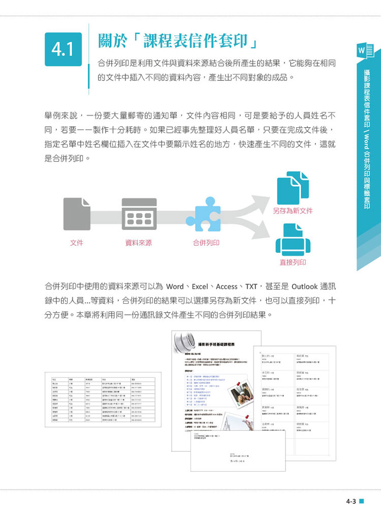 ch01 節慶文宣-Word常用的文字編輯技巧 ch02 茶葉行訂購單-Word表格之應用 ch03 景點海報-Word美工圖案之應用 ch04 攝影課程表信件套印-Word合併列印與標籤套印 ch05 行動商務書面報告-Word長文件的製作 ch06 生活收支明細表-Excel 資料建立與公式運算 ch07 咖啡豆進價單-Excel 函數應用 ch08 旅遊人數統計表-Excel圖表製作 ch09 銷售記錄表-Excel樞鈕分析 ch10 健康飲食簡報-PowerPoint簡報基礎製作 ch11 單車生活簡報-PowerPoint表格與圖表設計 ch12 鼓舞節簡報 -PowerPoint多媒體與動畫 ch13 圖書產品簡報-PowerPoint放映技巧與列印ch14 旅行社管理資料庫-Access資料庫的建置 ch15 旅行社管理資料庫-Access資料表排序、篩選與查詢 ch16 網購管理資料庫-Access表單與報表