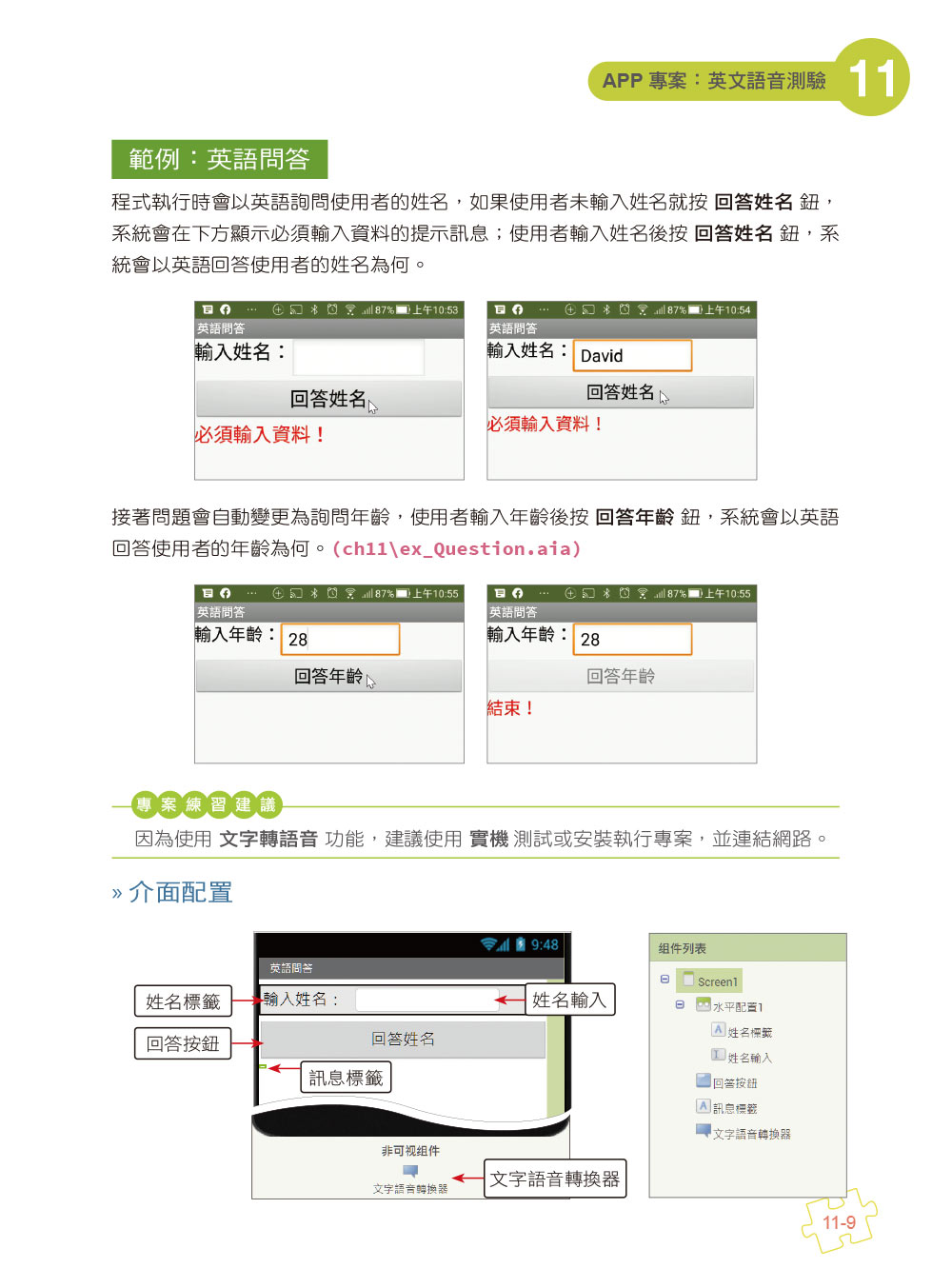 01 用拼塊拼出你的AppApp Inventor 2使用拼圖模式來組合程式,搭配好用的各式元件,即使完全未接觸過的程式設計者,也能開發功能強大的Android App。02 基本元件與運算基本元件除了能控管應用程式與使用者互動,並且經過精心安排介面元件,就能設計出賞心悅目的使用者介面。綜合演練(Android/iOS跨平台適用)03 程式拼塊與流程控制判斷式能讓執行程式依情況不同而執行不同程式碼;迴圈能處理程式中重複的工作;陣列,能解決儲存大量同類型資料的問題。綜合演練(Android/iOS跨平台適用)04 自訂程序及內建程序自訂程序及內建程序能將具有特定功能或經常使用的程式拼塊,撰寫成獨立的小單元。綜合演練(Android/iOS跨平台適用)05 繪圖與動畫圖像精靈及球型精靈是App Inventor 2為動畫和遊戲所量身打造的元件,使用時必須配合畫布元件。綜合演練(Android/iOS跨平台適用)06 APP專案:電子羅盤「電子羅盤」即是善用方向感測器元件的功能來製作一個真實可用的電子羅盤。(Android/iOS跨平台適用)07 APP專案:手機搖搖樂「手機搖搖樂」是利用手機搖動時觸發加速度感測器的晃動事件,進行計次的動作。(Android平台適用)08 APP專案:QR Code二維條碼「QR Code二維條碼」已經普及到日常生活中,在App Inventor 2的專案中可以很輕鬆加入或是讀取QR Code的功能。(Android/iOS跨平台適用)09 APP專案:哈囉!熊讚「哈囉!熊讚」是利用網路瀏覽器及Activity啟動器元件將網頁資料顯示於瀏覽器中,相關的基本資料、相片、影片及導航一應俱全。(Android平台適用)10 APP專案:心情塗鴉「心情塗鴉」可以在拍攝的相片上進行塗鴉,或是加上心情圖示,是相當有趣實用的範例。(Android/iOS跨平台適用)11 APP專案:英文語音測驗「英文語音測驗」 專案使用語音辨識元件及文字語音轉換器元件,設計選擇題式英文聽力測驗。(Android/iOS跨平台適用)12 APP專案:點餐系統「點餐系統」專案利用下拉式清單元件及清單顯示器元件佈置點餐畫面,使用者可以選擇想要的餐點及數量,程式能自動計算最後的價格。(Android平台適用)13 APP專案:打磚塊「打磚塊」是利用基本的碰撞原理製作,若熟悉遊戲運作原理,要製作較複雜的打磚塊關卡也非難事。(Android/iOS跨平台適用)14 APP專案:滾球遊戲「滾球遊戲」專案結合了加速度感測器的加速度變化事件來控制球的滾動,增添遊戲的精彩度。(Android/iOS跨平台適用)15 APP專題:打雪怪遊戲「打雪怪遊戲」利用按鈕元件佈置遊戲角色,並且利用清單的觀念管理所有角色物件,讓複雜的遊戲瞬間簡單了。(Android/iOS跨平台適用)