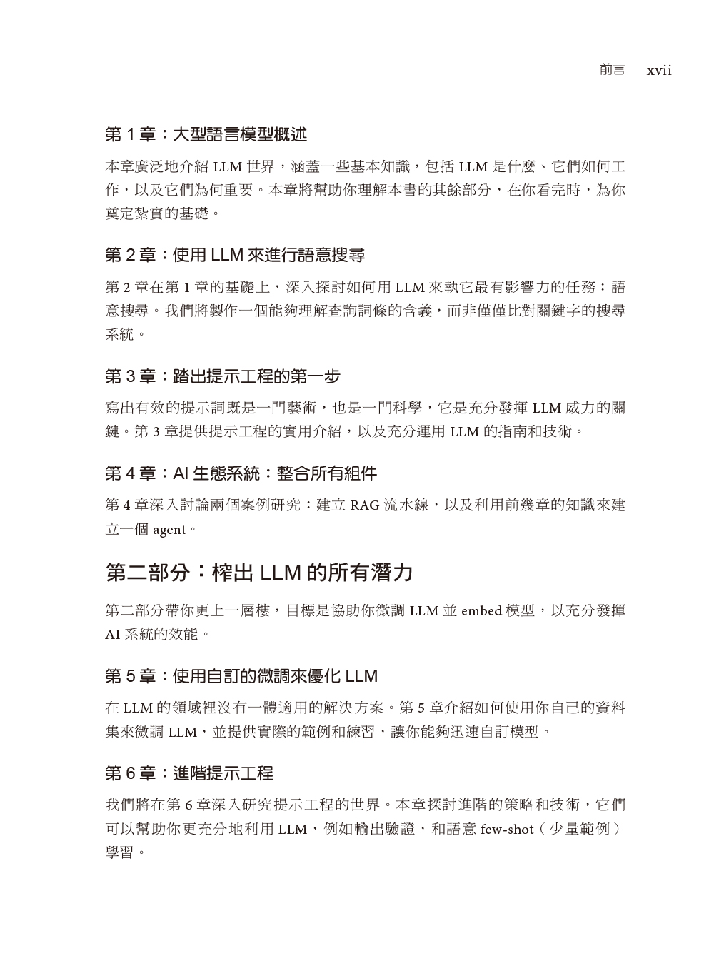 序前言致謝關於作者PART I 大型語言模型簡介1 大型語言模型概述大型語言模型是什麼?流行的現代LLMLLM的應用結論2 使用LLM來進行語意搜尋前言任務解決方案概要組件整合一切使用閉源組件的成本結論3 踏出提示工程的第一步前言提示工程在不同模型之間使用提示結論4 AI生態系統:整合所有組件前言閉源AI的效能不斷變動AI推理vs.思考案例研究1:檢索增強生成案例研究2:自動AIagent結論PART II 榨出LLM的所有潛力5 使用自訂的微調來優化LLM前言遷移學習和微調:入門指南OpenAI微調API概要使用OpenAICLI來準備自訂範例設定OpenAICLI我們微調的第一個LLM結論6 進階提示工程前言提示注入攻擊輸入/輸出驗證批次提示提示鏈案例研究:AI的數學能力有多強?結論7 自訂embedding與模型架構前言案例研究:建立推薦系統結論8 AI對齊:第一原則前言對齊的對象是誰?為了什麼目的?對齊可以降低偏見的嚴重性對齊的支柱憲法AI:邁向自我對齊的一步結論PART III LLM進階用法9 超越基礎模型前言案例研究:視覺問答案例研究:透過回饋來進行強化學習結論10 微調進階的開源LLM前言範例:使用BERT來做動畫類型多標籤分類範例:使用GPT2來生成LaTeXSinan’sAttemptatWiseYetEngagingResponses:SAWYER結論11 將LLM投入生產前言將閉源LLM部署至生產環境將開源LLM部署至生產環境結論12 評估LLM前言評估生成任務評估理解任務結論繼續前進!PART IV 附錄A LLM FAQB LLM詞彙表C LLM應用程式原型索引