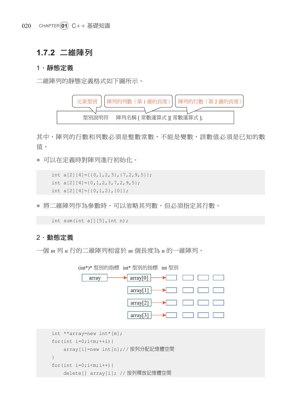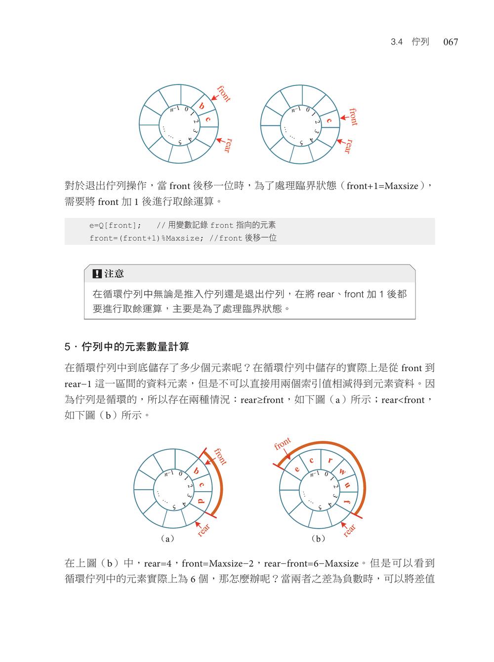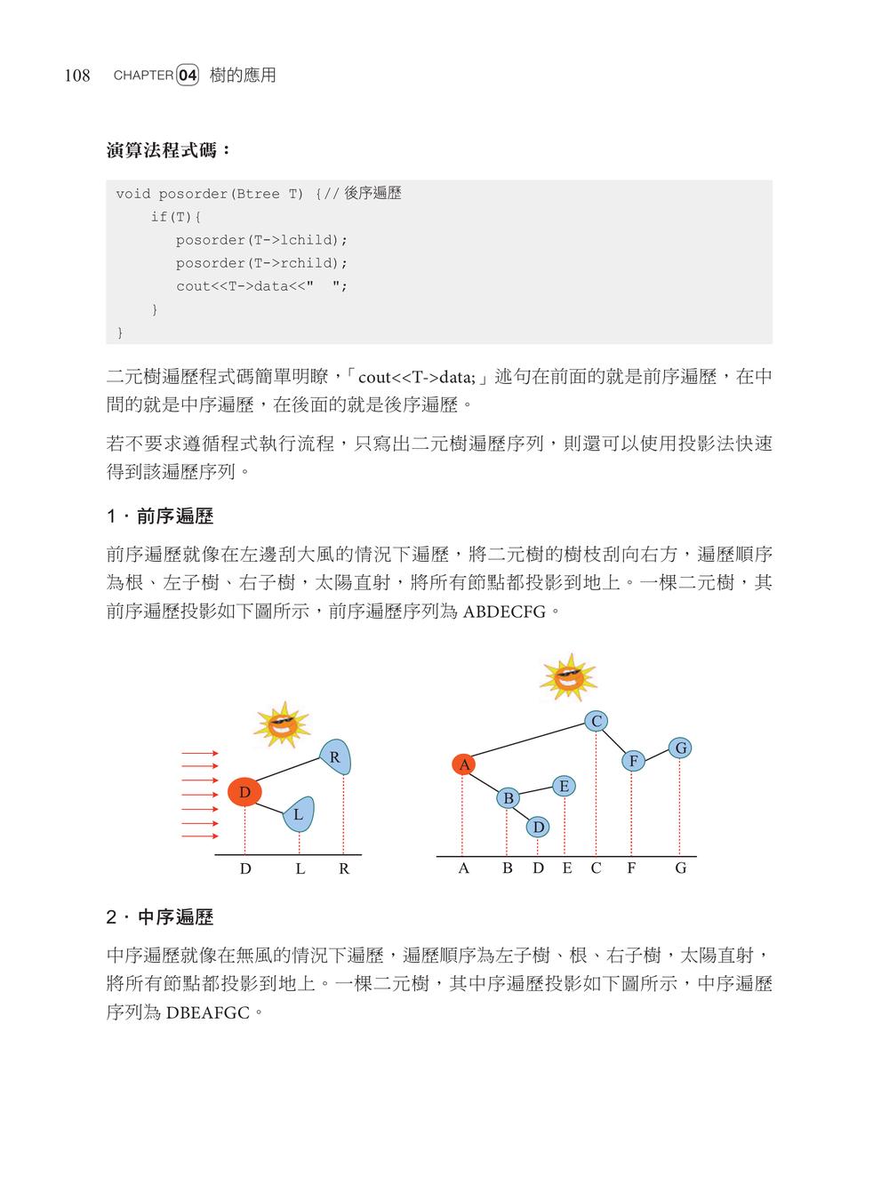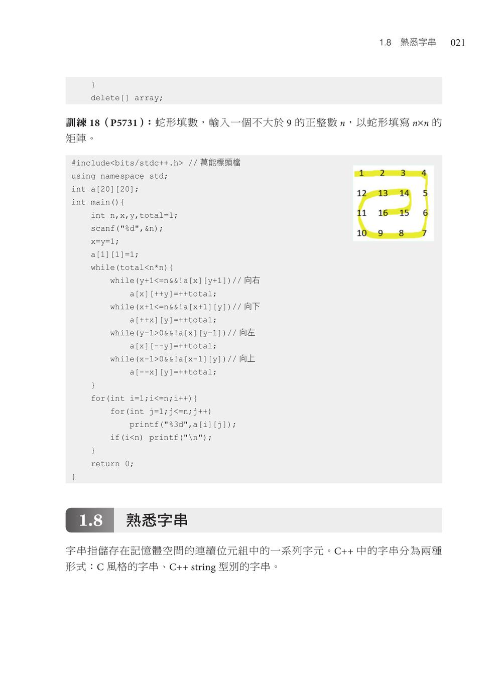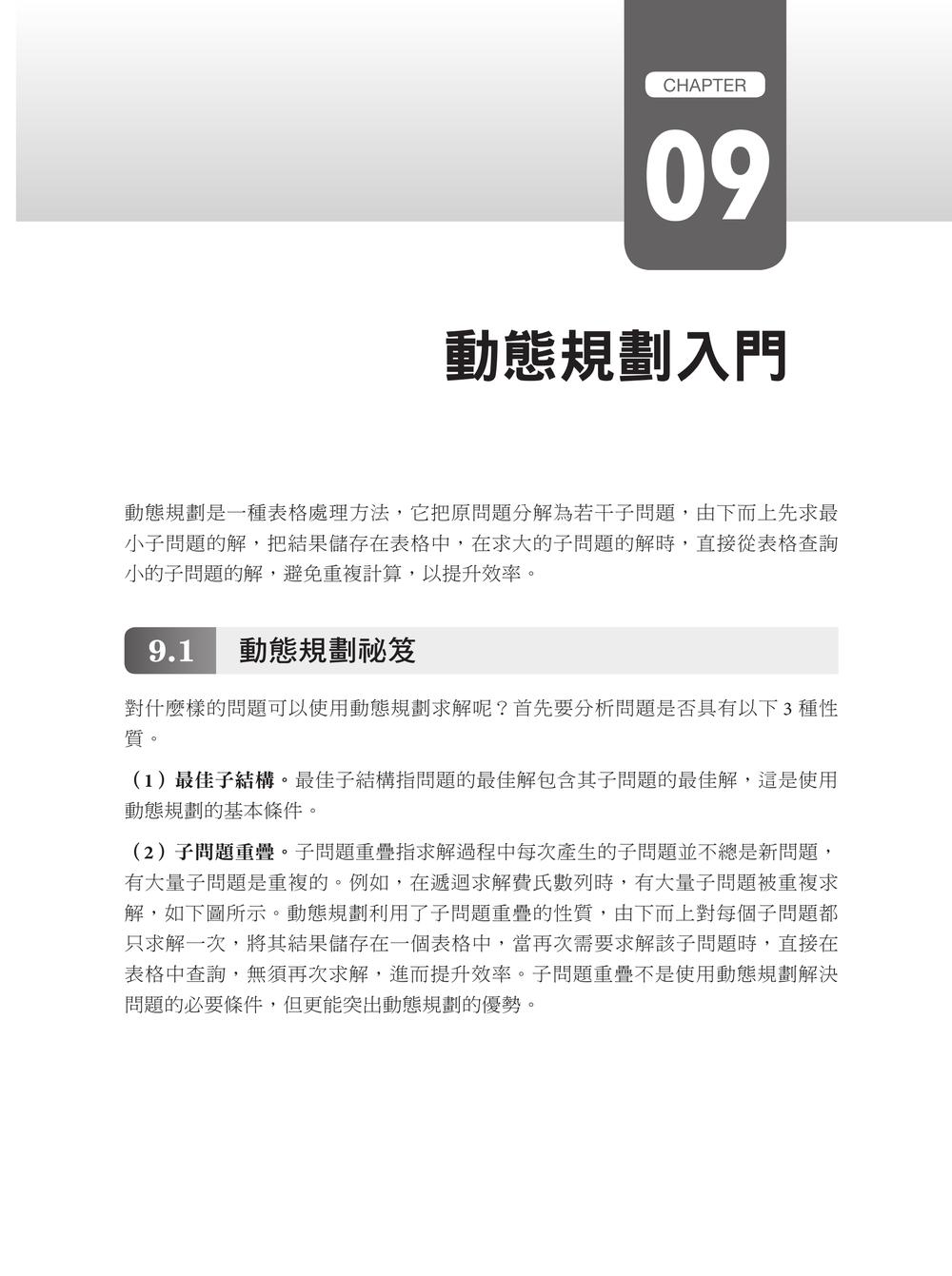 Chapter 01 C++基礎知識1.1 開啟演算法之旅1.2 常用的資料型別1.3 熟悉輸入和輸出1.4 常用的運算子1.5 選擇結構述句1.6 迴圈結構述句1.7 巧用陣列1.8 熟悉字串1.9 結構體的應用1.10 指標的應用Chapter 02 演算法之美2.1 演算法複雜度2.2 函式2.3 遞迴Chapter 03 線性串列的應用3.1 連續串列3.2 鏈接串列3.3 堆疊3.4 佇列3.5 STL中的常用函式和容器Chapter 04 樹的應用4.1 樹4.2 二元樹4.3 二元樹遍歷4.4 霍夫曼樹4.5 二元搜尋樹Chapter 05 圖論基礎5.1 圖的儲存5.2 圖的遍歷Chapter 06 演算法入門6.1 貪心演算法6.2 分治演算法Chapter 07 高精度計算7.1 高精度加法7.2 高精度減法7.3 高精度乘法7.4 高精度除法Chapter 08 搜尋演算法入門8.1 二元演算法8.2 深度優先搜尋8.3 廣度優先搜尋Chapter 09 動態規劃入門9.1 動態規劃祕笈9.2 背包問題9.3 線性動態規劃9.4 區間動態規劃