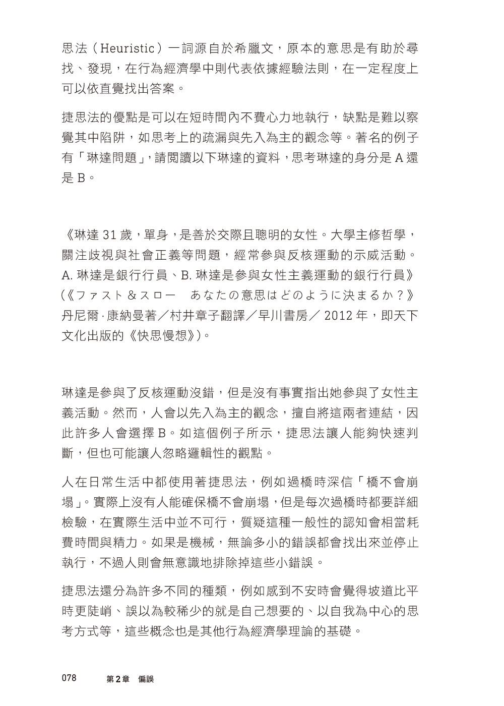 📖第一章|框架框架Ⅰ|連結使用者與企業01.追求方便性與效率的陷阱02.在商務上派上用場的行為經濟學03.站在使用者的角度思考框架Ⅱ|掌握認知與行為的特徵04.人與機器的差異05.認知的流程06.八個偏誤07.四個推力08.透過偏誤與推力改變行為📖第二章|偏誤偏誤Ⅰ|人會考量到其他人09.同儕效應(一起的話就能努力)10.社會偏好(體貼對方)11.互惠性(必須予以回報)12.空想性錯視(臉的力量)13.權威(強化上下關係意識)偏誤Ⅱ|人會受到周遭的影響14.從眾效應(排隊心理)15.羊群效應(少數派的不安)16.奈許均衡(互惠關係)17.稀少性(快失去就更想要)18.社會證明(希望能有所依靠)19.旁觀者效應(每個人都視而不見)偏誤Ⅲ|人會依時間改變認知20.捷思法(捷徑思考)21.現時偏誤(現在才重要)22.正常化偏誤(厭惡改變)23.回想偏誤(自圓其說)24.人為推進效應(有進度就會更有幹勁)25.峰終定律(結果好就一切都好)偏誤Ⅳ|人會意識到距離26.稟賦效應(自己擁有的最好)27.DIY效應(過度高估與自己有關的事物)28.MAYA理論(先進程度與熟悉度)29.碰觸效應(觸摸是王道)30.確認偏誤(寬以待己的習性)31. 懷舊(懷舊行銷)偏誤Ⅴ|人會依條件改變選擇32.展望理論(規避損失)33.過度辯證效應(報酬與幹勁)34.賭徒謬誤(下次肯定會)35.心理抗拒(對「不可以」的反彈)偏誤Ⅵ|人會依框架理解36.安慰劑效應(病由心生)37.整數效應(概略分類思考)38.選擇的悖論(選項太多則無法選擇)39.錨定效應與促發效應(順序很重要)40.框架效應(表達方式決定結果)偏誤Ⅶ|人會依情緒反應41.友好(喜好則寬容)42.欺騙(每個人都想輕鬆)43.半夜的情書(一時衝動而後悔)44.遊戲化(遊戲與努力)偏誤Ⅷ|人會受制於決定45.一致性(與固執連結)46.沈沒成本(「可惜」的圈套)47.認知失調(自我洗腦)📖第三章|推力推力Ⅰ|理解推力48.推力的結構49.推力的框架推力Ⅱ|讓使用者展開行動50.預設值(無意識地誘導)51.機關(自然地誘導)52.標籤(有目的地誘導)53.誘因(以報酬誘導)推力Ⅲ|設計商品與服務54.文字55.視覺56.實體57.畫面操作58.場合與服務59.商務策略60.心態