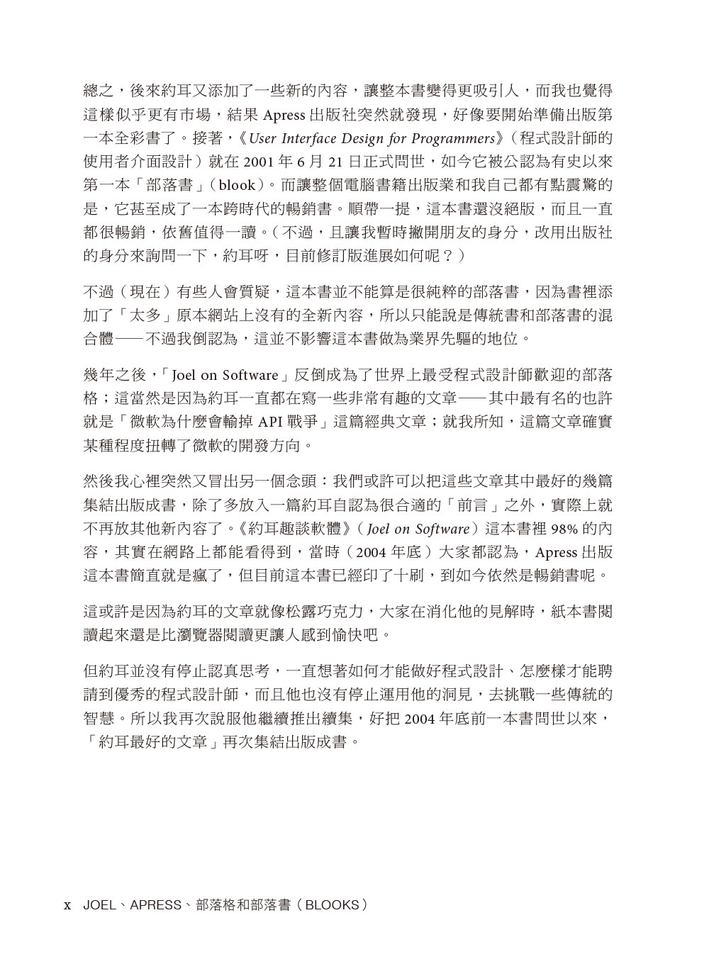 JOEL、APRESS、部落格和部落書(BLOOKS)作者簡介Part Ⅰ 人的管理Chapter 1 我的「比爾蓋茲」審查會初體驗Chapter 2 尋找真正優秀的開發者Chapter 3 開發者實戰指南Chapter 4 三種管理法(簡介)Chapter 5 軍事管理法—命令與管控Chapter 6 利誘管理法—101 經濟學Chapter 7 認同管理法Part Ⅱ 給未來程式設計師的建議Chapter 8 學校只教 Java 所帶來的危害Chapter 9 在耶魯大學的演講Chapter 10 給資訊科學系大學生的建議Part Ⅲ 設計的影響Chapter 11 字體平滑化、反鋸齒化、子像素渲染Chapter 12 寸土之間的競逐Chapter 13 大局在握的錯覺Chapter 14 選擇= 頭痛Chapter 15 重要的可不只使用性Chapter 16 用軟體來打造社群Part Ⅳ 大型專案的管理Chapter 17 火星人的耳機Chapter 18 為何微軟 OFFICE 檔案格式如此複雜?(以及一些變通做法)Chapter 19 想賺錢就別怕累Part Ⅴ 程式設計方面的建議Chapter 20 用證據來排時程Chapter 21 策略書 VIChapter 22 你所用的程式語言,能做到這些事嗎?Chapter 23 讓錯誤的程式碼看起來很不對勁Part Ⅵ 軟體事業的開展Chapter 24 《ERIC SINK 談軟體事業》的前言Chapter 25 《微型-ISV:從願景到現實》的前言Chapter 26 飆高音Part Ⅶ 軟體事業的經營Chapter 27 仿生辦公室Chapter 28 巧婦難為無米之炊Chapter 29 簡單Chapter 30 大掃除囉Chapter 31 執行 BETA 測試的十二大技巧Chapter 32 建立卓越客服的七個步驟Part Ⅷ 軟體的發佈Chapter 33 挑個出貨日吧Chapter 34 駱駝與橡皮鴨Part Ⅸ 軟體的修訂Chapter 35 五個為什麼Chapter 36 設好你的優先順序