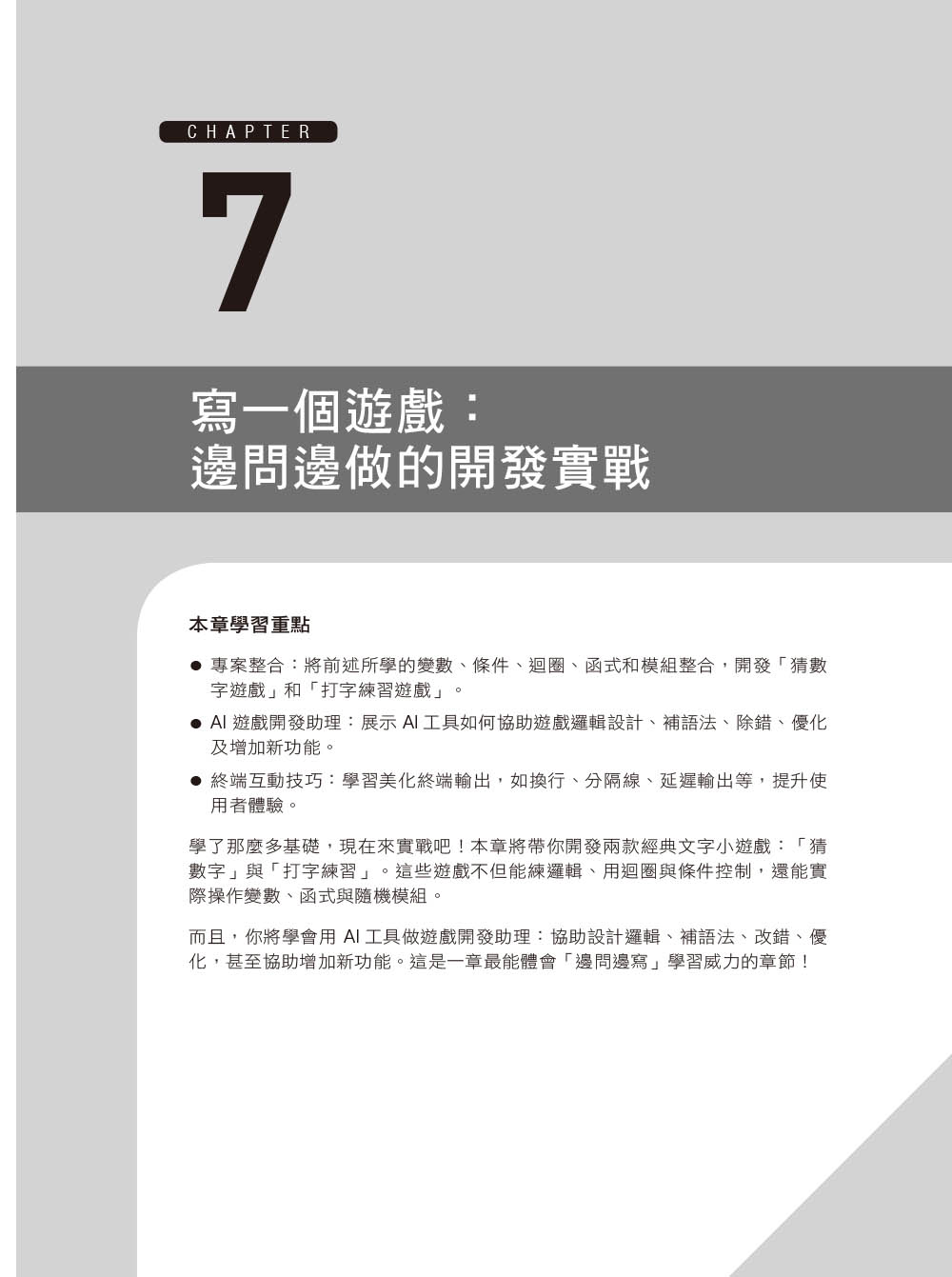 Chapter 1 AI學習革命:為什麼用AI學程式最有效?Chapter 2 快速安裝與設定環境Chapter 3 從變數開始學起:提問+嘗試+練習Chapter 4 寫程式的思維訓練:流程圖與邏輯圖解Chapter 5 迴圈與資料操作:讓程式重複做事Chapter 6 函式設計與模組使用Chapter 7 寫一個遊戲:邊問邊做的開發實戰Chapter 8 AI工具教你Debug:錯誤排除與優化Chapter 9 檔案處理與小型專案練習Chapter 10 做出有畫面的程式:簡易GUI入門Chapter 11 自動化簡單任務:用pyautogui控制滑鼠與鍵盤Chapter 12 自我挑戰專案:你也能做出小工具Chapter 13 用AI突破APCS:2025新版實戰準備Chapter 14 用AI突破APCS:程式識讀(觀念題)這樣練Chapter 15 用AI突破APCS:程式實作這樣寫Chapter 16 用AI寫Python程式Appendix A AI輔助工具整理