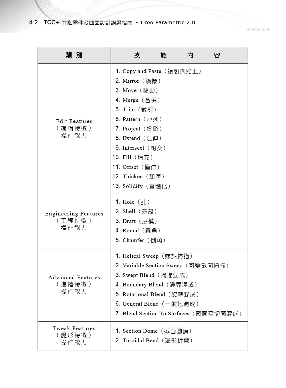 第一章 TQC+ 專業設計人才認證說明1-1 TQC+ 專業設計人才認證介紹 1-2 TQC+ 專業設計人才認證內容 1-3 TQC+ 專業設計人才認證優勢 1-4 企業採用TQC+ 證照的三大利益1-5 如何參加TQC+ 考試第二章 領域及科目說明2-1 領域介紹-工程設計領域說明 2-2 進階零件及曲面設計認證說明 第三章 範例題目練習系統安裝及操作說明3-1 範例題目練習系統安裝流程 3-2 範例題目練習系統操作程序 第四章 進階零件及曲面設計範例題目 4-1 操作題技能規範及分類範例題目 4-14-1-1 第一類:進階零件及曲面設計綜合應用(一)4-1-2 第二類:進階零件及曲面設計綜合應用(二) 4-1-3 第三類:進階零件及曲面設計綜合應用(三) 4-1-4 第四類:進階零件及曲面設計綜合應用(四) 4-1-5 第五類:進階零件及曲面設計綜合應用(五) 4-2 操作題範例題目答案及誤差範圍一覽表 第五章 測驗系統操作說明5-1 TQC+ 認證測驗系統-Client端程式安裝流程 5-2 程式權限及使用者帳戶設定 5-3 測驗操作程序範例 第六章 範例試卷範例試卷編號:EA2-0001範例試卷編號:EA2-0002範例試卷編號:EA2-0003範例試卷標準答案附錄TQC+ 專業設計人才認證簡章問題反應表讀者回函