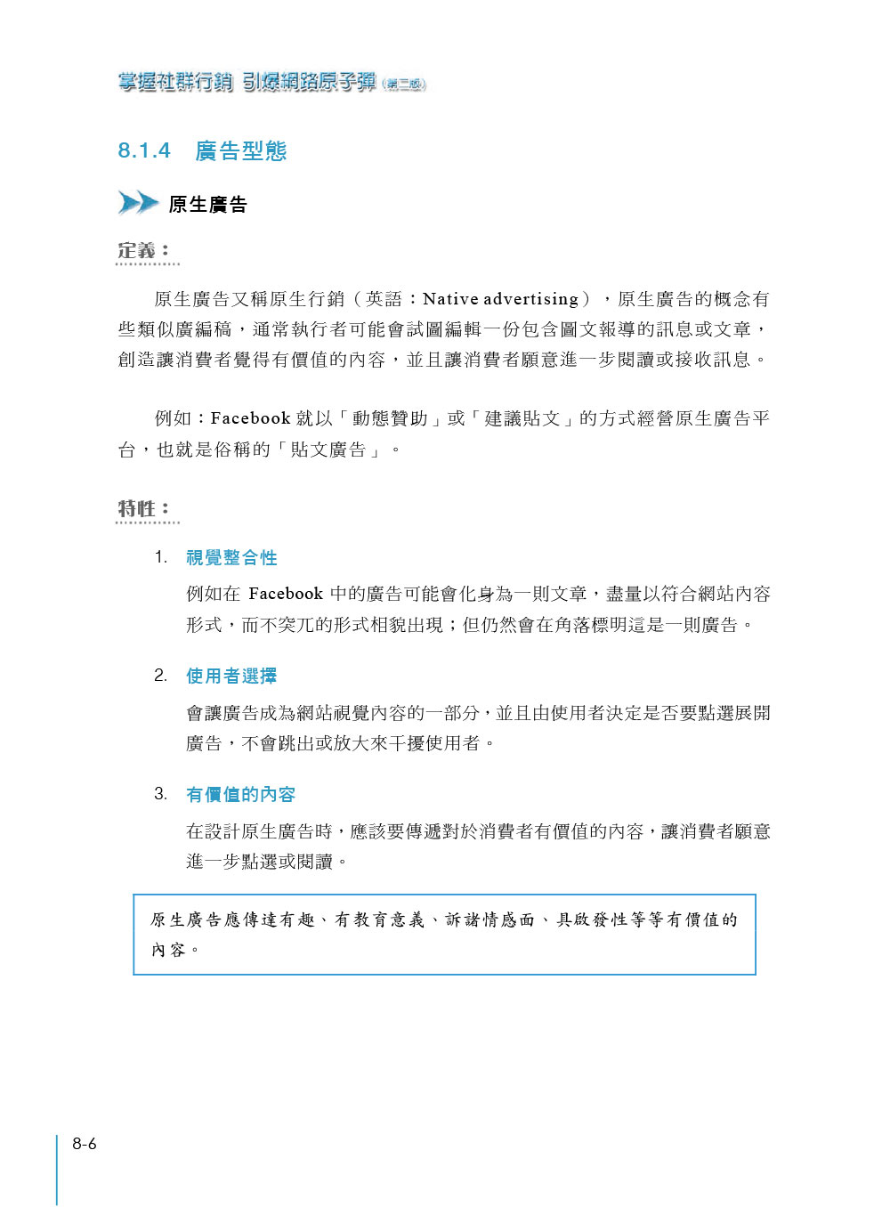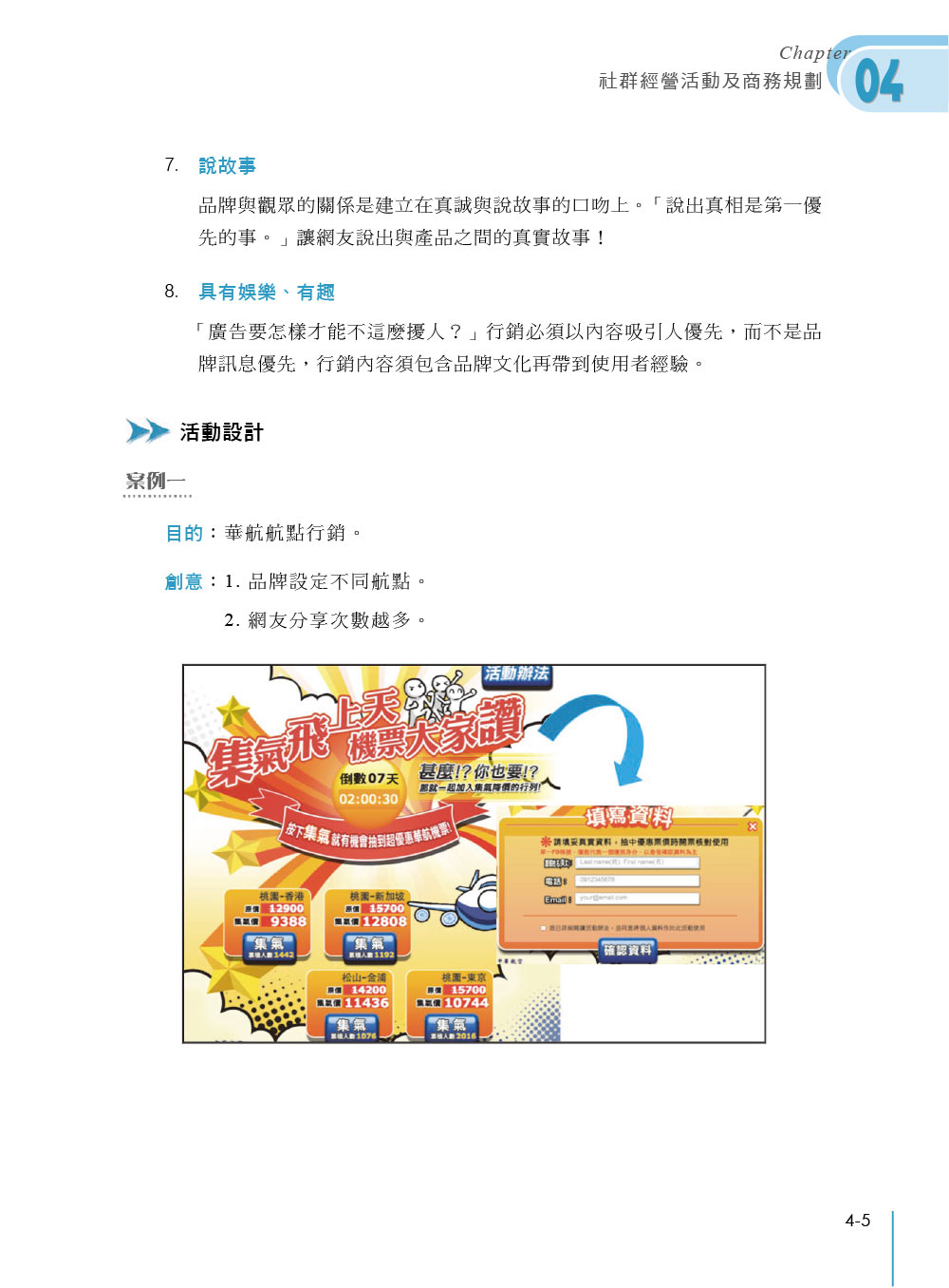 Chapter 01 社群定義、發展及應用1-1 社群定義 1-2 發展及應用 案例分享與說明Chapter 02 平台介紹、法規及倫理2-1 平台介紹 2-2 法規及倫理 Chapter 03 社群經營概要及內容規劃3-1 社群經營概要 3-2 社群內容規劃 案例分享與說明 Chapter 04 社群經營活動及商務規劃4-1 社群活動規劃 4-2 社群商務規劃 Chapter 05 社群媒體操作特性5-1 社群媒體特性 Chapter 06 自媒體行銷6-1 自媒體行銷 案例分享與說明 Chapter 07 口碑行銷7-1 口碑行銷案例分享與說明Chapter 08 社群媒體廣告8-1 社群廣告Chapter 09 社群數據分析工具與關鍵指標9-1 數據分析與工具 9-2 社群關鍵指標案例分享與說明 Chapter 10 社群網路分析與優化10-1 社群網絡分析 10-2 優化分析調整