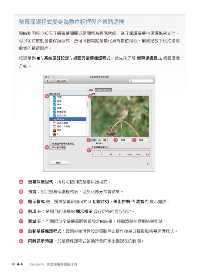 chapter 01 Hello!Mac 我愛蘋果咬一口chapter 02 掌握手勢與滑鼠鍵盤chapter 03 熟悉 Mac OS X 第一步 chapter 04 佈置專屬的使用環境chapter 05 全方位的視窗操控chapter 06 Finder 有效管理檔案文件chapter 07 Launchpad‧Spotlight 應用chapter 08 文件輸入編輯與列印chapter 09 Safari 暢遊全球網頁chapter 10 Mac App Store 軟體商店chapter 11 Mail 電子郵件收發管理chapter 12 iCal 行事曆掌握工作與約會chapter 13 通訊錄整理連絡人資訊chapter 14 iChat‧FaceTime 與好友線上聊天chapter 15 iTunes 享受影音播放與管理chapter 16 QuickTime Player 與 DVD 播放程式chapter 17 iPhoto 瀏覽×編修相片好簡單chapter 18 iMovie 擷取×剪輯擁有創意影片chapter 19 GarageBand 音樂創作chapter 20 iCloud 雲端同步chapter 21 Boot Camp 建立雙系統