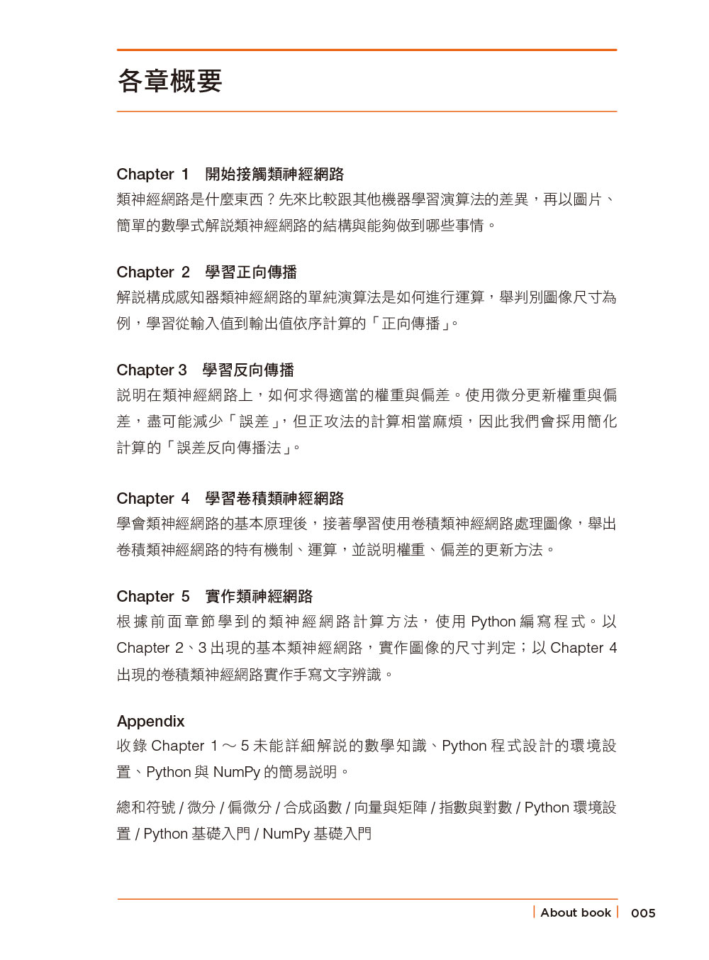 Chapter 1|開始接觸類神經網路類神經網路是什麼東西?先來比較跟其他機器學習演算法的差異,再以圖片、簡單的數學式解說類神經網路的結構與能夠做到哪些事情。Chapter 2|學習正向傳播解說構成感知器類神經網路的單純演算法是如何進行運算,舉判別圖像尺寸為例,學習從輸入值到輸出值依序計算的「正向傳播」。Chapter 3|學習反向傳播說明在類神經網路上,如何求得適當的權重與偏差。使用微分更新權重與偏差,盡可能減少「誤差」,但正攻法的計算相當麻煩,因此我們會採用簡化計算的「誤差反向傳播法」。Chapter 4|學習卷積類神經網路學會類神經網路的基本原理後,接著學習使用卷積類神經網路處理圖像,舉出卷積類神經網路的特有機制、運算,並說明權重、偏差的更新方法。Chapter 5|實作類神經網路根據前面章節學到的類神經網路計算方法, 使用Python編寫程式。以Chapter 2、3 出現的基本類神經網路,實作圖像的尺寸判定;以Chapter 4出現的卷積類神經網路實作手寫文字辨識。Appendix收錄Chapter 1 ∼ 5未能詳細解說的數學知識、Python程式設計的環境設置、Python與NumPy的簡易說明。