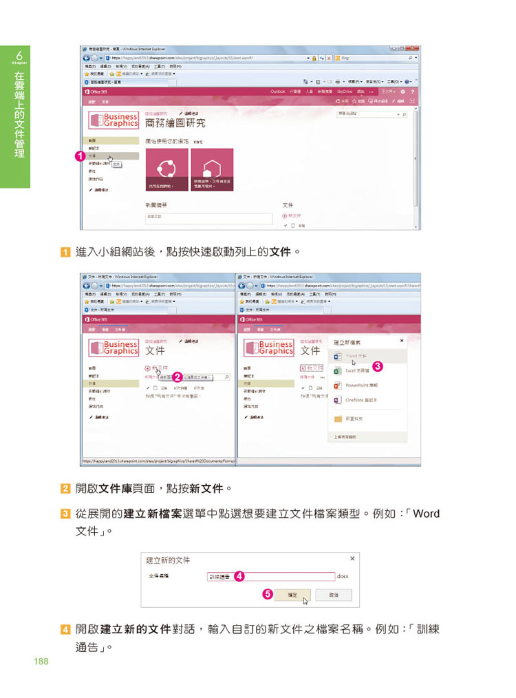 Chapter 1 改變世界的運轉Chapter 2 開始您的Office 365Chapter 3 管理Office 365帳號Chapter 4 Office 365的群組網站Chapter 5 在SharePoint Online建立小組網站Chapter 6 在雲端上的文件管理Chapter 7 整合SkyDrive與Office 2013 Web AppsChapter 8 Mobile行動裝置與Office 365 Chapter 9 在Office 365進行組織與郵件的管理Chapter 10 活用Microsoft Lync Online