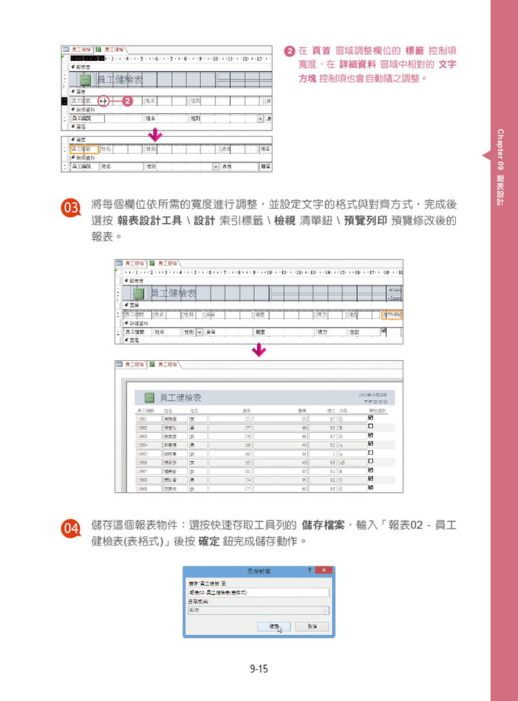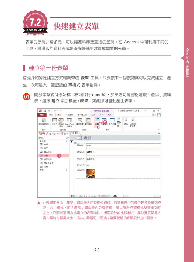 01 認識資料庫與 ACCESS1.1 資料庫的簡介1.2 認識 Access1.3 進入 Access1.4 查詢線上輔助說明02 資料庫建立2.1 規劃新的資料庫2.2 建立新的資料庫2.3 用範本建立資料庫2.4 關閉或開啟資料庫2.5 備份資料庫03 資料表設計與建立3.1 建立新的資料表3.2 規劃資料表結構3.3 資料的輸入3.4 資料表的編修3.5 資料表的列印3.6 資料表的匯入與連結04 資料記錄的尋找、取代、排序、篩選4.1 認識相關工具鈕4.2 資料的尋找4.3 資料的取代 4.4 資料的排序4.5 資料的篩選05 查詢與分析資料5.1 認識查詢物件5.2 簡單查詢精靈5.3 選取查詢5.4 合計查詢5.5 參數查詢 .5.6 交叉資料表查詢5.7 尋找重複資料查詢5.8 尋找不吻合資料查詢5.9 動作查詢06 關聯式資料庫6.1 認識關聯式資料庫6.2 資料表關聯的設定6.3 建立永久性關聯資料表6.4 關聯的應用 07 表單建立7.1 認識表單7.2 快速建立表單7.3 用表單精靈建立表單7.4 表單資料的新增和應用7.5 表單的檢視模式7.6 調整表單版面配置7.7 用空白表單建立表單7.8 建立多資料表的表單08 表單進階設計8.1 認識表單控制項8.2 設計表單資料8.3 設計表單首/尾8.4 設計頁首/頁尾8.5 設計命令按鈕8.6 設計表單格式、色彩與背景圖8.7 設計子表單09 報表設計9.1 認識報表9.2 使用報表精靈9.3 使用自動產生報表9.4 加入相關運算的設計 9.5 製作標籤9.6 製作明信片10 結合巨集的應用10.1 建立第一個巨集10.2 串連多個巨集指令10.3 建立執行巨集的按鈕10.4 用巨集設計資料庫起始畫面與選單10.5 常用巨集指令表11 與 Office 及其他軟體整合應用11.1 匯出及匯入 Access 資料11.2 套用 Word 合併列印12 提昇技能的資料庫工具12.1 將物件快速另存為表單或報表12.2 將物件另存為 PDF 文件12.3 搜尋資料庫中的物件項目12.4 轉換資料庫檔案格式 (2002-2003)12.5 指定預設檔案格式與資料夾路徑12.6 設定「最近」清單的數目12.7 設定文件視窗為重疊視窗 12.8 自動校正功能12.9 使用線上範本建立資料庫12.10 隱藏與取消隱藏物件、群組12.11 壓縮與修復資料庫檔案 12.12 設定與取消資料庫密碼13 Access 雲端應用13.1 將資料庫檔案存放於 SkyDrive 雲端空間13.2 Office 365 與 Web App 建立雲端資料庫