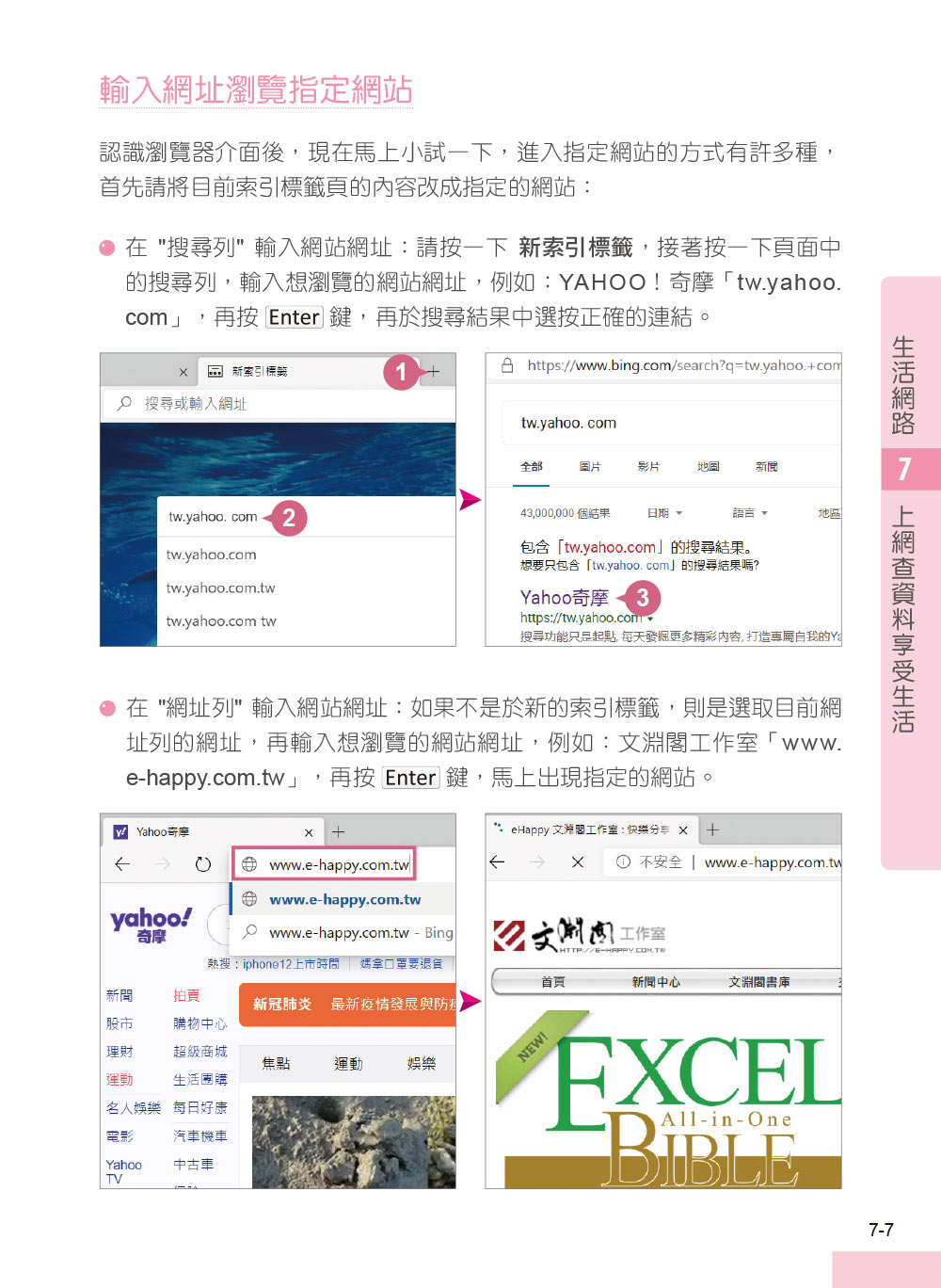 輕鬆開始第1章-電腦基礎認識1.1 生活中電腦可以做什麼? 1.2 電腦設備基本組成 1.3 如何維護電腦? 1.4 操作電腦的正確姿勢 第2章-學習電腦操作2.1 開啟電腦進入畫面 2.2 滑鼠與鍵盤的操作 2.3 介紹 Windows 10 桌面 2.4 視窗管理 2.5 正確關閉電腦 第3章-掌握工作環境3.1 擁有自己的開始畫面 3.2 擁有自己的桌面環境 3.3 相片變成桌面背景 3.4 使用螢幕保護裝置 3.5 放大畫面文字讓閱讀更方便 3.6 控制音量大小 3.7 調整日期與時間 3.8 用左手也可以操作滑鼠 3.9 整理開始畫面與工作列 第4章-整理電腦文件與檔案4.1 認識檔案總管 4.2 查看與排序檔案 4.3 檔案及資料夾的管理 4.4 尋找刪除後的檔案 4.5 壓縮檔案的大小 生活網路第5章-中英文打字好簡單5.1 學習打字前,先認識鍵盤! 5.2 鍵盤上我的手該如何擺? 5.3 輸入法切換及新增技巧 5.4 簡單易學ABC英文輸入法 5.5 ㄅㄆㄇㄈ注音輸入法 第6章-聆聽喜歡的音樂6.1 認識數位媒體播放器 6.2 播放CD歌曲 6.3 將喜愛的CD曲目存到電腦中第7章-上網查資料享受生活7.1 認識網際網路Internet 7.2 透過無線網路上網 7.3 透過瀏覽器暢遊全球資訊網 7.4 上網搜尋生活資訊 第8章-寫封電子郵件給朋友8.1 認識電子郵件 8.2 申請電子郵件 8.3 郵件的傳送與接收 8.4 郵件的回覆與轉寄 8.5 接收其他信箱內的郵件 8.6 建立連絡人資訊 第9章-用電腦看相片與編修9.1 各種傳輸線與讀取設備 9.2 讀入外接設備內的相片 9.3 瀏覽檢視相片檔案 9.4 裁切及旋轉編輯相片 9.5 到店家沖洗相片 文件簡報第10章-Word文書處理10.1 認識Word與開啟文件 10.2 文字的基本編修 10.3 插入日期與時間 10.4 儲存檔案 第11章-Word建立文件與表格11.1 開啟舊檔 11.2 套用文字格式 11.3 運用項目編號 11.4 套用文字藝術師 11.5 快速建立表格 11.6 圖片的插入與編輯 第12章-Word列印文件12.1 關於印表機 12.2 安裝印表機 12.3 文件版面設定 12.4 列印文件 第13章-PowerPoint相簿簡報設計13.1 進入PowerPoint 13.2 快速新增相簿簡報 13.3 設計相簿簡報首頁 13.4 為相簿簡報增添內容 13.5 設定簡報的動畫效果 13.6 設定相簿簡報換頁動作 13.7 將相簿簡報轉成影片檔 13.8 分享相簿簡報影片