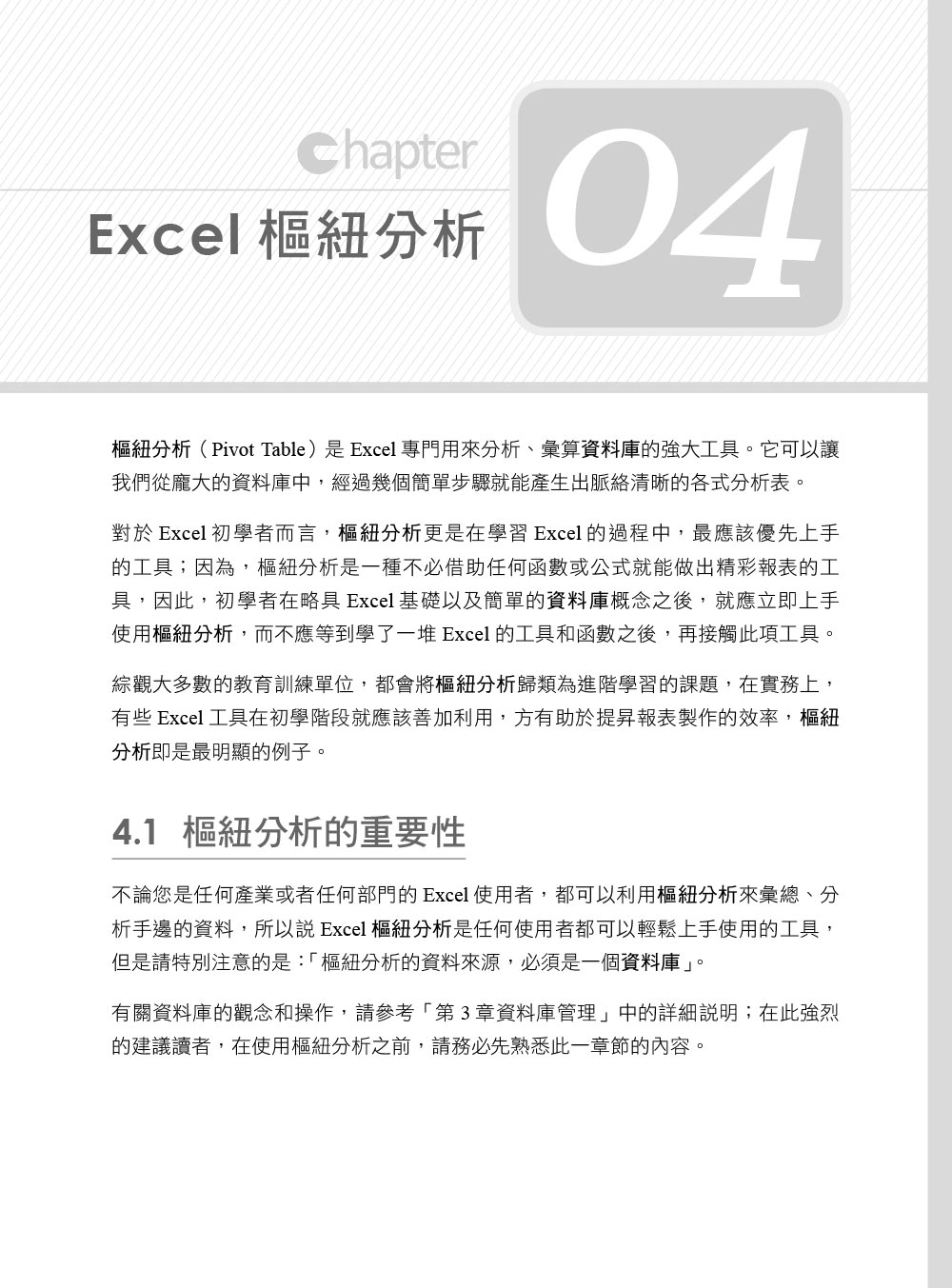 CH01 必須具備的觀念CH02 Excel 輸入資料的效率CH03 資料庫管理CH04 Excel 樞紐分析CH05 函數的效率CH06 重要內建工具的應用CH07 企業實務問題集