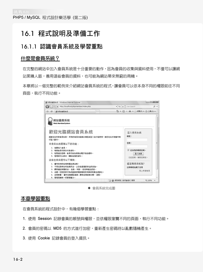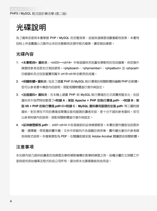入門概念篇第1章 認識 PHP 與 MySQL第2章 打造 PHP / MySQL 程式的執行環境語法基礎篇第3章 PHP 程式基礎語法第4章 程式流程控制第5章 函式的使用第6章 陣列的使用第7章 字串的使用第8章 日期時間的應用第9章 檔案的處理第10章 Cookie 與 Session第11章 物件導向程式設計資料庫應用篇第12章 MySQL 資料庫的使用與管理第13章 SQL 語法的使用第14章 PHP 與 MySQL 資料庫實例挑戰篇第15章 網路留言版的製作第16章 會員系統的製作第17章 網路相簿的製作第18章 購物車的製作