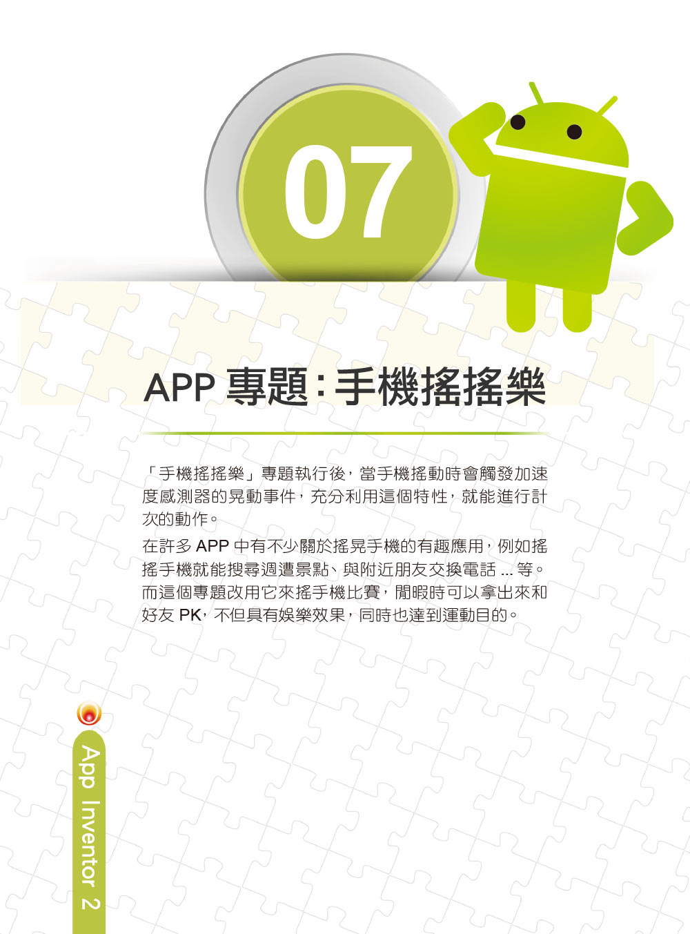 01 用拼塊拼出你的AppApp Inventor 2使用拼圖模式來組合程式,搭配好用的各式元件,即使完全未接觸過的程式設計者,也能開發功能強大的Android App。02 基本元件與運算基本元件除了能控管應用程式與使用者互動,並且經過精心安排介面元件,就能設計出賞心悅目的使用者介面。03 程式拼塊與流程控制判斷式能讓執行程式依情況不同而執行不同程式碼;迴圈能處理程式中重複的工作;陣列,能解決儲存大量同類型資料的問題。04 自訂程序及內建程序自訂程序及內建程序能將具有特定功能或經常使用的程式拼塊,撰寫成獨立的小單元。05 繪圖與動畫圖片精靈及球型精靈是App Inventor 2為動畫和遊戲所量身打造的元件,使用時必須配合畫布元件。06 APP專題:電子羅盤「電子羅盤」即是善用方向感測器元件的功能來製作一個真實可用的電子羅盤。07 APP專題:手機搖搖樂「手機搖搖樂」是利用手機搖動時觸發加速度感應器的晃動事件,進行計次的動作。08 APP專題:QR Code二維條碼「QR Code二維條碼」已經普及到日常生活中,在App Inventor 2的專題中可以很輕鬆加入或是讀取QR Code的功能。09 APP專題:哈囉!熊讚「哈囉!熊讚」是利用Web瀏覽器及Activity啟動器元件將網頁資料顯示於瀏覽器中,相關的基本資料、相片、影片及導航一應俱全。10 APP專題:心情塗鴉「心情塗鴉」可以在拍攝的相片上進行塗鴉,或是加上心情圖示,是相當有趣實用的範例。11 APP專題:英文語音測驗「英文語音測驗」 專題使用語音識別器元件及文字語音轉換器元件,設計選擇題式聽力測驗。12 APP專題:相片通訊錄「相片通訊錄」專題利用畫布元件直接照相後存入資料庫,再結合 電話撥號器元件及簡訊收發器元件,使用者點按相片就能打電話及發簡訊。13 APP專題:打磚塊「打磚塊」是利用基本的碰撞原理製作,若熟悉遊戲運作原理,要製作較複雜的打磚塊關卡也非難事。14 APP專題:滾球遊戲「滾球遊戲」專題最主要是以加速度感測器的加速被改變事件來控制球的滾動。15 APP專題:打雪怪遊戲「打雪怪遊戲」是以打地鼠遊戲架構為依據進行開發,但整個遊戲場景是在冰天雪地中,月夜裡雪人和雪怪會不斷出沒。
