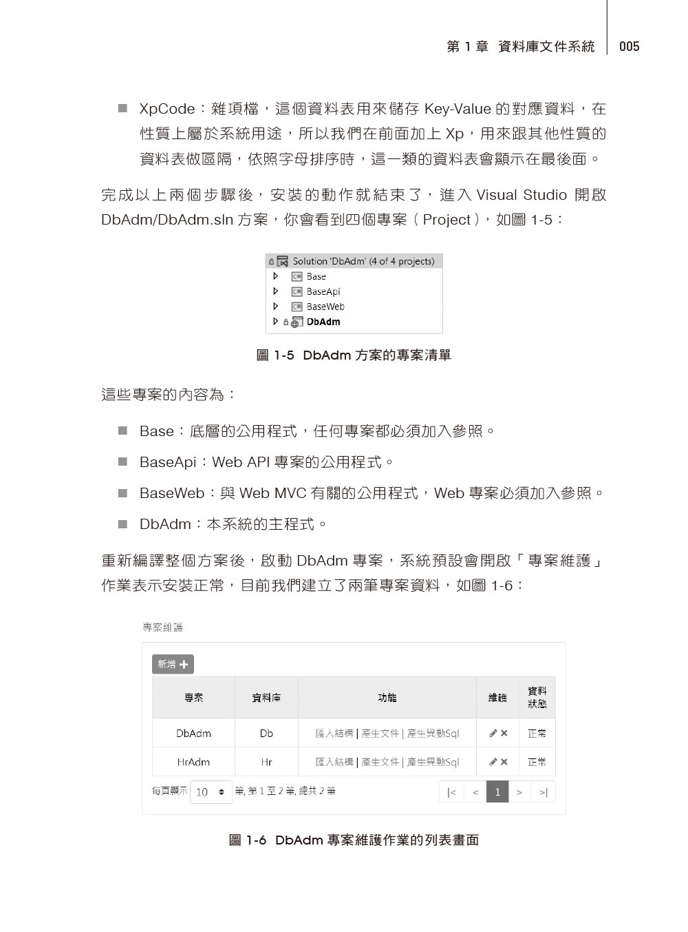 前言第 1 章 資料庫文件系統第 2 章 CRUD 列表畫面第 3 章 CRUD 編輯畫面第 4 章 人事管理系統第 5 章 CRUD 產生器第 6 章 開發環境設定第 7 章 主畫面第 8 章 自訂輸入欄位第 9 章 Word 套表第 10 章 匯出Excel第 11 章 從Excel 匯入第 12 章 簽核流程功能第 13 章 CMS 功能第 14 章 系統功能權限第 15 章 簡單報表第 16 章 多國語第 17 章 資料異動記錄第 18 章 公用程式 第 19 章 Log 與例外處理第 20 章 MantisBT 擴充系統