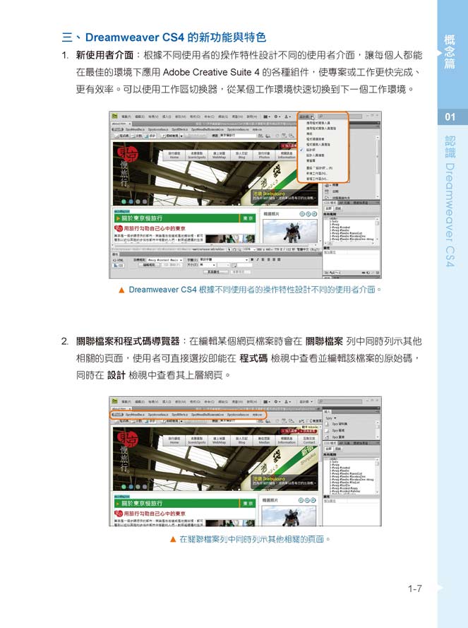 CH01 認識 Dreamweaver CS4CH02 東京出發,去旅行!--網站規劃的開始CH03 旅行網站簡介--網頁文字編輯與影像的使用CH04 旅行相關資訊--表格的使用CH05 旅行景點介紹--超連結的設定用CH06 旅人日記--CSS 樣式表的設計CH07 線上地圖--AP 元素的應用CH08 網路多媒體的應用CH09 旅人印象--頁框網站的製作CH10 互動交流你我他--表單的加入與設計CH11 快速建置專業版面--範本的應用CH12 上傳滿滿美麗回憶--網站的上傳與維護CH13 行為設定與擴充程式的應用CH14 Spry工具集與特效的使用CH15 旅遊互動留言版--網站程式的製作