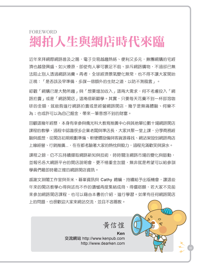 首部曲 《 面面觀-開店規劃及曝光》Chapter 1 網路開店面面觀1.1 網路創業自我檢測1.2 電子商務介紹1.3 開店方案選擇Chapter 2 開店企劃與新事業規劃2.1 選擇欲販售商品的考量2.2 網路商店的稅法 Q&A2.3 網店申請公司 Q&A2.4 網路開店新事業規劃問卷Chapter 3 開店設備選購指南3.1 網路開店基本設備3.2 網址申請3.3 網站空間3.4 網站製作3.5 金流方式3.6 物流方式3.7 自訂商店買賣規則3.8 商品攝影重要性與費用3.9 開店成本分析3.10 網路開店設備選購問卷Chapter 4 網站曝光與廣告行銷4.1 網站曝光的重要4.2 網路行銷的種類4.3 社群經營4.4 商品文案包裝、行銷手法與經驗分享二部曲《開店去 -網拍經營實戰》Chapter 5 前進雅虎奇摩拍賣5.1 網路拍賣狂潮來襲5.2 網路拍賣平台的選擇5.3 開通 Yahoo! 奇摩拍賣的賣家帳號5.4 Yahoo! 奇摩拍賣賣場簡介5.5 商品拍賣前的新手須知5.6 商品拍賣中的交易守則5.7 商品拍賣後的注意事項5.8 Yahoo! 奇摩拍賣相關收費總整理Chapter 6 進軍露天拍賣6.1 揮戈露天拍賣開分店6.2 露天拍賣基本介紹6.3 申請露天拍賣帳號6.4 刊登網拍商品之前6.5 在露天拍賣刊登商品6.6 商品拍賣中的交易守則6.7 商品拍賣的進階設定6.8 好用的露天拍賣小工具6.9 露天拍賣收費與客服Chapter 7 網拍陷阱與問題集7.1 網拍買家常見陷阱7.2 網拍賣家常見陷阱7.3 網拍常見問題集三部曲《來架站–你的專屬購物網》Chapter 8 免費網站購物車軟體8.1 自行架設網站的優缺點8.2 免費的購物車軟體8.3 架設系統環境與前置作業準備8.4 架設網站所需程式與軟體8.5 選擇網站主機架設軟體8.6 網站主機架設軟體安裝實務Chapter 9 架設專屬的購物網站9.1 下載軟體前的注意事項9.2 osCommerce 購物車安裝9.3 osCommerce 後台管理9.4 其他修改Chapter 10 網站虛擬主機架設實務10.1 擁有一個網站空間10.2 網站移植大作戰10.3 網站上線後的巡禮10.4 網路商店上線結語