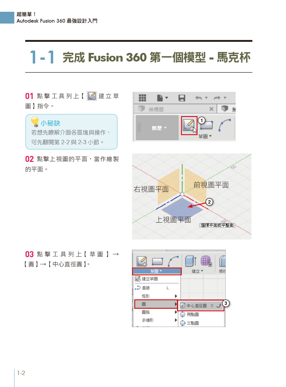 01 革命性的產品設計軟體Fusion 360Fusion 360是一套綜合許多3D軟體功能的強力設計軟體,一開始將直接透過簡單的馬克杯範例,讓讀者實際體驗Fusion 360的設計模式,對Fusion 360有初步的認識。1-1 完成Fusion360第一個模型-馬克杯02 Fusion 360介面與基礎操作Fusion 360設計成品可儲存在雲端或是電腦,儲存在雲端的專案資料夾皆可與夥伴或同事分享,方便在雲端上共同編輯。本章節要介紹如何管理專案與Fusion 360的介面操作。2-1 專案建立、匯入與匯出 2-2 介面介紹 2-3 基礎操作 2-4 模擬練習03 2D 草圖繪製與編輯建模的基本觀念就是繪製出2D輪廓,由2D輪廓建立3D模型,而2D輪廓必須繪製在「草圖」中,畫出正確的草圖是3D建模的基礎,本章節將介紹在草圖中繪製與編輯輪廓的方法。3-1 草圖繪製3-2 草圖編輯3-3 移動、旋轉3-4 標註與約束3-5 模擬練習04 視覺化建模模組介紹實用的特徵指令,諸如「擠出」、「迴轉」、「混成」、「掃掠」等,Fusion 360擁有歷程紀錄,所有的草圖、特徵都可回去再編輯,修改特徵參數,即可檢視結果,是參數化的設計模式。4-1 擠出4-2 迴轉 4-3 掃掠4-4 混成4-5 加強肋 4-6 格狀加強肋 4-7 孔與螺紋4-8 矩形陣列 4-9 環形陣列 4-10 路徑陣列 4-11 模擬練習05 所見即所得的模型編輯模式繪製2D輪廓需要修剪線條,繪製3D模型也需要編輯外型,來製作更符合模型需求的細節。本章將介紹「圓角」、「薄殼」、「合併」等編輯功能,來增加模型細節,設計變更更是建模重要的一環。5-1 建模指令 5-2 薄殼 5-3 拔模 5-4 縮放 5-5 移動與複製 5-6 合併實體 5-7 修改時間軸5-8 分割面與分割實體 5-9 模擬練習06 靈活的零件組合方式零件與零件組裝需要利用各種拘束條件來連接,兩個零件之間才會產生關聯性,本章節以機械手臂的範例介紹各種拘束的操作以及效果。6-1 在組件模式中建立元件6-2 聯接 6-3 圓柱聯接 6-4 剛性聯接 6-5 迴轉聯接 6-6 球聯接 6-7 銷槽 6-8 編輯聯接限制1 6-9 編輯聯接限制2 6-10 模擬練習07 以T-Spline 的創新建模法(高跟涼鞋)Fusion 360比其他軟體強大的特點之一,就是擁有類似3ds Max軟體的強大造型編輯功能T-Spline,T-Spline 是一種全新的曲面建模技術,可分別編輯模型的頂點、邊、面,做移動、旋轉、縮放的動作,直覺的調整產品外型。本章節以高跟鞋為範例,介紹T-Spline的曲面建模方式。7-1 T-Spline曲面的介紹 7-2 高跟鞋 T-Spline造型建模7-3 Shoes橋接 7-4 Shoes鞋跟調整 7-5 Shoes鞋墊 7-6 Shoes材質08 綜合範例:曲線瓶Fusion 360的建模方式非常多元, 本章節將以傳統3D軟體的建模方式為主,完成一個曲線瓶的範例。有涉獵過Creo、SolidWorks等3D軟體的使用者,會非常容易上手,感覺親切好學習。8-1 曲線瓶09 綜合範例:公仔(類似Maya模式)本章節將製作公仔範例,主要使用造型建模模式,利用前視圖、側視圖的設計圖面輔助,完成一隻小熊公仔。9-1 公仔參考圖 9-2 公仔頭部製作9-3 公仔身體製作9-4 小熊臉部表情9-5 小熊尾巴 9-6 細節製作 9-7 小熊材質10 綜合範例:鋁合金輪圈(類似AutoCAD、Inventor組件模式) 本章節使用傳統的曲面建模模式,製作汽車的鋁合金輪圈。本書所有範例將展現Fusion 360各種風格的建模方式,可根據產品來選擇建模,或交互使用不同方式建模,Fusion 360可說是集合多種3D 軟體的優點於一身。10-1 輪圈 10-2 輪圈外部造型迴轉成型 10-3 外部造型陣列10-4 螺絲孔與裝飾面10-5 彩現與材質11 快速製作真實渲染效果本章節將介紹快速渲染流程,在如何給予模型多種材質、修改材質的方法、以及環境設定等有更詳盡的介紹。本書在其他章節的範例渲染,也可隨時以本章節輔助學習。11-1 外觀設定 11-2 彩現設定12 工業設計的共通語言-工程圖要表現完成的零件或組件的加工方法或尺寸,可使用設計師與加工師傅的共同語言-工程圖面,工程圖可顯示模型的三視圖、細部放大圖、剖面圖、等角圖⋯等表現方式,且與模型之間是互相關聯的,修改模型,工程圖隨時更新,不必擔心圖面與模型會有尺寸不符的情況。12-1 工程圖 12-2 模擬練習13 Fusion 360其他應用針對建模以外的重要功能來介紹,包括產品的真實材料設定、干涉檢驗與應力分析,這些功能除了實際運用外,也是Autodesk原廠認證考題的重點之一。13-1 物理材料變更13-2 檢驗 13-3 模擬練習Appendix A 快速轉換3D列印格式