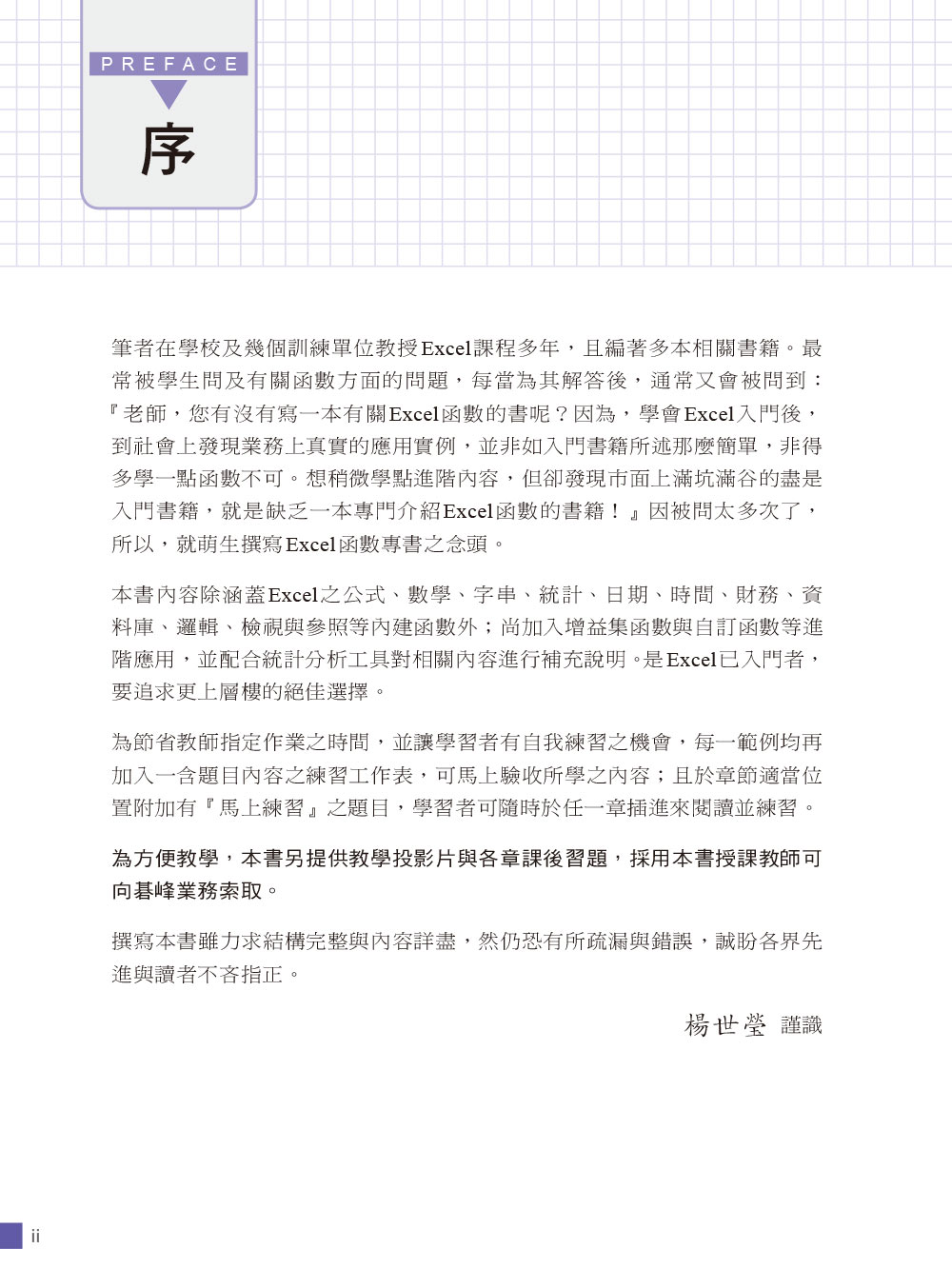 兼具『方便查詢』及『跟著範例學習快速上手』雙重優勢。除提供方便查詢的檢索目錄外,更將函數類別重新調整,搭配實務的範例解說,絕對能讓您在短時間內熟悉Excel函數的使用技巧。是Excel入門者追求更上層樓的絕佳選擇!