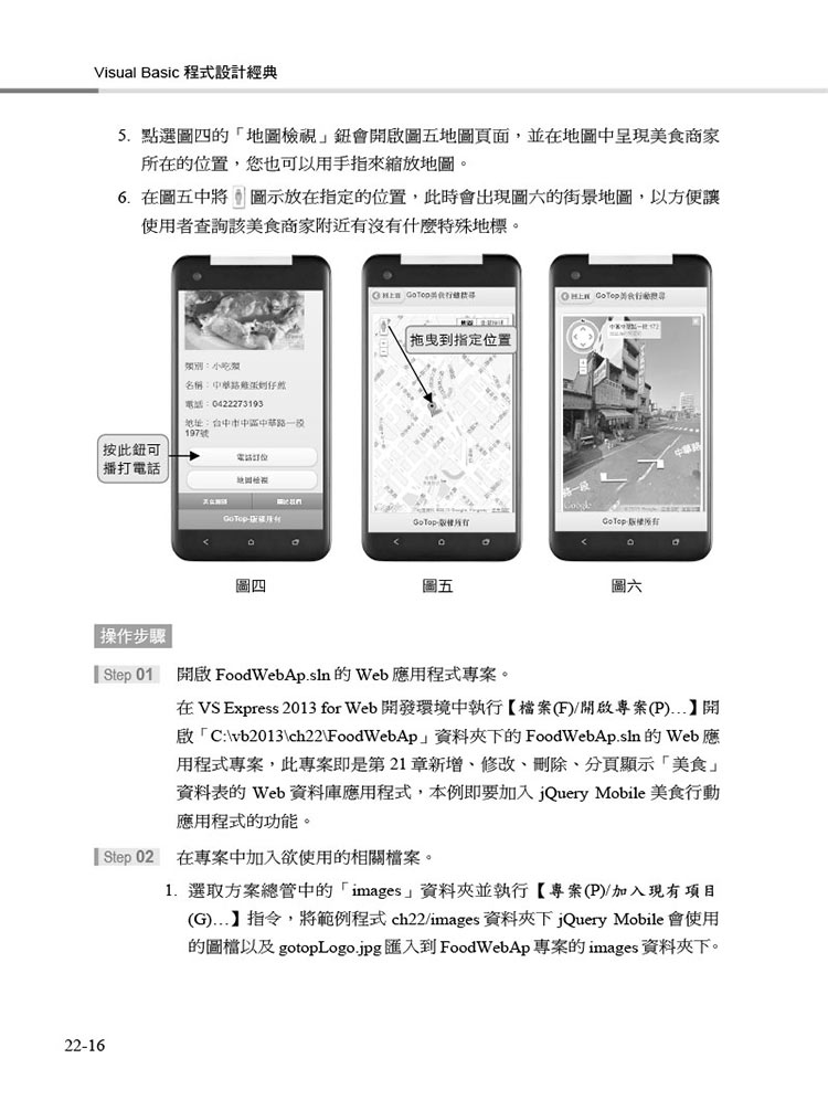 chapter 01 .NET Framework 與 Visual Studio 2013 介紹chapter 02 主控台應用程式與資料型別chapter 03 流程控制chapter 04 陣列與方法chapter 05 視窗應用程式chapter 06 物件與類別chapter 07 繼承、多型、介面chapter 08 列舉器與集合chapter 09 例外與檔案處理chapter 10 表單與基礎控制項chapter 11 常用控制項(一)chapter 12 常用控制項(二)chapter 13 豐富文字方塊與工具列chapter 14 滑鼠鍵盤與共用事件chapter 15 對話方塊與多表單應用chapter 16 ADO.NET與資料工具chapter 17 ADO.NET資料庫存取與交易處理chapter 18 資料繫結與預存程序的使用chapter 19 讀寫 XML文件chapter 20 LINQ資料查詢技術chapter 21 ASP.NET Web應用程式chapter 22 jQuery Mobile跨平台行動裝置應用程式開發chapter 23 分散式應用程式設計chapter 24 Windows Phone應用程式appendix A VB常用類別