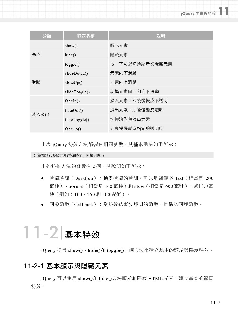 PART 1 JavaScript 語言ch01 HTML 與 JavaScript 的基礎ch02 JavaScript 變數與運算子ch03 JavaScript 流程控制ch04 JavaScript 函數與物件ch05 JavaScript 內建物件PART 2 DOM 物件模型與 CSSch06 DOM 物件模型ch07 CSS 層級式樣式表PART 3 jQuery 函數庫ch08 jQuery 基礎與開發人員工具ch09 jQuery 選擇器與 CSS 和 DOMch10 jQuery 事件處理PART 4 jQuery 特效、使用介面與 Ajaxch11 jQuery 動畫與特效ch12 jQuery 選單、巡覽與標籤頁ch13 jQuery 表格與表單ch14 jQuery Mobile、JSON 和 AjaxPART 5 伺服端 JavaScript - Node.jsch15 伺服端 Node.js 入門實務ch16 Node.js+Express.js 網路應用程式開發PART 6 Node.js+Node-RED 物聯網應用開發ch17 使用 Johnny-Five 玩翻 Arduino 開發板ch18 Node-RED 物聯網 IoT 應用開發appendix A jQuery 與 jQuery Mobile 的網路資源appendix B jQuery 外掛程式(PDF 電子書)