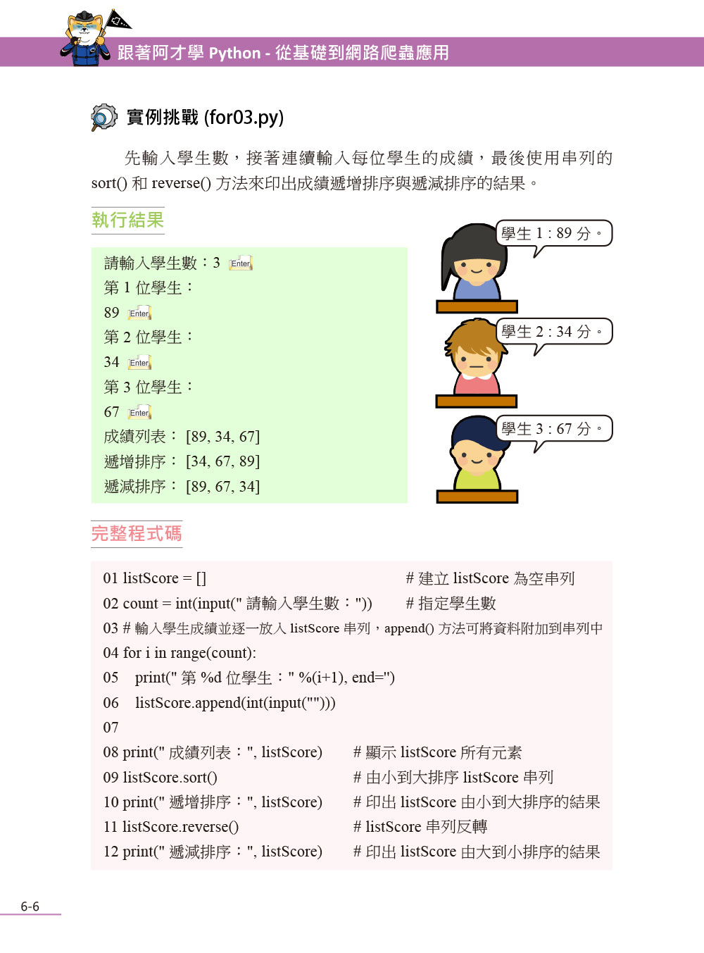 Ch1 Python簡介與開發環境建置Ch2 變數資料型別與運算Ch3 輸出入函式Ch4 選擇結構Ch5 串列的應用Ch6 重複結構Ch7 函式的應用Ch8 元組與字典的應用Ch9 目錄檔案管理與例外處理Ch10 存取csvCh11 存取JSON資料Ch12 網路爬蟲擷取網頁資訊Ch13 網路爬蟲資料讀取案例實作
