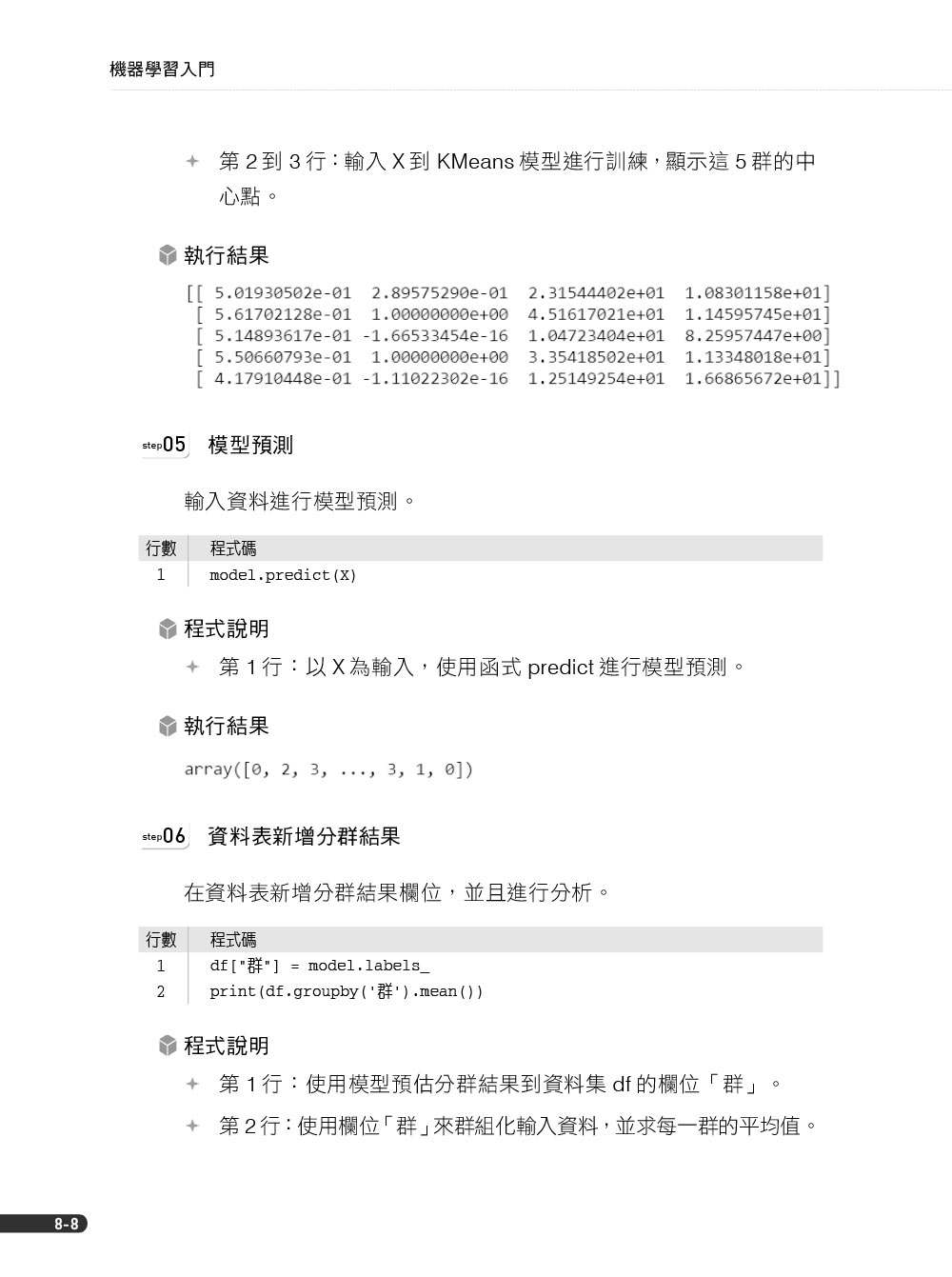 chapter 1 開發環境介紹 1-1 安裝 Anaconda 1-2 使用 conda 啟用虛擬環境與安裝套件 1-3 在 Windows 啟用 Jupyter Notebook 1-4 Jupyter Notebook 的快速鍵 1-5 使用 Google Colab 執行 Python 程式chapter 2 Pandas 與 Numpy 簡介 2-1 Pandas 的 Series 2-2 Pandas 的 DataFrame 2-3 NumPy的重要功能chapter 3 線性迴歸 3-1 線性迴歸的運作原理 3-2 使用 sklearn 實作線性迴歸 3-3 線性迴歸模型實作範例 3-4 習題chapter 4 邏輯迴歸 4-1 邏輯迴歸的運作原理 4-2 使用 sklearn 實作邏輯迴歸 4-3 邏輯迴歸模型實作範例 4-4 習題chapter 5 決策樹 5-1 決策樹的運作過程 5-2 使用 sklearn 實作決策樹 5-3 決策樹模型實作範例 5-4 習題chapter 6 K-近鄰演算法 6-1 K-近鄰演算法的運作過程 6-2 使用 sklearn 實作 K-近鄰演算法 6-3 K-近鄰演算法模型實作範例 6-4 習題chapter 7 支援向量機 7-1 支援向量機演算法的運作過程 7-2 使用 sklearn 實作支援向量機 7-3 支援向量機模型實作範例 7-4 習題chapter 8 K-means 分群 8-1 K-means 分群的運作過程 8-2 使用 sklearn 實作 K-means 分群 8-3 使用 K-means 分群實作範例 8-4 習題chapter 9 階層式分群 9-1 階層式分群的運作過程 9-2 使用 sklearn 實作階層式分群 9-3 階層式分群實作範例 9-4 習題chapter 10 神經網路 10-1 神經網路的神經元 10-2 線性可分割與非線性可分割 10-3 神經網路的運作 10-4 使用 keras 實作神經網路 10-5 激勵函式 10-6 Loss 函式 10-7 學習率與優化器 10-8 使用手寫數字辨識為範例 10-9 習題chapter 11 卷積神經網路 11-1 卷積神經網路模型運作原理 11-2 使用 keras 實作卷積神經網路 11-3 卷積神經網路實作範例 11-4 習題chapter 12 使用 Cifar-10 圖庫訓練卷積神經網路 12-1 使用卷積神經網路辨識 Cifar-10 圖庫 12-2 使用更複雜的卷積神經網路辨識 Cifar-10 圖庫 12-3 習題chapter 13 預先訓練的模型 13-1 使用 VGG16 辨識圖片 13-2 顯示 VGG16 模型的組成 13-3 習題chapter 14 中文文字分析與中文語音相關功能實作 14-1 使用 Spacy 分析中文句子 14-2 使用 Spacy 找出最相似的五個新聞標題 14-3 實作語音辨識與文字轉語音功能 14-4 習題