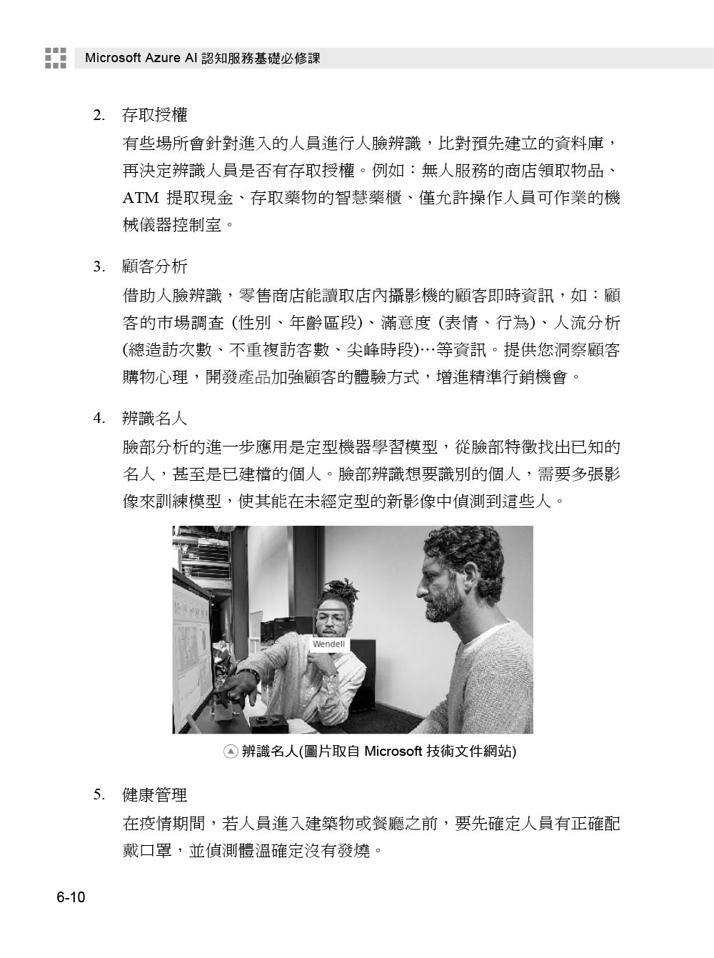 第1章 Microsoft Azure AI基本概念:使用人工智慧的開始 1.1 人工智慧簡介 1.2 Microsoft Azure AI簡介 1.3 模擬試題第2章 負責任的AI 2.1 AI造成的道德和社會問題 2.2 了解負責任的AI 2.3 申請Azure帳戶 2.4 模擬試題第3章 探索電腦視覺(一)電腦視覺分析 3.1 電腦視覺簡介 3.2 電腦視覺服務 3.3 開發環境與必要條件 3.4 電腦視覺影像描述開發實作 3.5 模擬試題第4章 探索電腦視覺(二)OCR與表單辨識器 4.1 光學字元識別 (OCR) 4.2 Azure電腦視覺認知服務讀取文字 4.3 表單辨識器 4.4 電腦視覺讀取影像文字開發實作 4.5 模擬試題第5章 探索電腦視覺(三)自訂視覺 5.1 自訂視覺簡介 5.2 影像分類 5.3 在Azure使用影像分類 5.4 物件偵測 5.5 在Azure使用物件偵測 5.6 自訂視覺範例實作 5.7 模擬試題第6章 探索電腦視覺(四)臉部服務 6.1 臉部服務簡介 6.2 臉部偵測 6.3 臉部分析 6.4 臉部辨識 6.5 臉部服務開發實作 6.6 模擬試題第7章 探索自然語言處理(一)文字分析 7.1 自然語言處理簡介 7.2 自然語言處理 7.3 使用語言服務分析文字 7.4 文字分析開發實作 7.5 模擬試題第8章 探索自然語言處理(二)對話式AI 8.1 對話式AI簡介 8.2 問題與解答對話系統 8.3 使用對話語言理解建立語言模型 8.4 使用對話語言理解 8.5 Azure 機器人服務 8.6 Language Understanding開發實作 8.7 模擬試題第9章 探索自然語言處理(三)語音與翻譯 9.1 語音辨識與語音合成 9.2 語音辨識與語音合成 9.3 文字翻譯 9.4 翻譯服務功能介紹 9.5 文字翻譯開發實作 9.6 模擬試題第10章 Azure機器學習基本原理 10.1 機器學習簡介 10.2 機器學習的工作流程 10.3 機器學習的模型 10.4 分類模型 10.5 迴歸模型 10.6 叢集模型 10.7 模擬試題第11章 Azure機器學習實作 11.1 Azure機器學習服務簡介 11.2 Azure機器學習設計工具的工作流程 11.3 使用Azure機器學習設計工具建立模型 11.4 模擬試題附錄A MCF AI-900人工智慧基礎國際認證模擬試題
