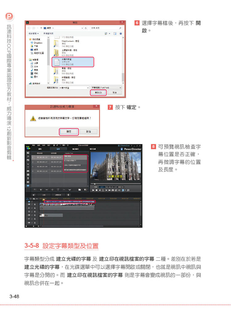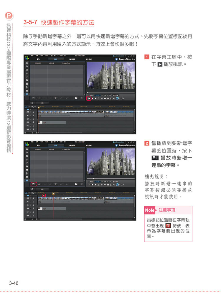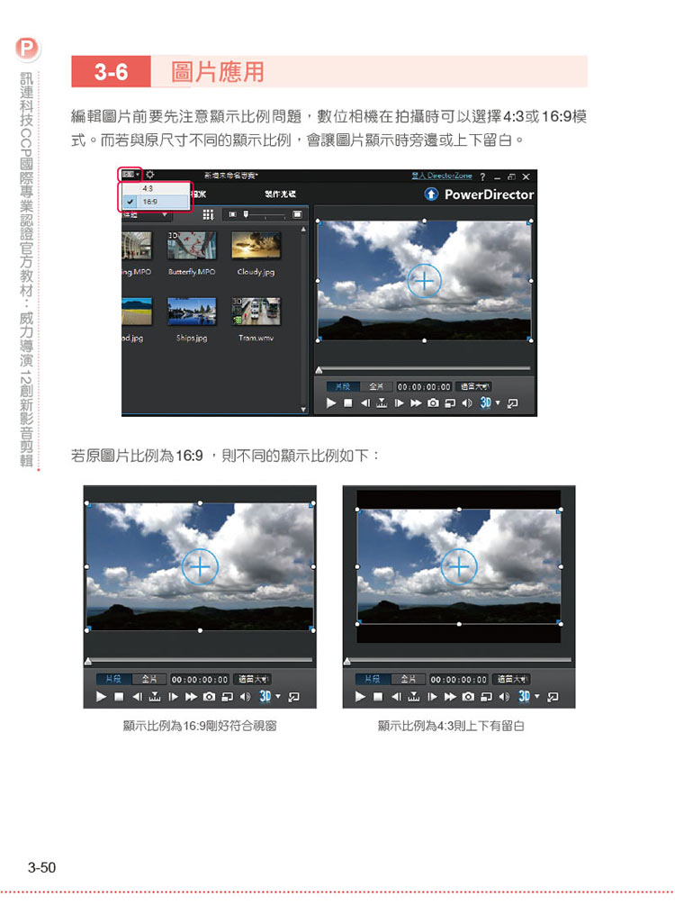 00 認識訊連科技 CCP 國際專業認證0-1 CCP 國際專業認證簡介0-2 認證優勢0-3 認證科目 0-4 認證簡介0-5 參考認證管道01 視訊基本概念1-1 視訊原理1-2 線性剪輯及非線性剪輯1-3 電視播放傳輸系統規格1-4 畫面更新率(Frame rate)1-5 交錯掃描與循序掃描1-6 高解析度視訊-Full HD 1-7 4K 解析度(4K resolution)1-8 長寬比例1-9 3D 視訊模擬試題02 影音專案製作流程2-1 影音專案製作流程2-2 創意發想2-3 拍攝視訊 2-4 素材收集2-5 匯入素材2-6 編輯工作區2-7 軌道操作2-8 專案操作模擬試題03 視訊剪輯基本後製篇3-1 視訊剪輯3-2 視訊修正及技巧應用 3-3 預覽視訊3-4 2D 轉3D 素材 3-5 文字應用3-6 圖片應用模擬試題04 影片剪輯技巧應用篇4-1 轉場特效工房4-2 特效工房4-3 炫粒工房4-4 子母畫面物件工房模擬試題05 視訊音訊處理篇5-1 音訊處理5-2 多機剪輯設計師5-3 創意主題設計師 模擬試題06 視訊剪輯輸出篇6-1 視訊格式說明6-2 輸出視訊 6-3 燒錄成光碟模擬試題