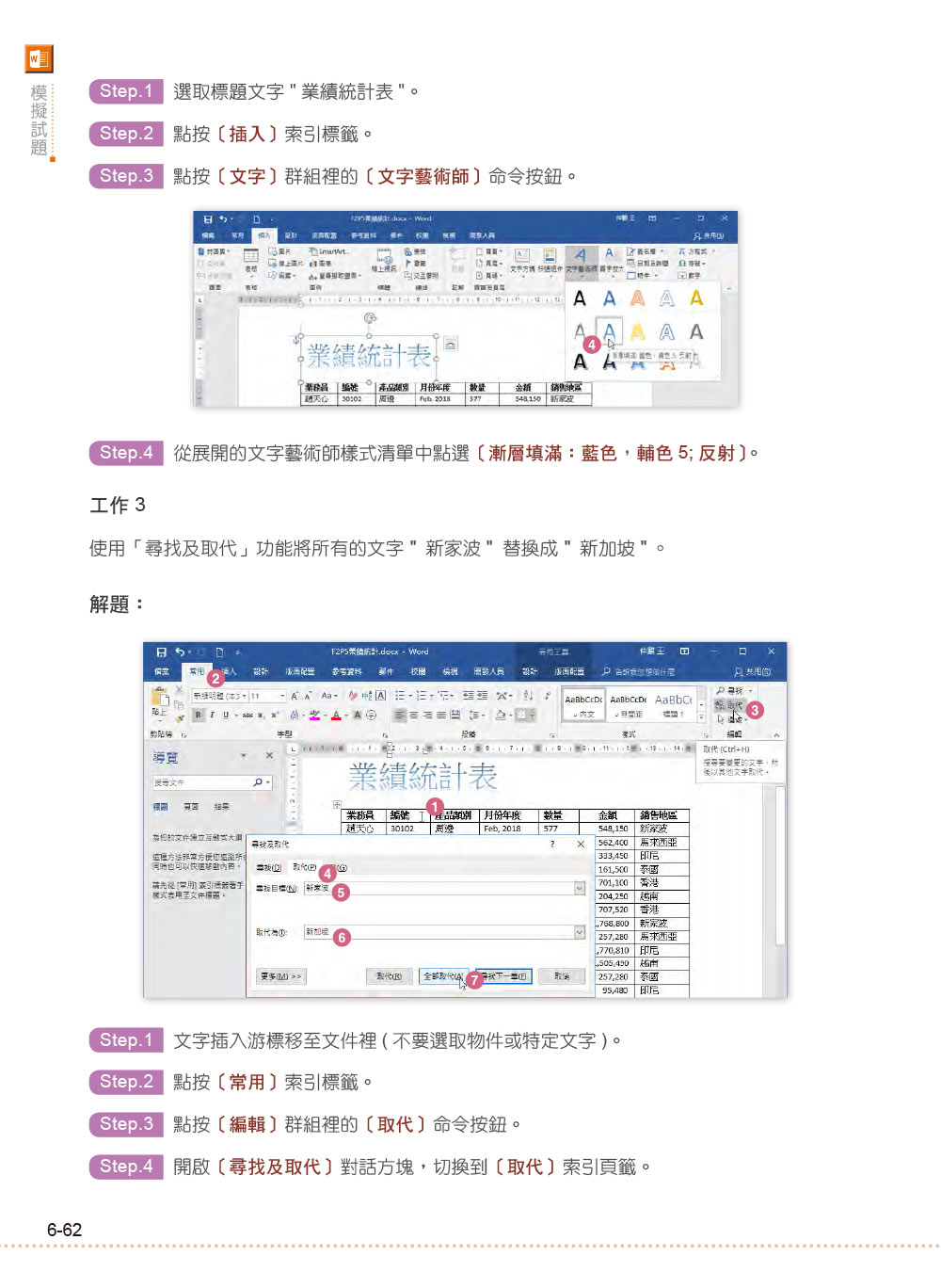 Chapter 00 MOS國際認證簡介Chapter 01 格式化文字與段落 1.1 編輯與格式化文字1.2 格式化段落1.3 項目符號與編號的應用1.4 文字方塊的應用Chapter 02 插入與格式化表格 2.1 在文件中插入表格2.2 格式化表格2.3 設定表格替代文字Chapter 03 版面配置與分隔設定 3.1 插入分頁符號3.2 插入分欄符號3.3 插入分節符號Chapter 04 格式化圖例與文字藝術師 4.1 SmartArt的應用4.2 插入並格式化圖片4.3 在文件中插入文字藝術師或圖案Chapter 05 可重複使用的版面內容 5.1 文件佈景主題5.2 插人文件封面頁5.3 頁面框線與浮水印5.4 書籤的應用5.5 插人物件-合併文件內容5.6 編輯頁首與頁尾5.6 插入頁碼Chapter 06 參考資料的應用 6.1 引文與書目6.2 文件目錄Chapter 07 文件的安全與管理 7.1 設定文件摘要資訊7.2 檢查文件.Chapter 08 模擬試題