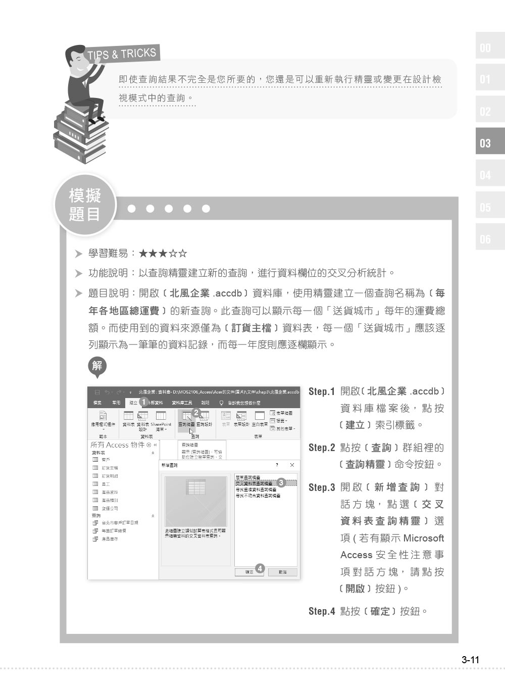 Chapter 00 MOS國際認證簡介Chapter 01 創建及管理資料庫1-1創建並修改資料庫1-2管理關係和密鑰1-3瀏覽資料庫1-4保護和維護資料庫1-5列印和匯出資料Chapter 02 建立表格2-1創建表格2-2管理表格2-3管理表中的記錄2-4創建和修改欄位Chapter 03 創建查詢3-1創建一個查詢3-2修改查詢3-3在查詢中創建計算欄位和分組Chapter 04 創建表單4-1 創建一個表單4-2 設定表單控件4-3 格式化表單Chapter 05創建報告5-1創建一個報告5-2設定報告控件5-3格式化報告Chapter 06 模擬試題